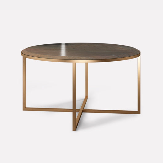 The juxtaposition of the round- shaped top with its crossed straight base seamlessly welded and finished demonstrates the skilled craftsmanship of our metal artisans. The top is a precious marble perfectly beveled and carved, letting the beauty of material being the design protagonist of this piece.