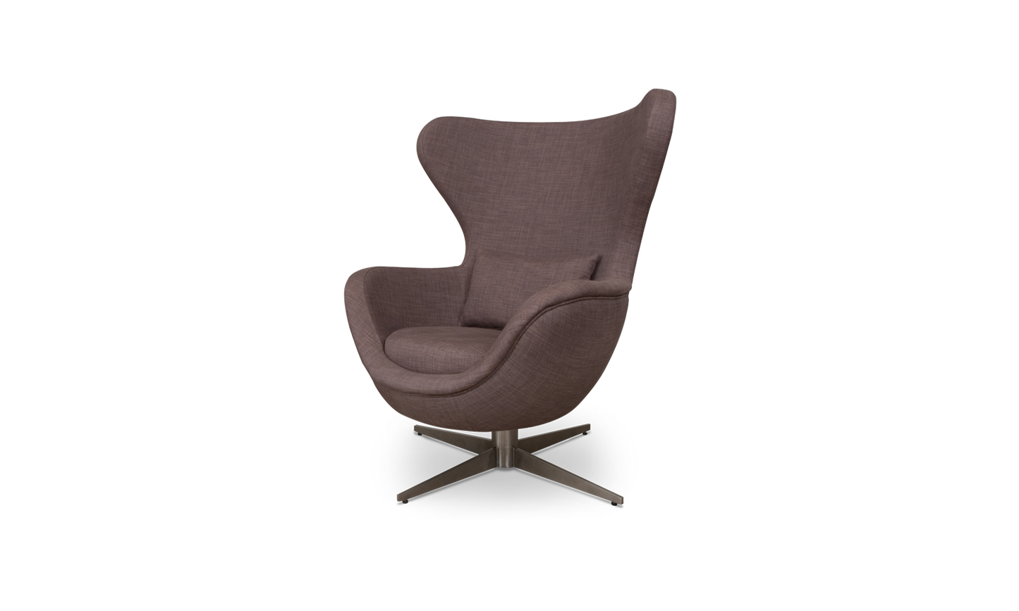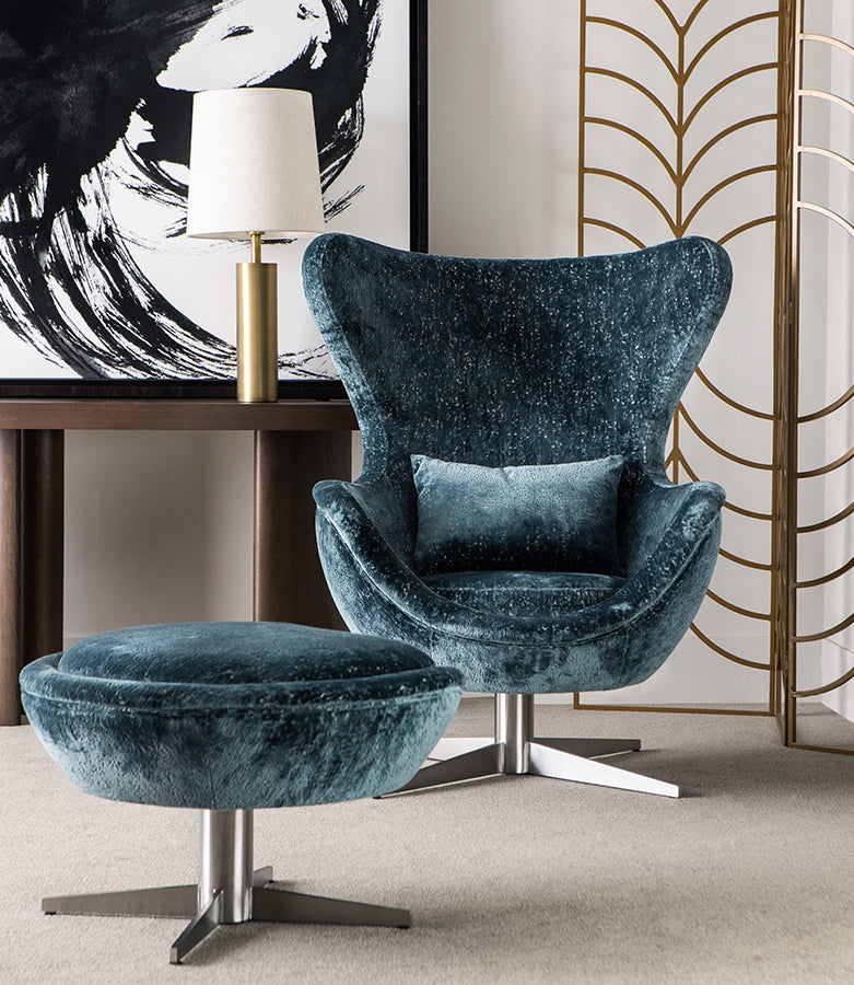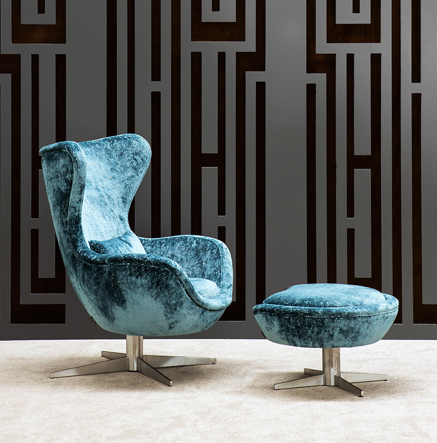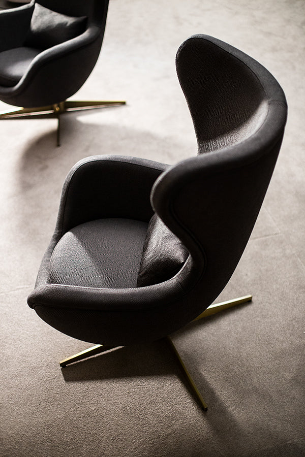 The Ida lounge chair is available in two sizes with FR foam and a solid wood structure and a wood base in standard finishes. Standard finishes or a rotating metal base in either brushed stainless steel or brass effect. It is available in Cat. I-VI fabrics and leathers (Armchair: 5,0m / un. // Ottoman: 1,6m / un.) with the possibility of client fabric. Ottoman sold separately.