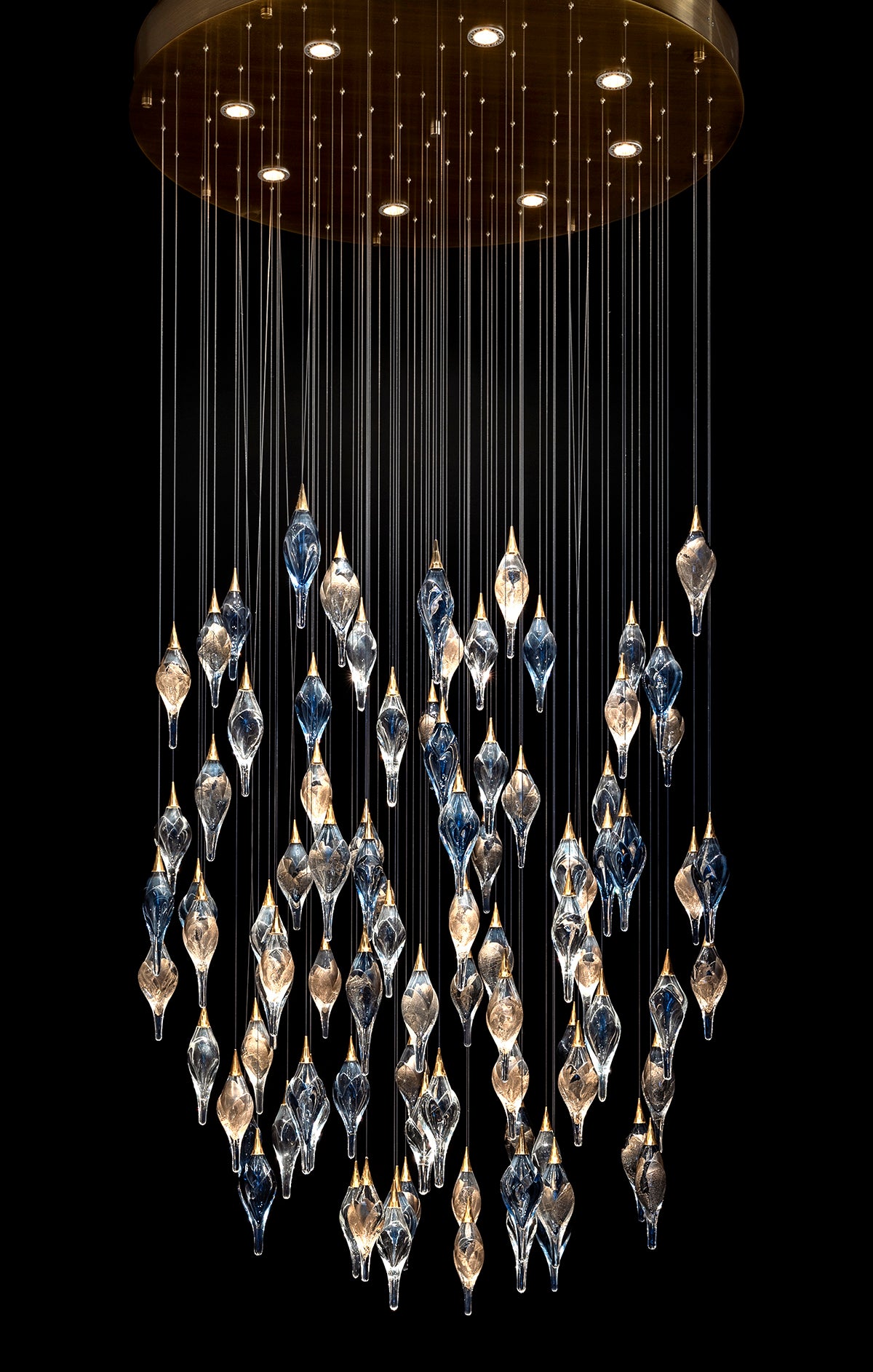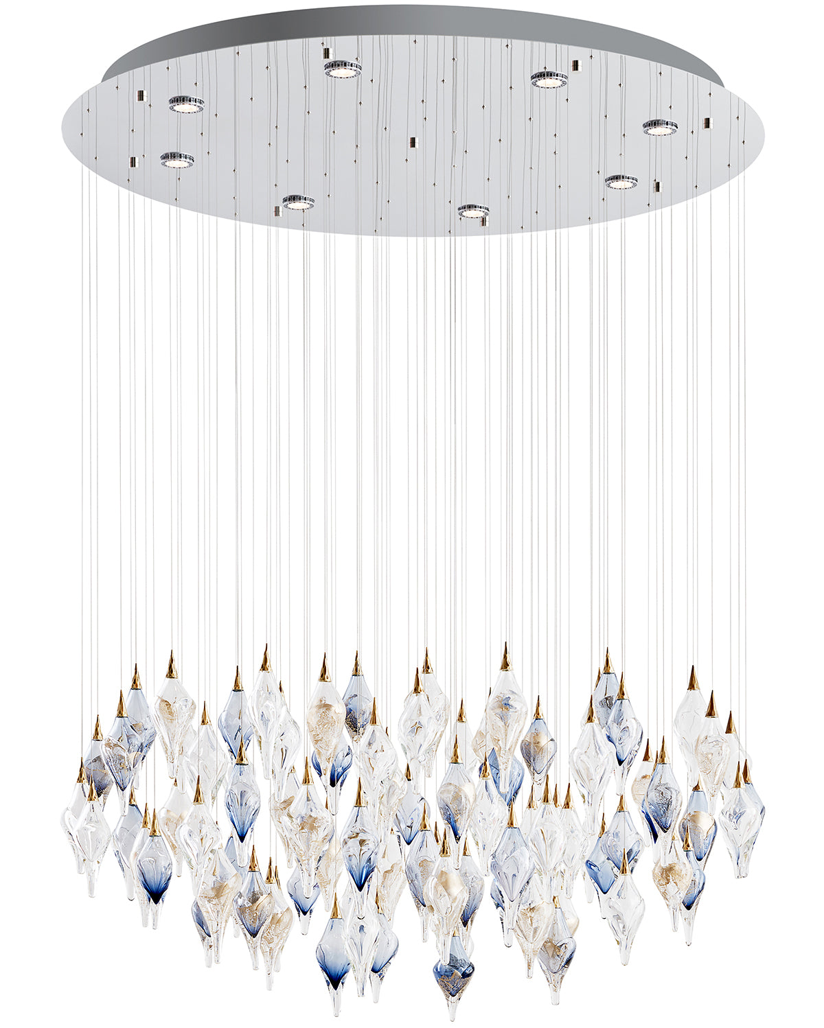 This shimmering jewel of a chandelier is made using layered blown glass that is stretched into elongated diamonds. The offset arrangement creates a sparking, striking form in space.