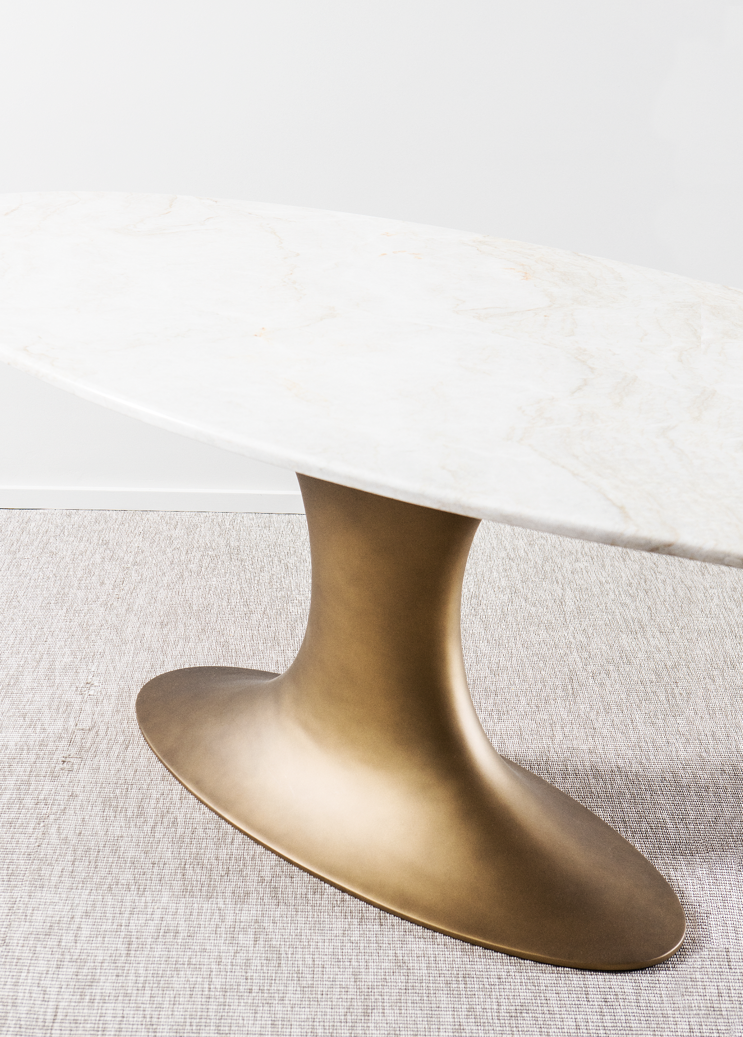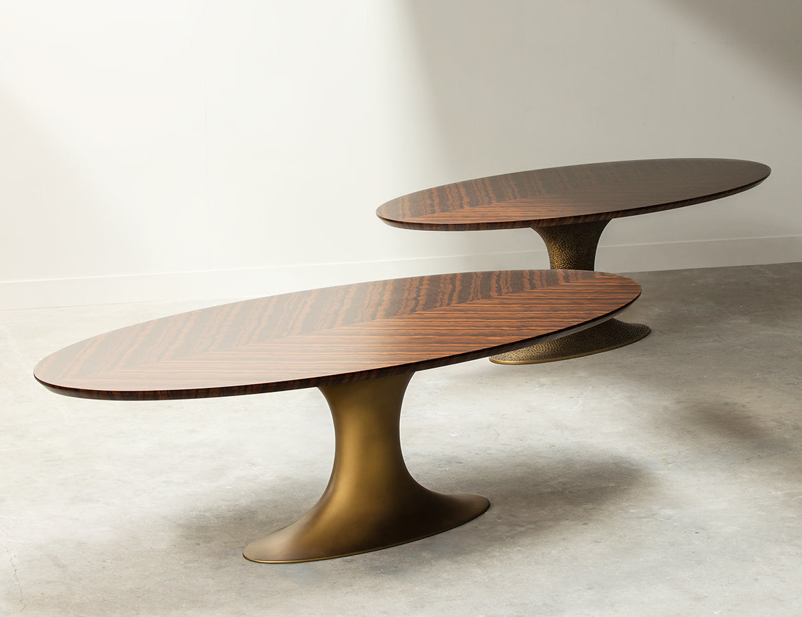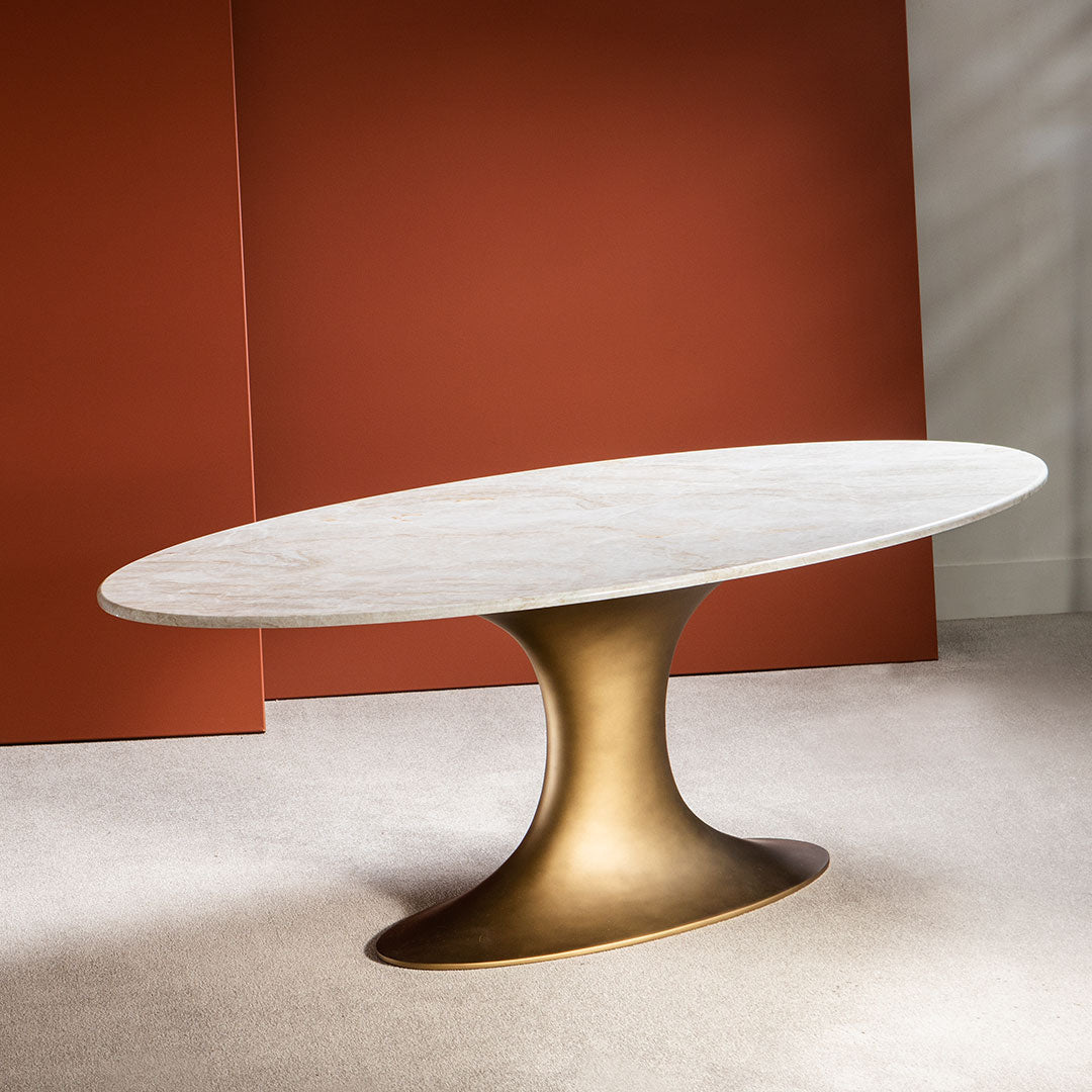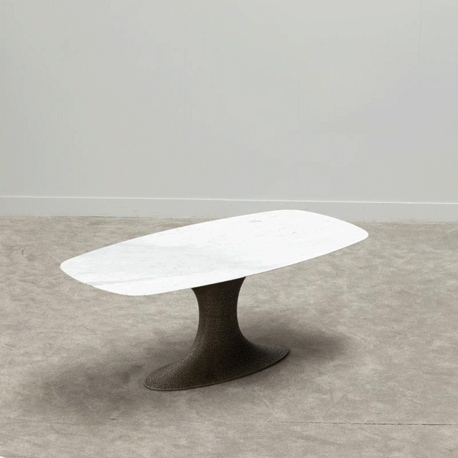 A delicate surface rests on a sturdy, anchored central base with voluptuous curves, as if weightless.