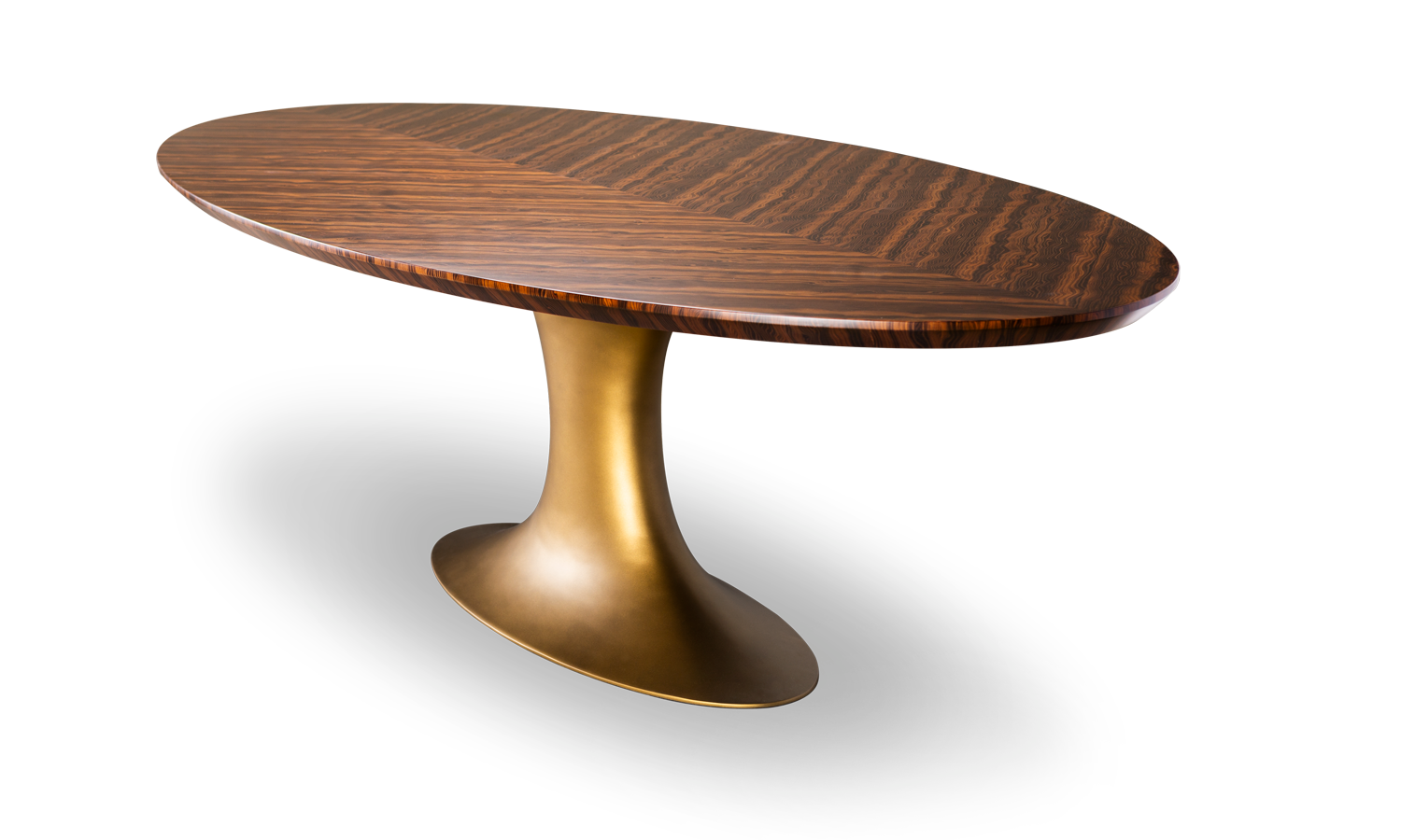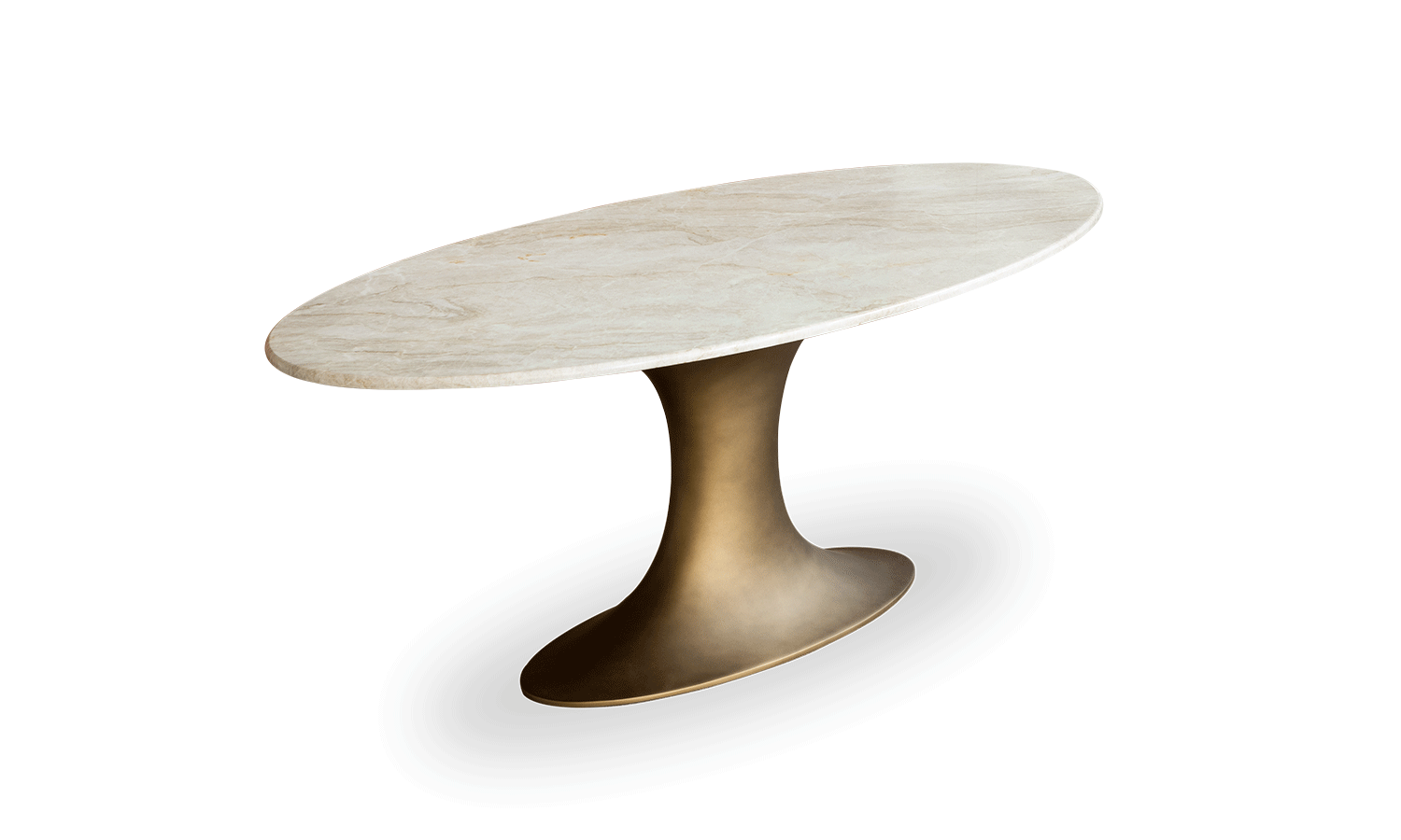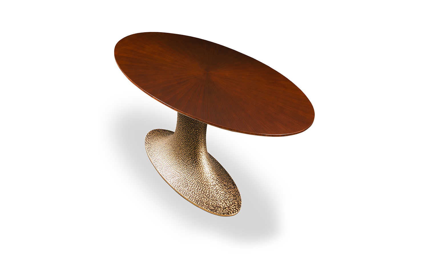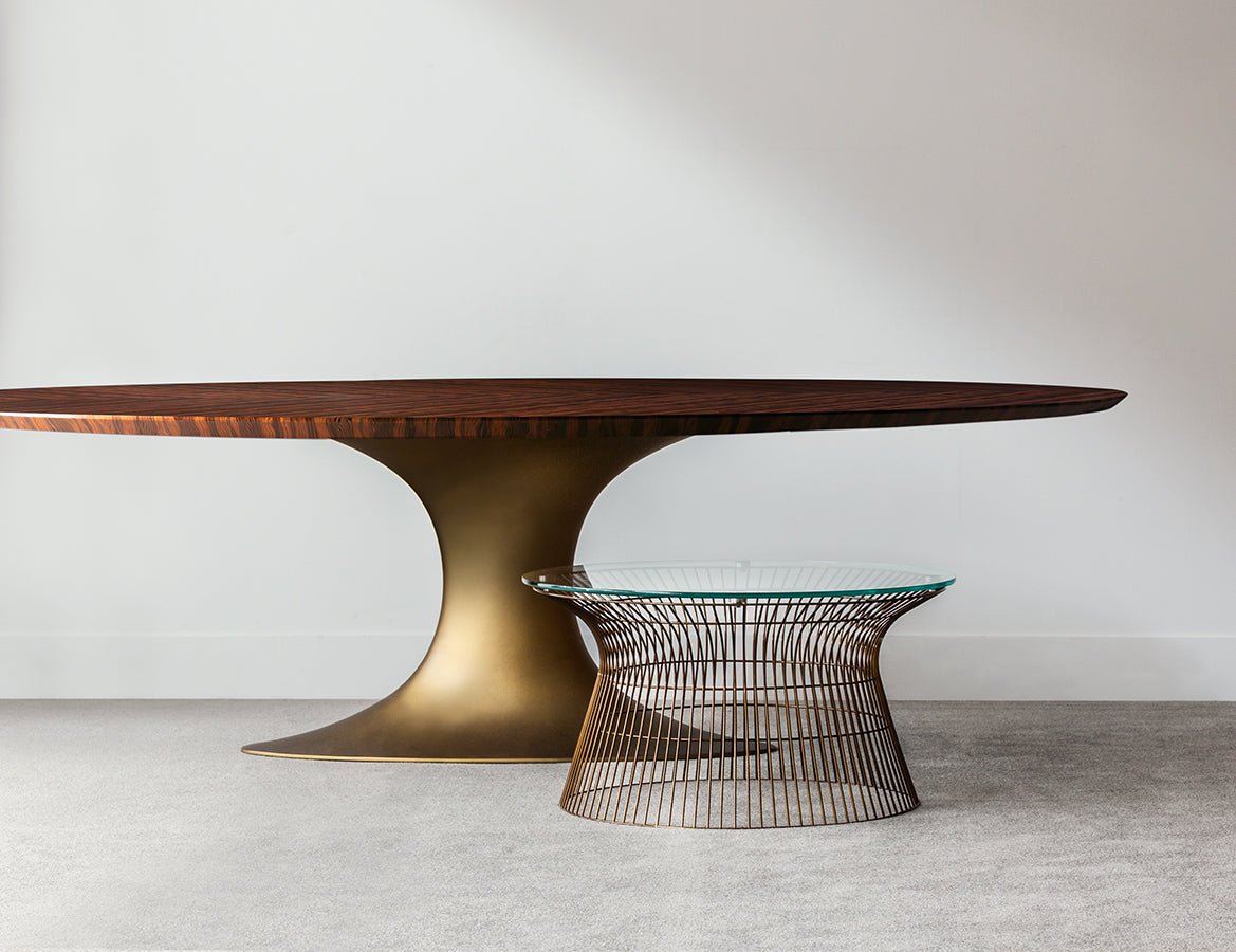A delicate surface rests on a sturdy, anchored central base with voluptuous curves, as if weightless.