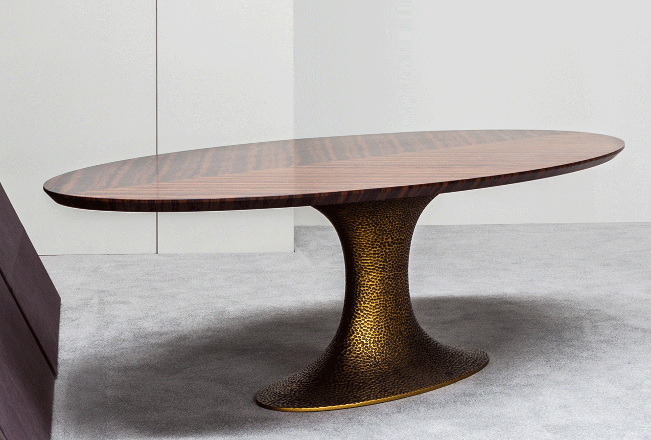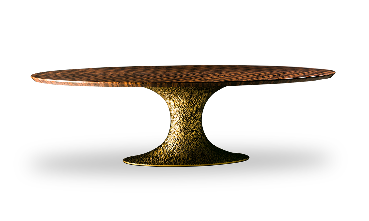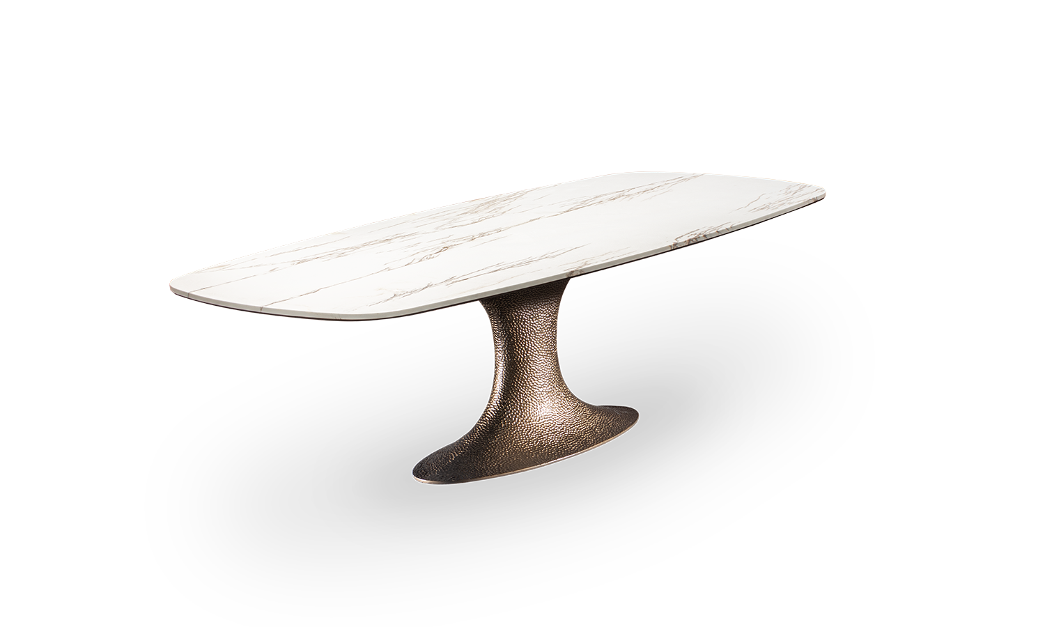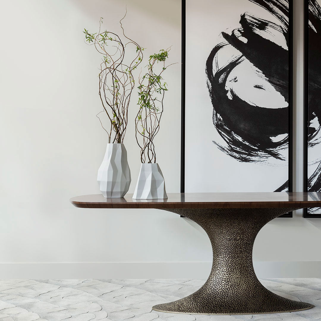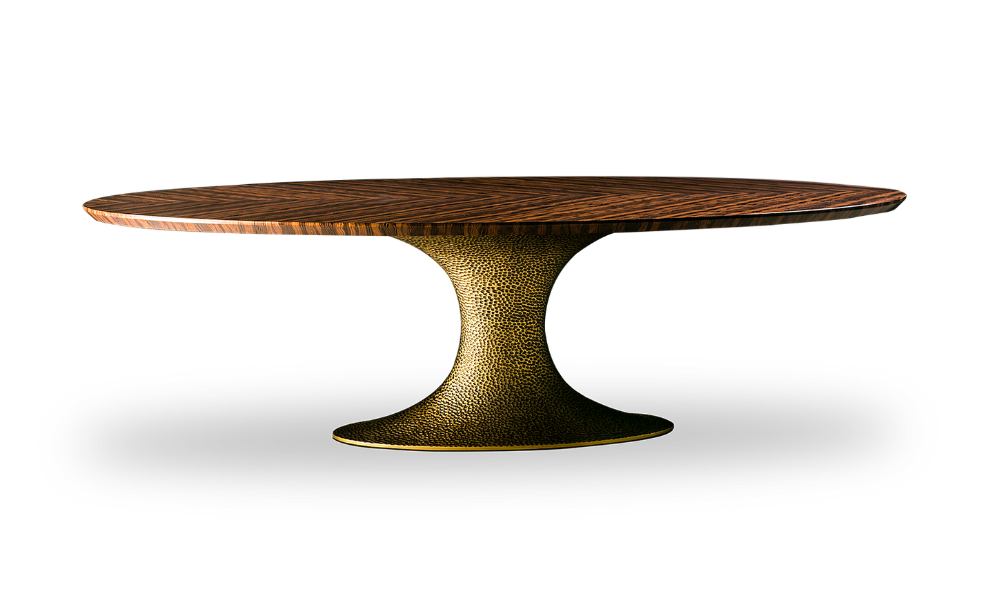The Inès dining table is the perfect union of beauty and practicality. Its hammered or smooth resin pedestal and variety of surfaces, give it a unique and luxurious look, while guaranteeing a dining experience in the utmost comfort once the clutter of the traditional four legs has been eliminated.
