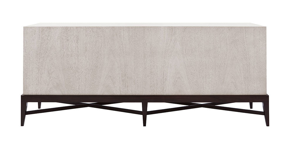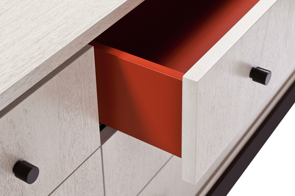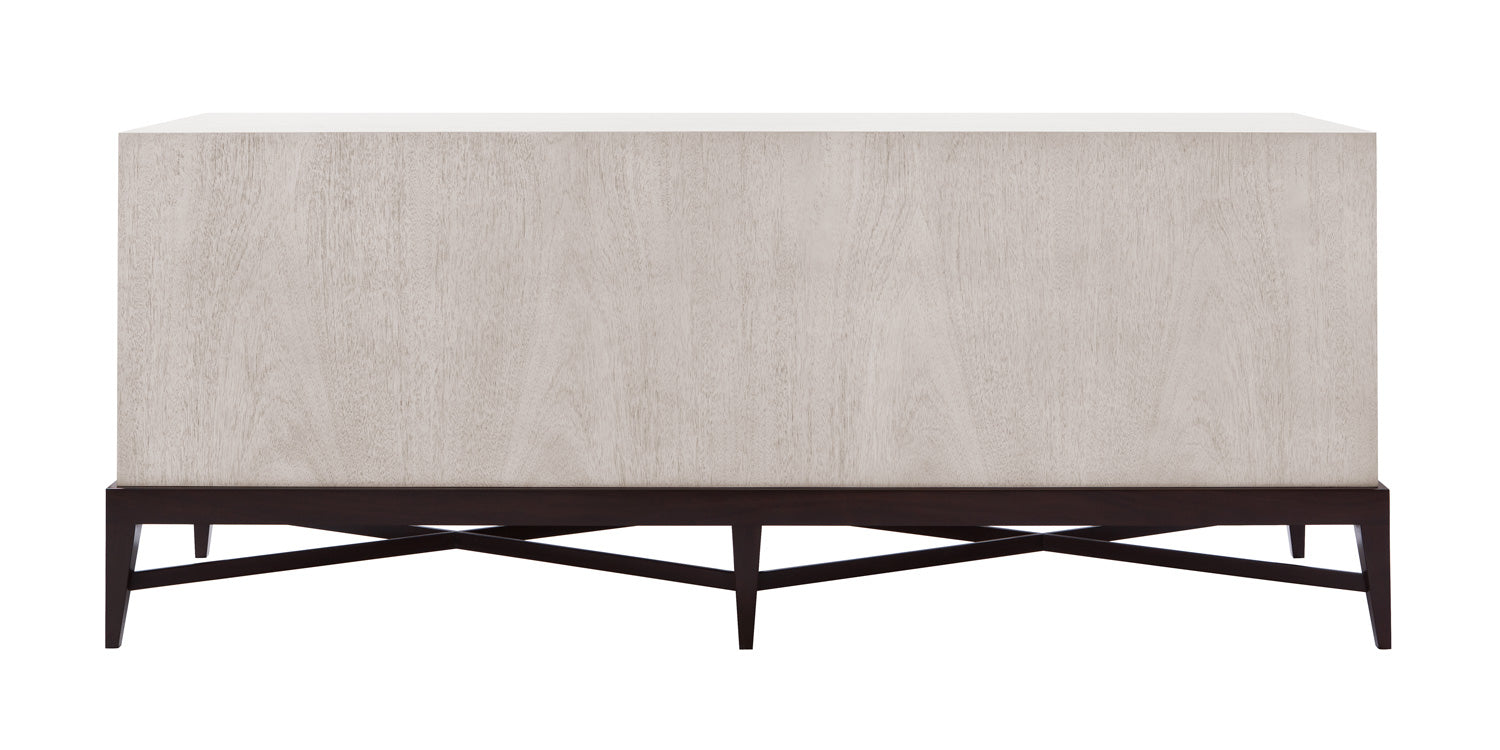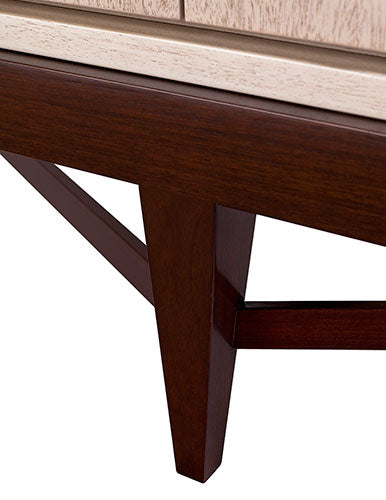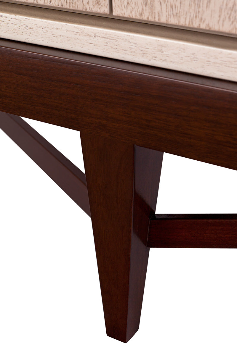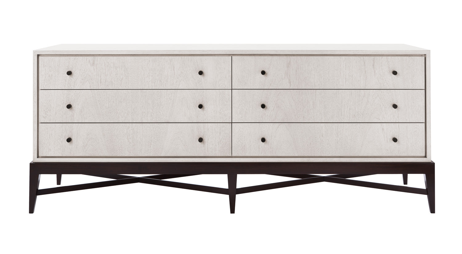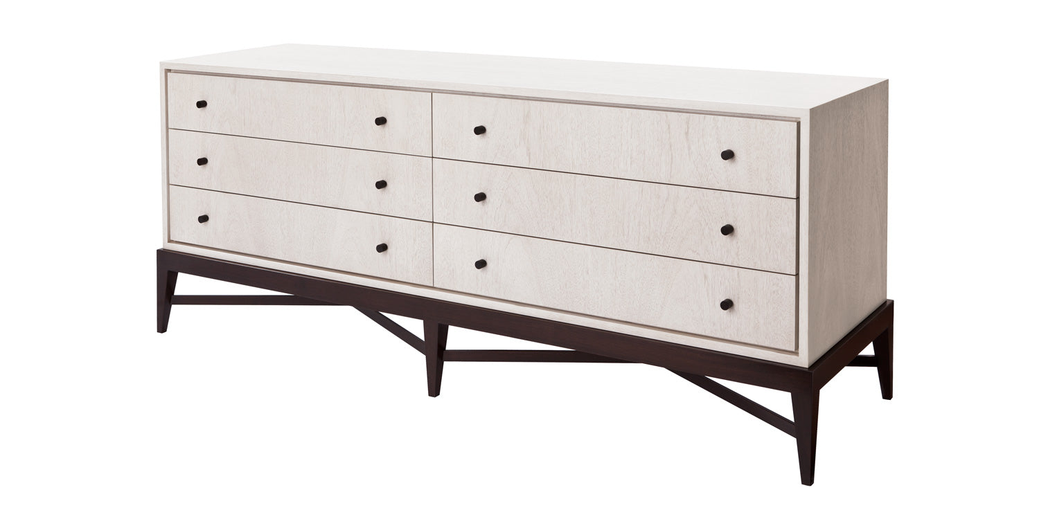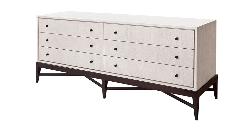 wood or lacquer cabinet with two banks of three drawers and a double cross stretcher show-wood base with tapered leg. lacquer drawer interiors.