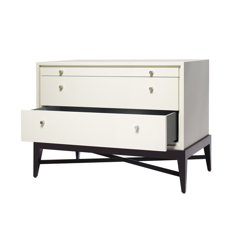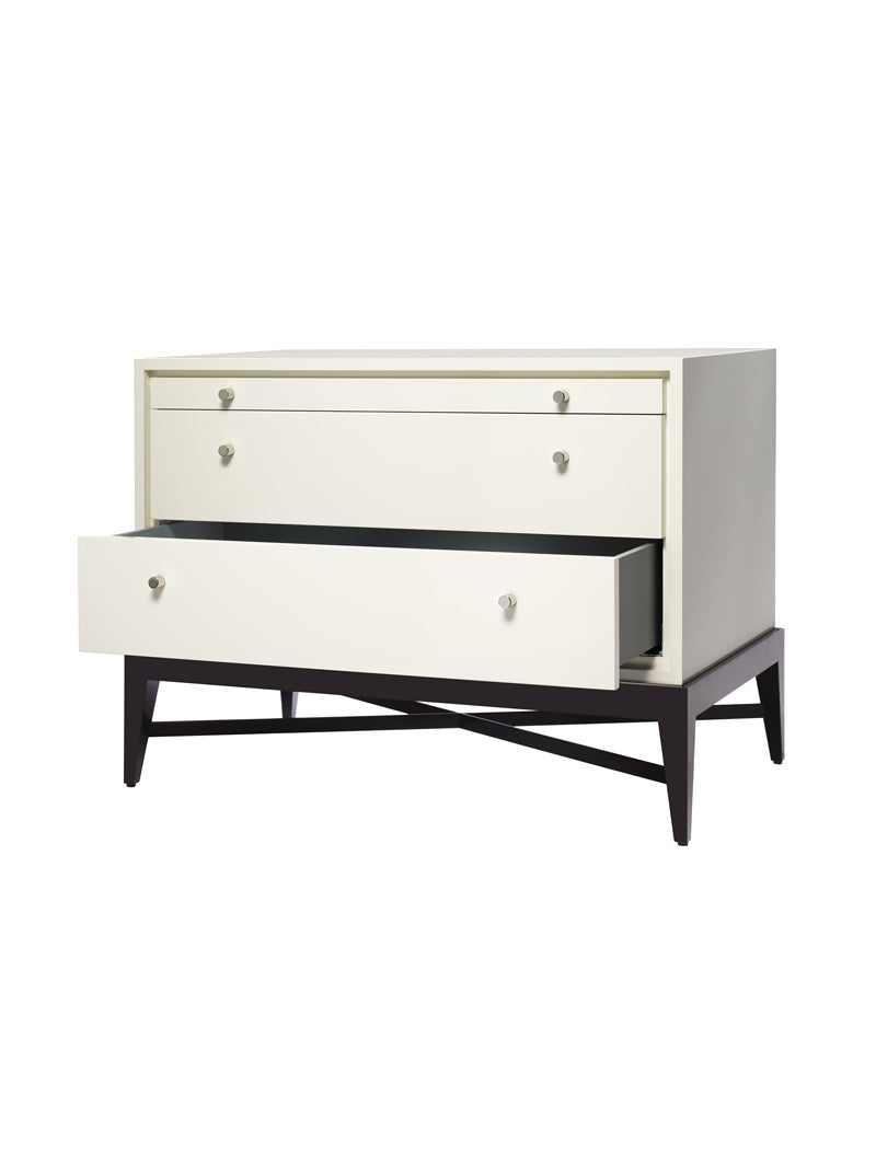 wood or lacquer 2-drawer chest with glass inset pullout tablet, show-wood base with a tapered leg. lacquer drawer and tablet interiors.