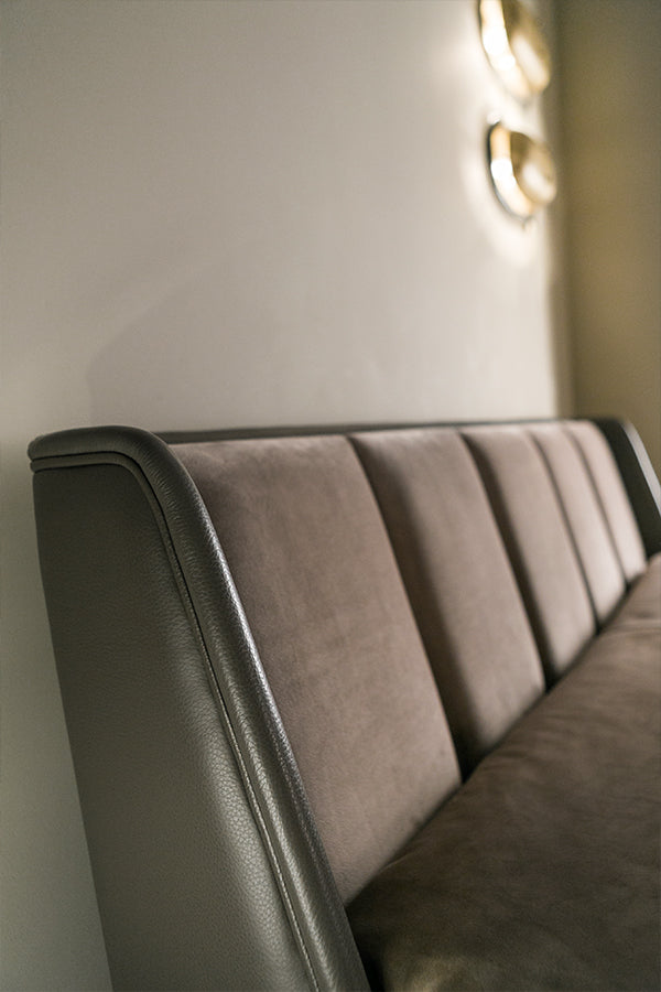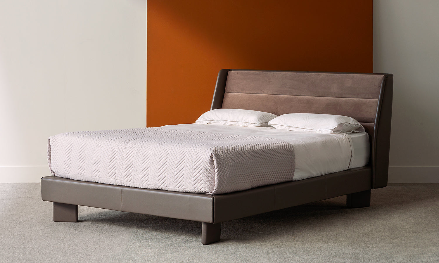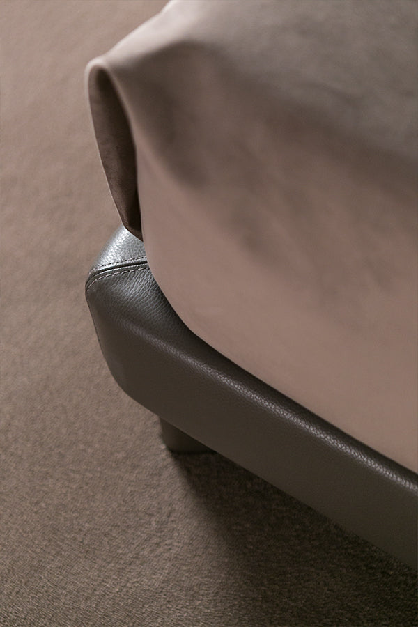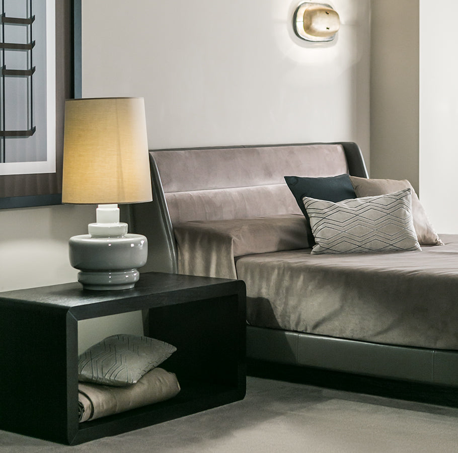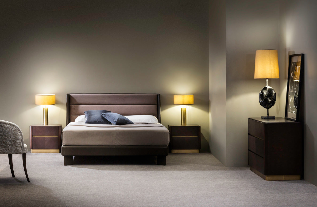 A perfectly sleek and simple structure with choice of two cylindrical headboard options, our Lazaro bed is ideal for mixing materials like leather and velvet.