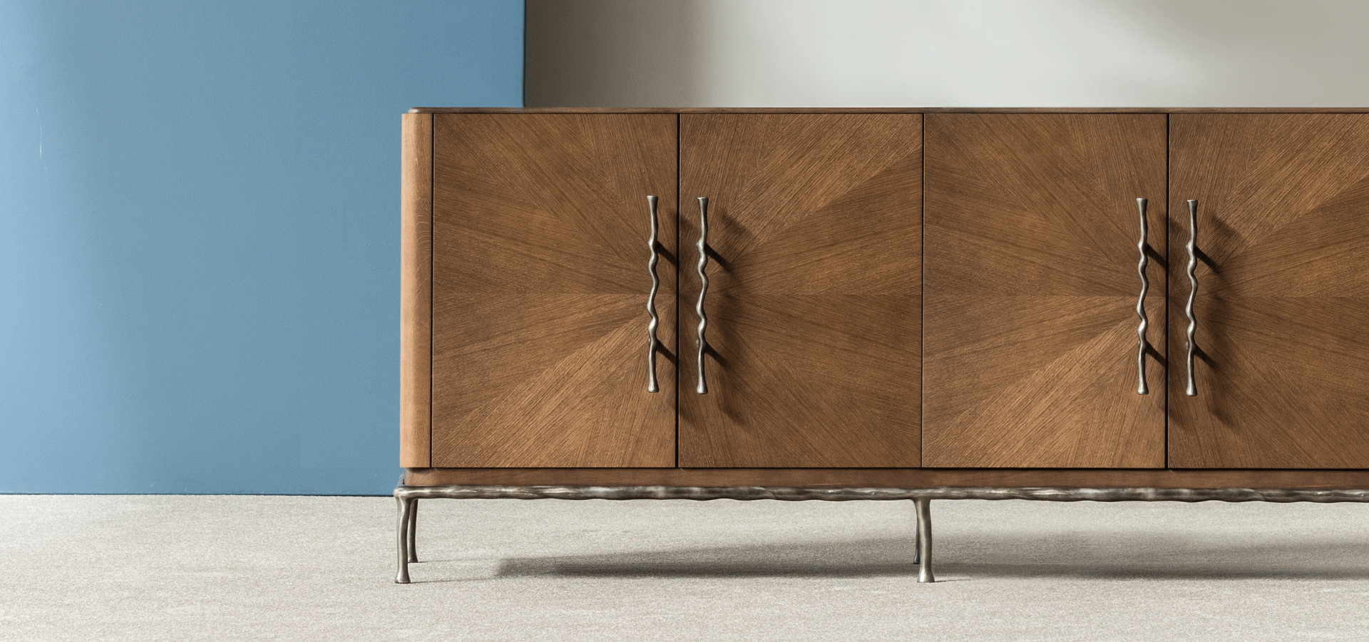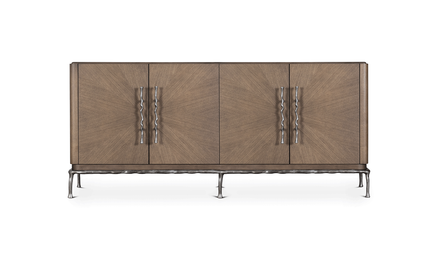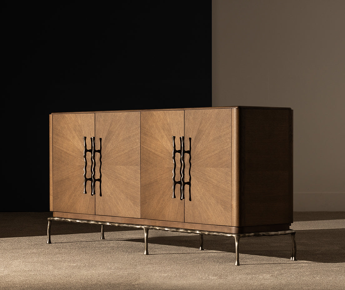 Taking inspiration from the natural world, Lupa storage pieces marry form and function. Wooden dense box is enhanced by a cast brass structure for its inimitable gilding or cast aluminium for a cooler visual. The Lupa four-door sideboard meets your functional and aesthetic criteria.