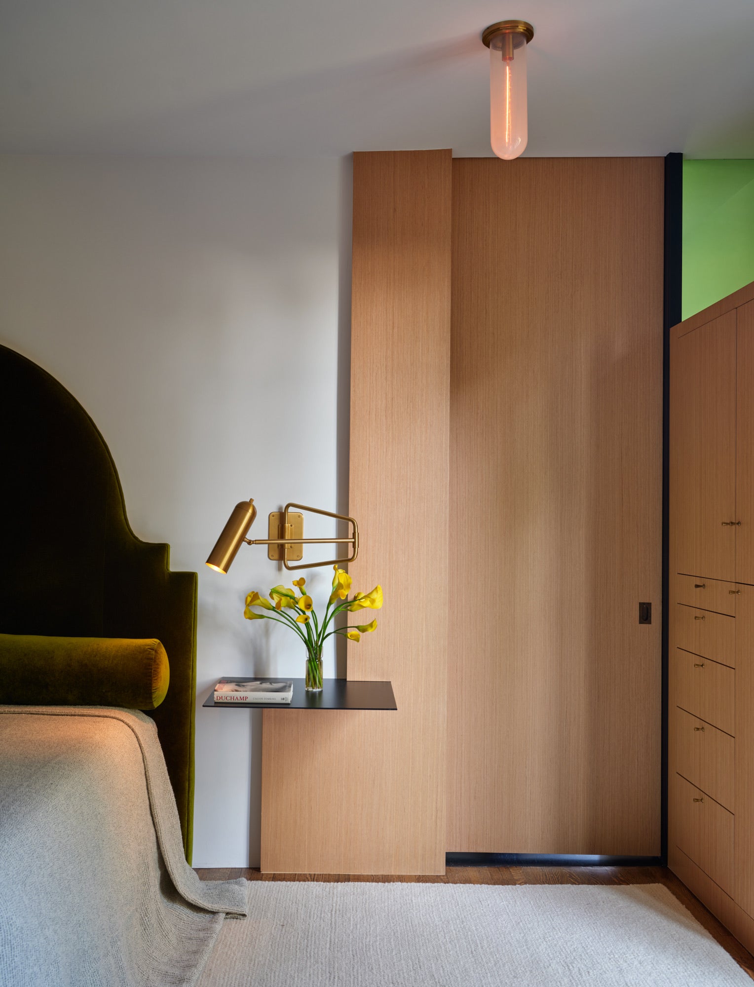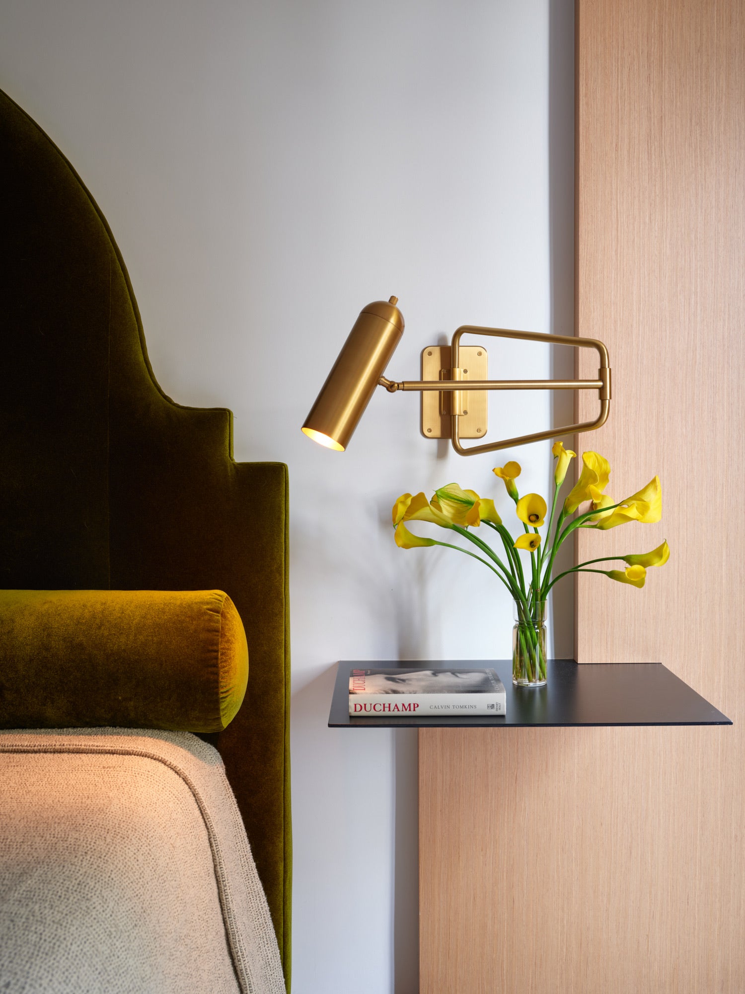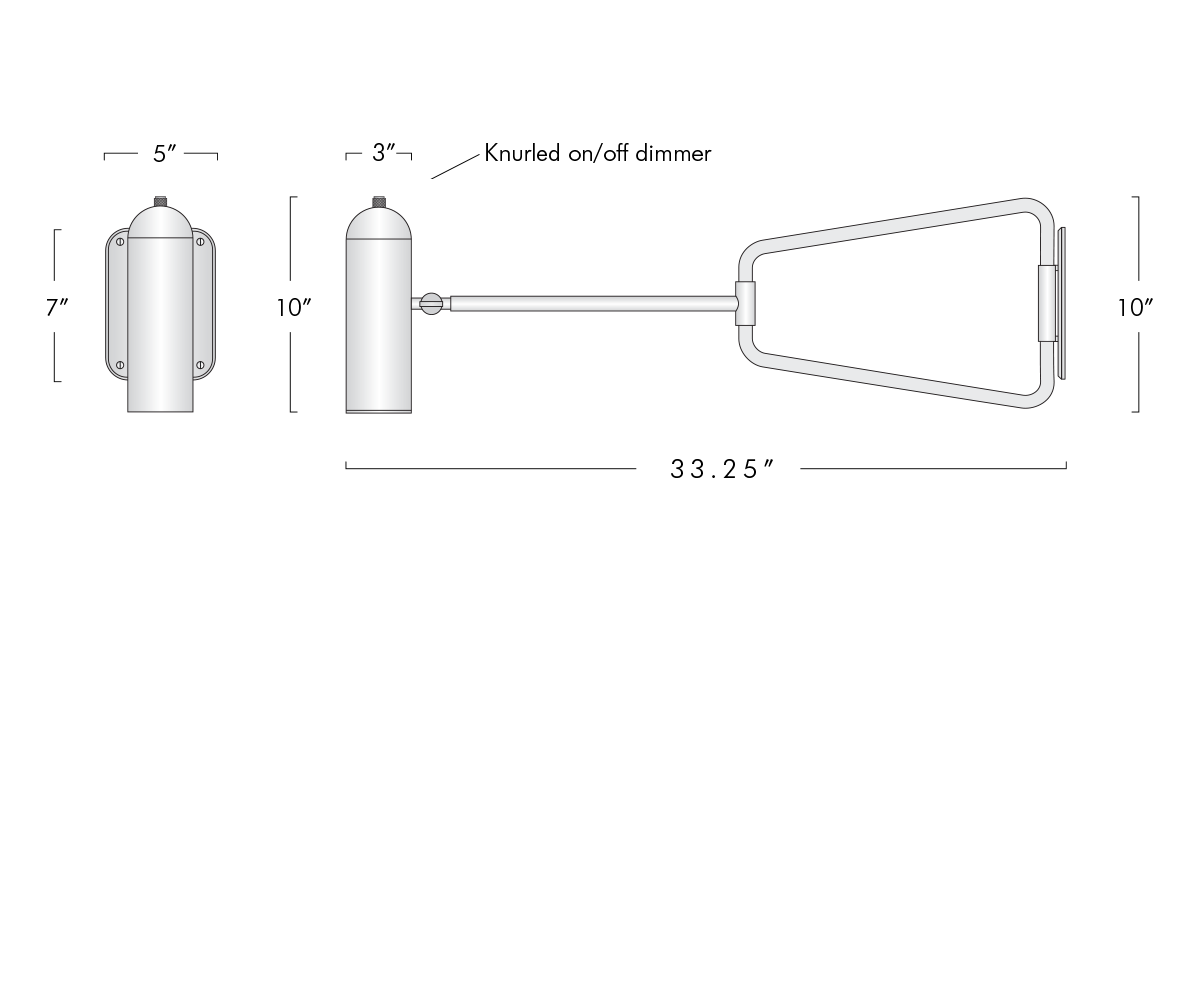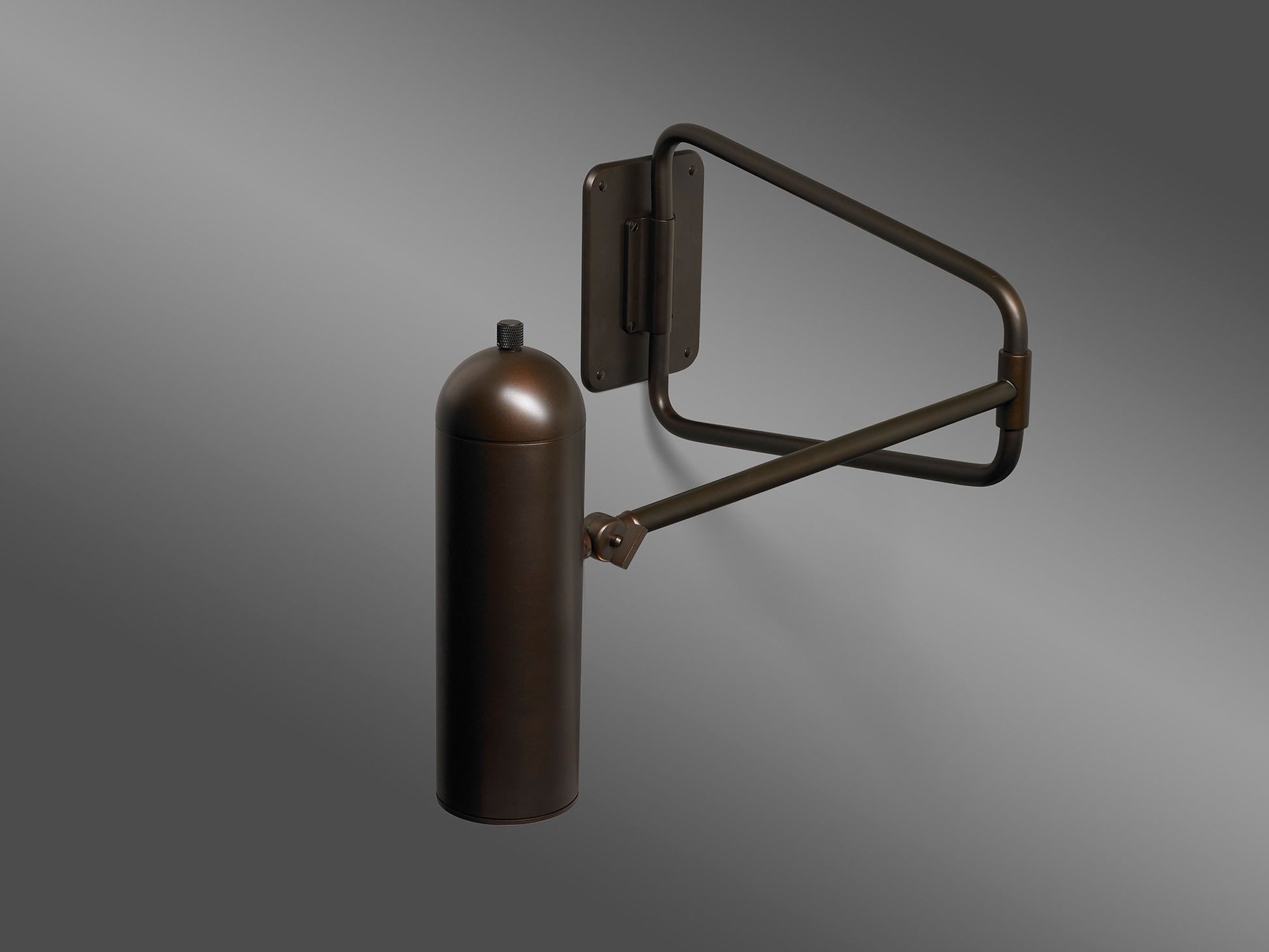 The Mallet Swing Arm Sconce is machined by hand from solid brass. The shade and arm are made from thick-walled brass tubing. All parts are hand polished and patina’d. There are two pivot points to create a wide range of depth adjustments.