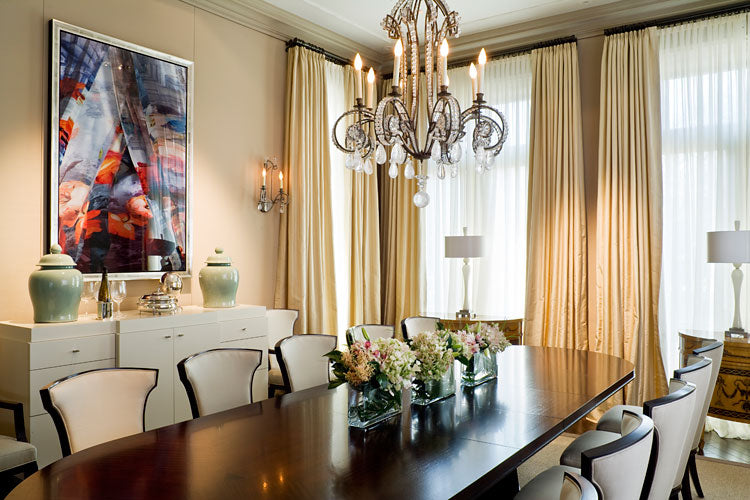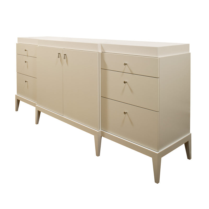 multi purpose two-tone breakfront lacquer cabinet with six drawers on full extension glides, two doors with adjustable shelves, lacquer interior, satin nickel pulls and tapered wood base.