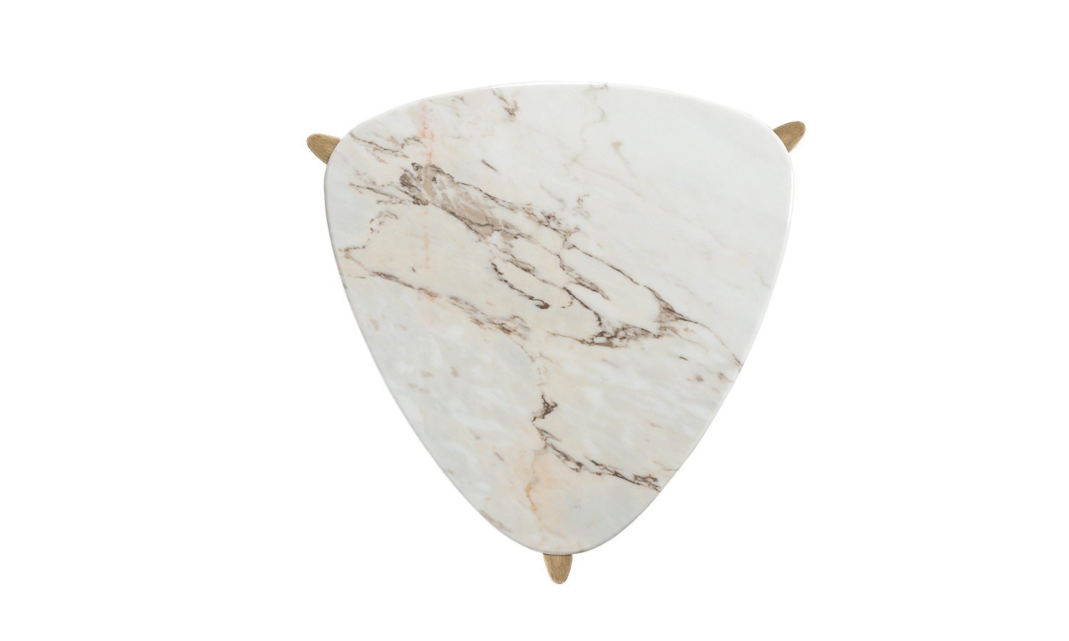 A plectrum-shaped top is supported by three tall, slender legs that are slightly off-centre.