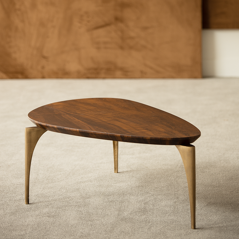 A plectrum-shaped top is supported by three tall, slender legs that are slightly off-centre.