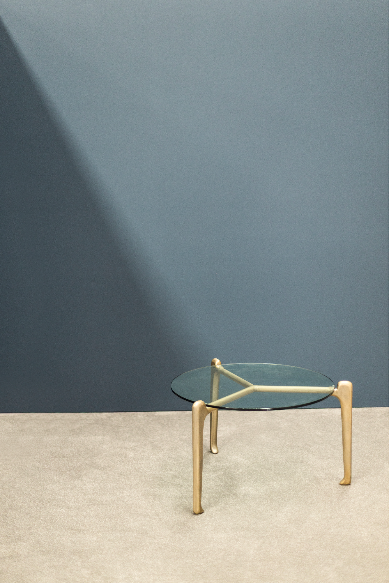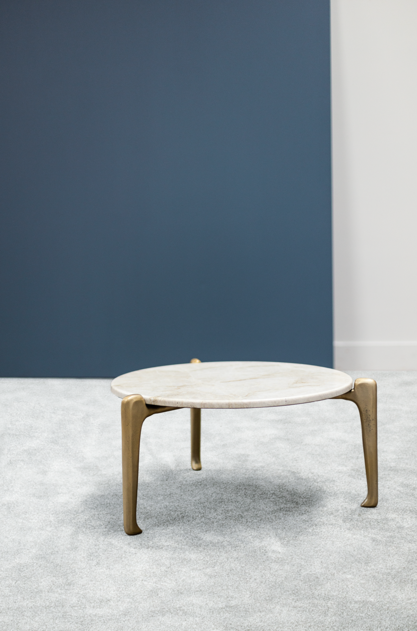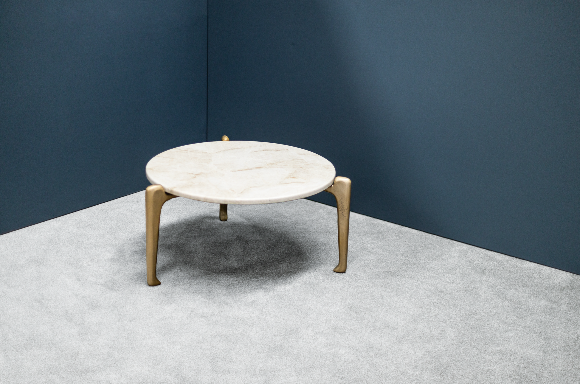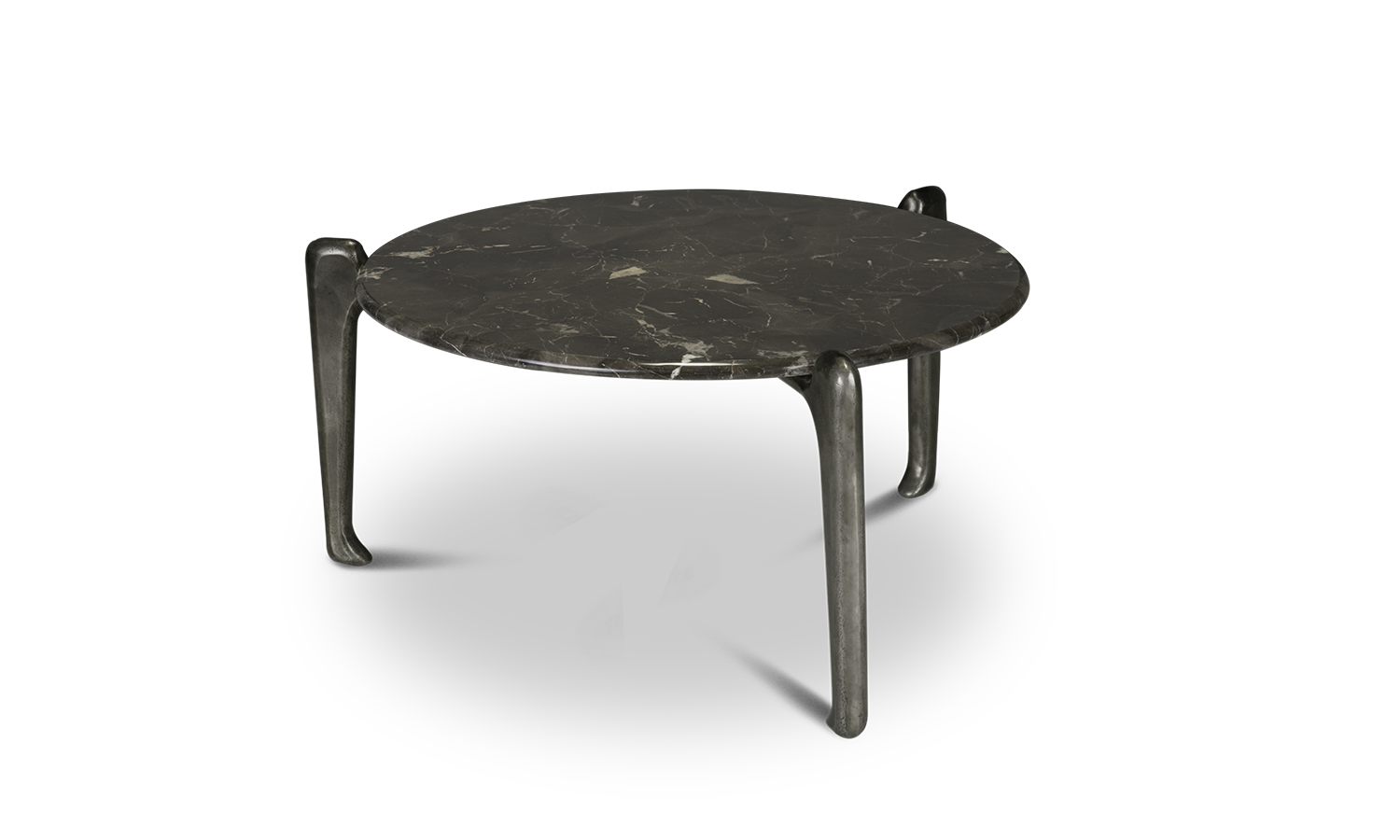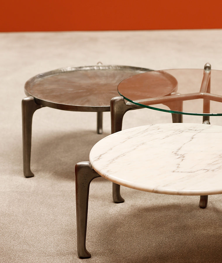 This coffee table has cast aluminuim with natural varnish and three variants for the top: Emperador marble, glass or cast alumnium. Other finishes and dimensions may be available on request.