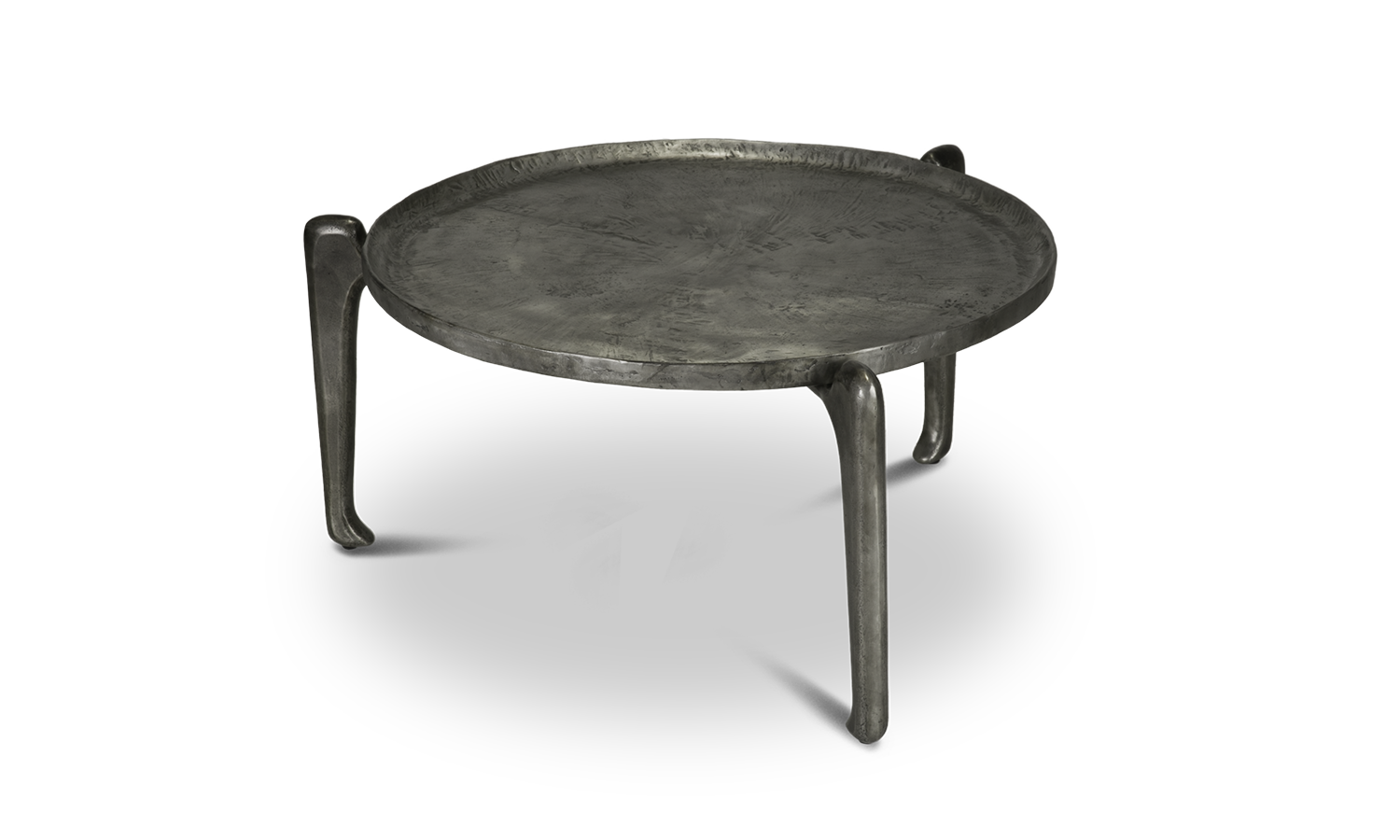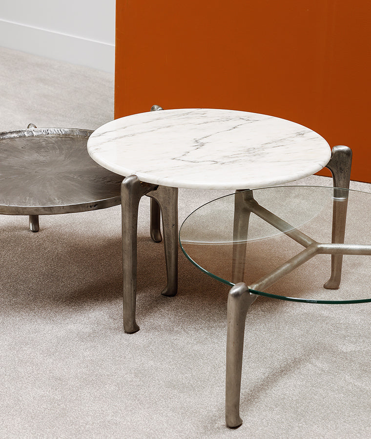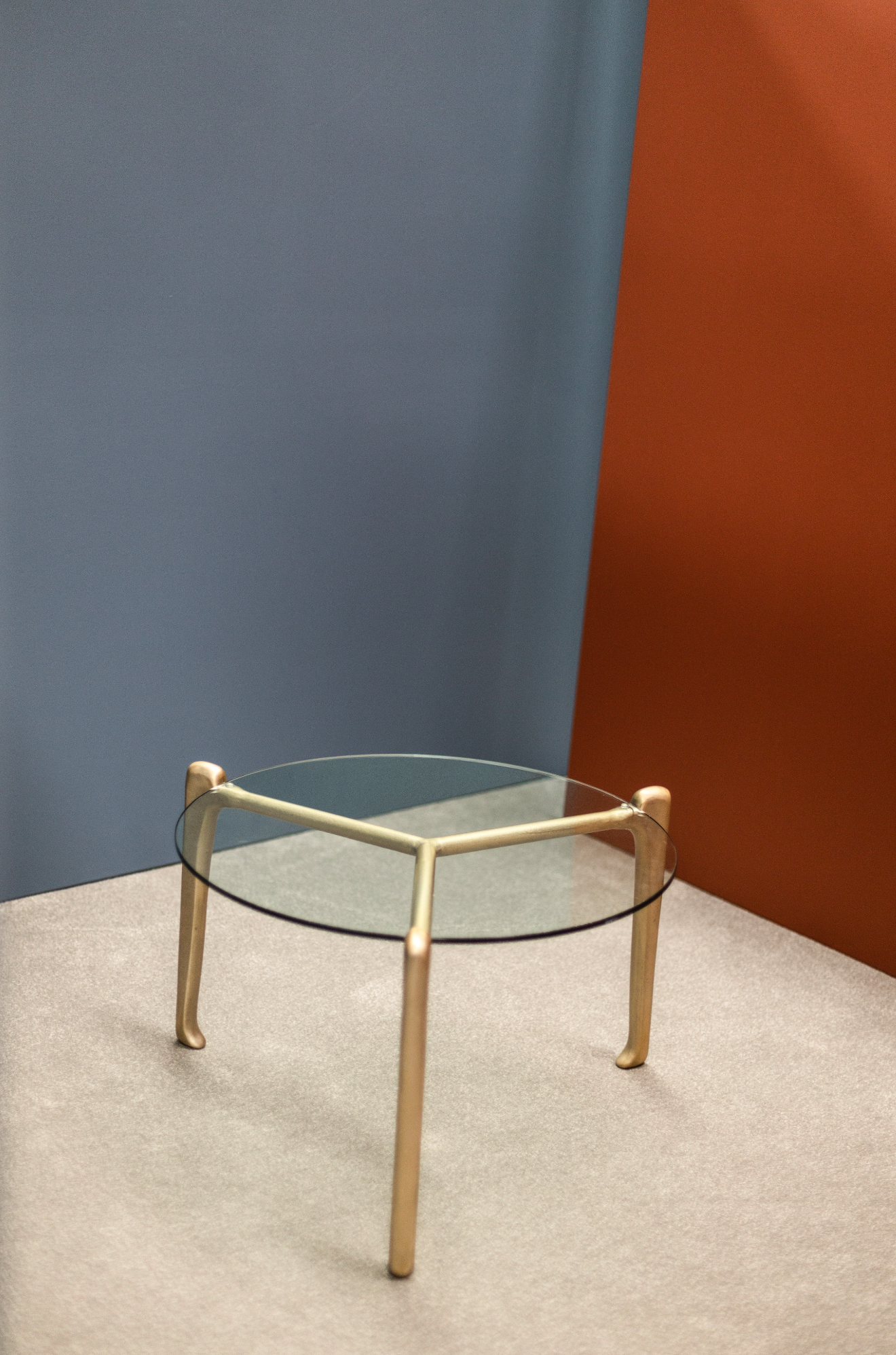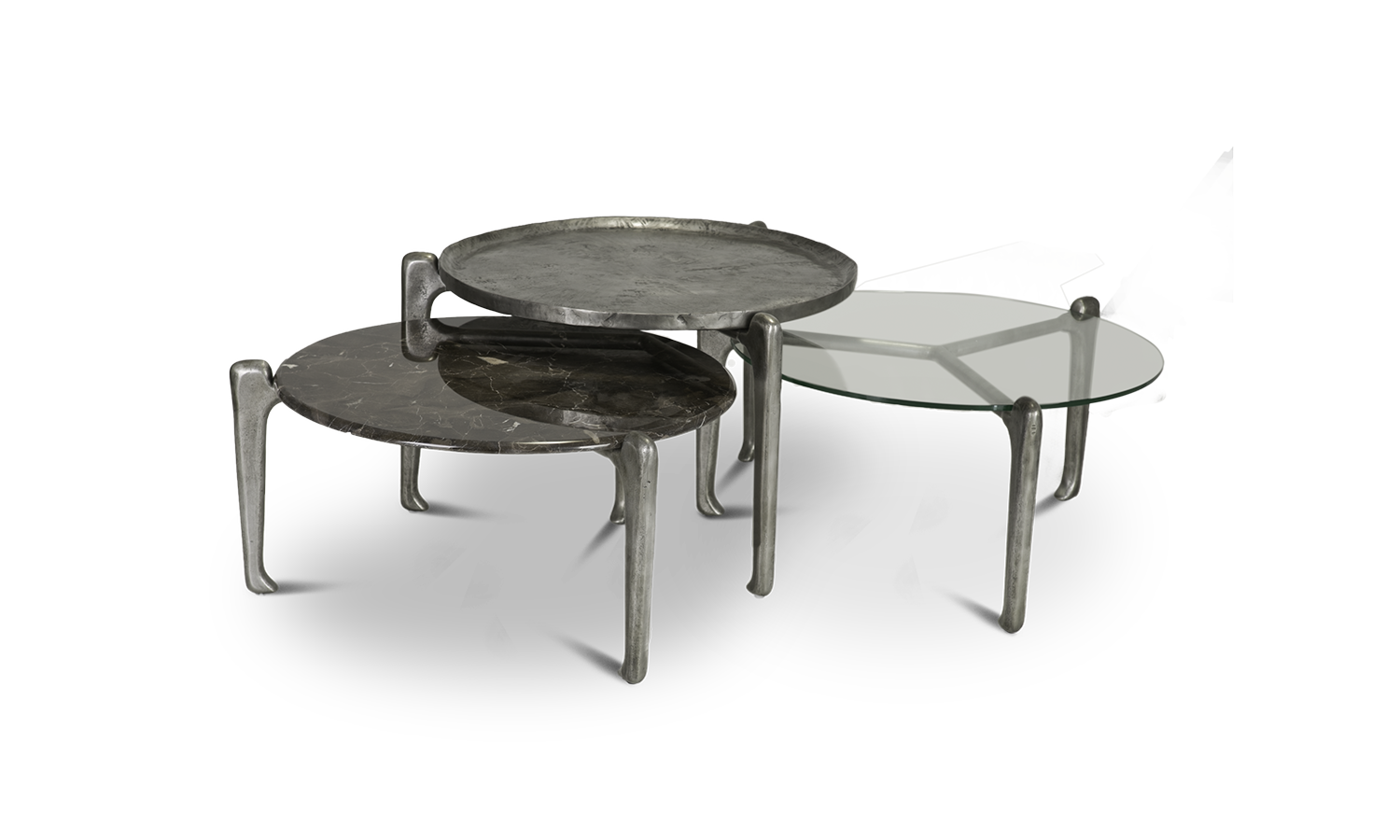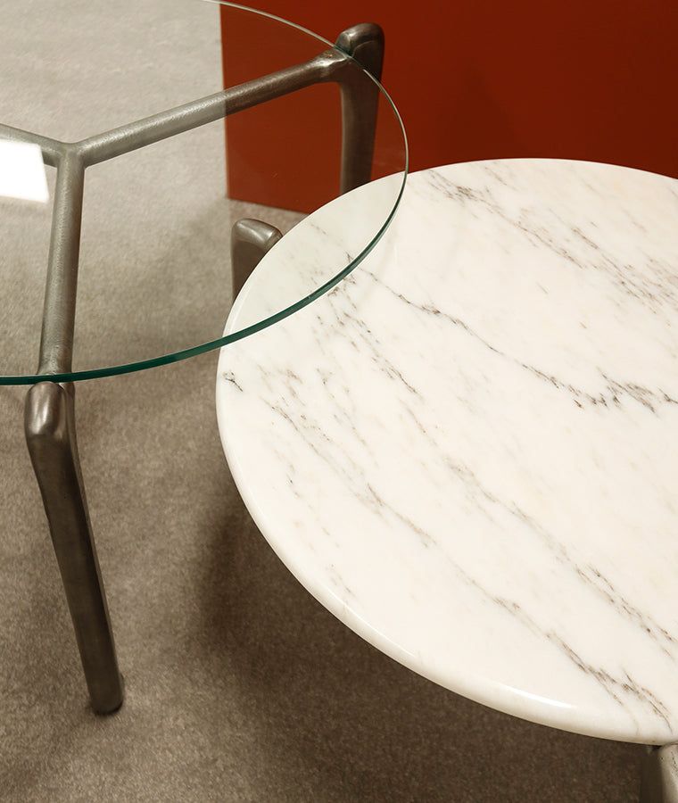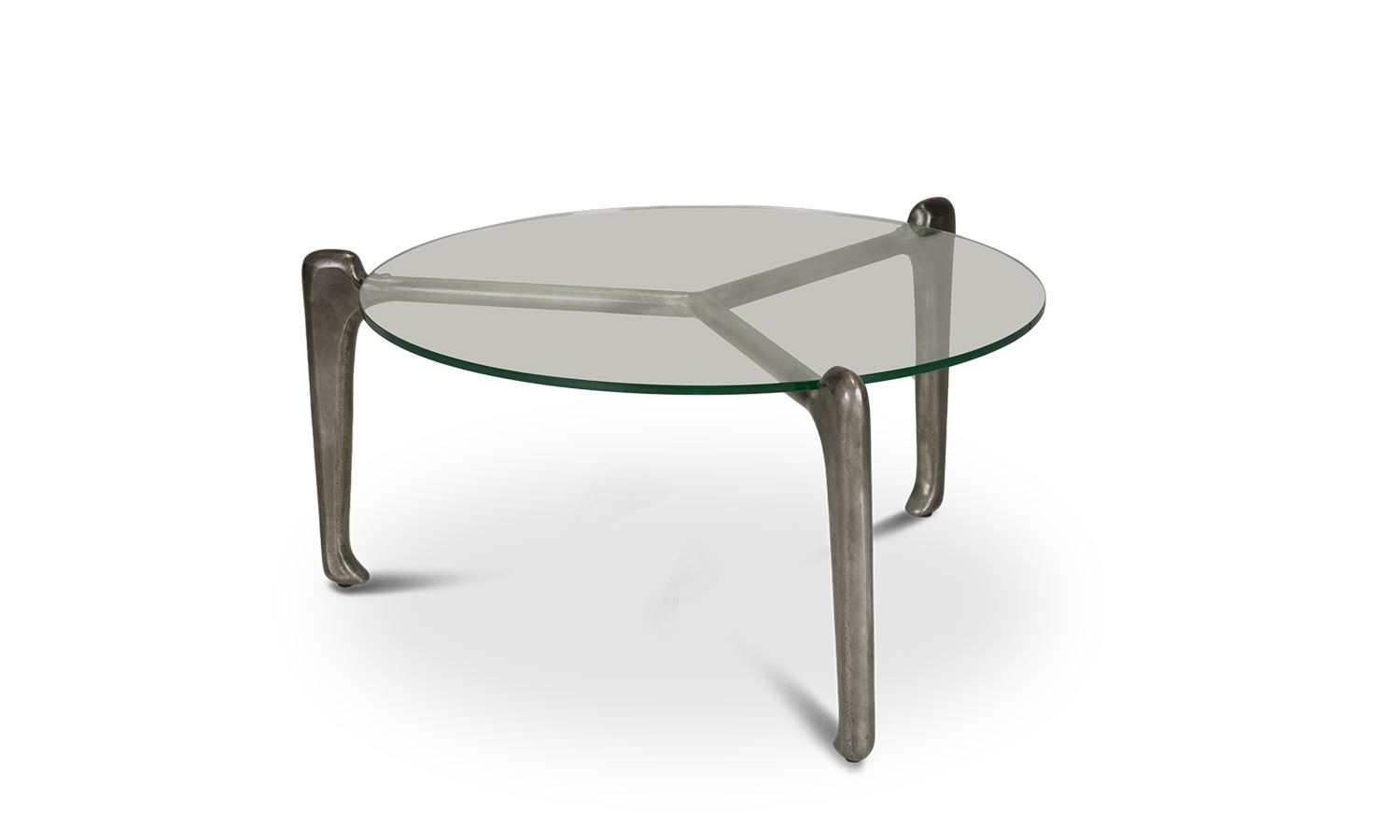 This coffee table has cast aluminuim with natural varnish and three variants for the top: Emperador marble, glass or cast alumnium. Other finishes and dimensions may be available on request.