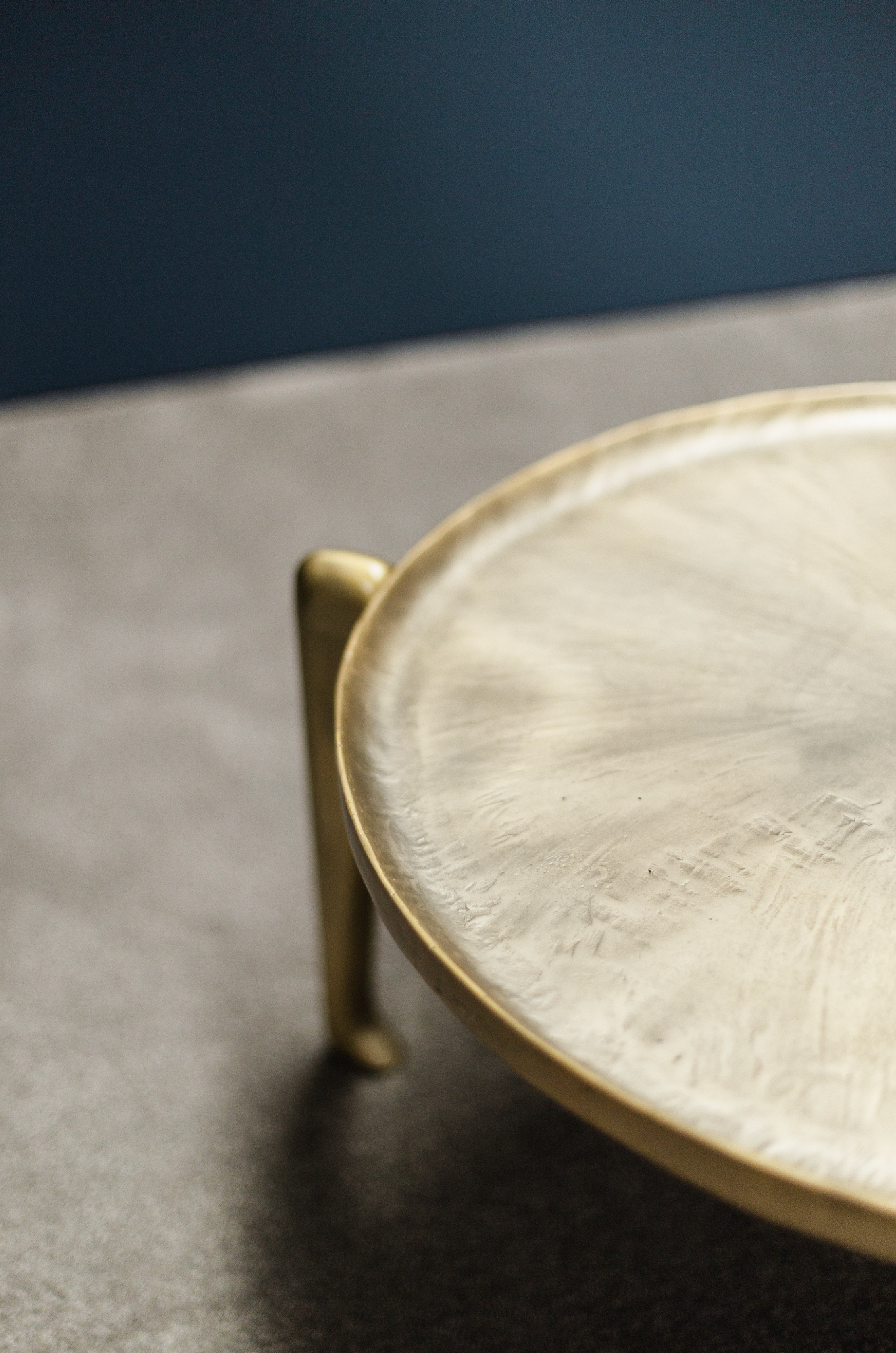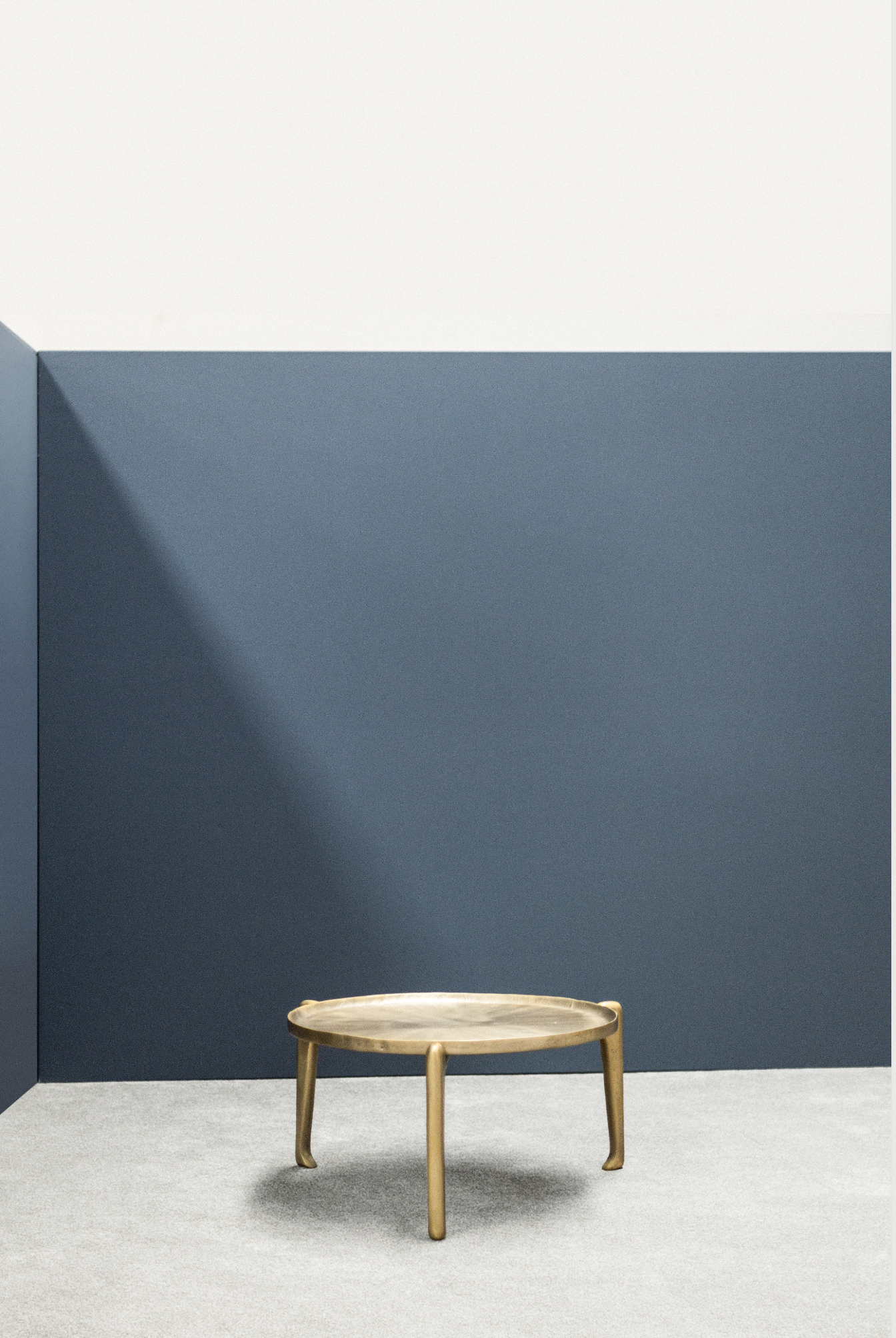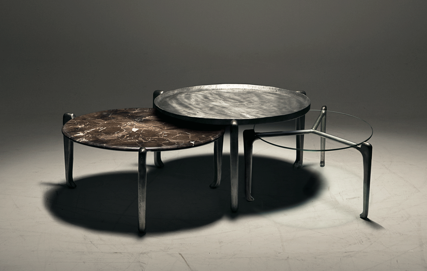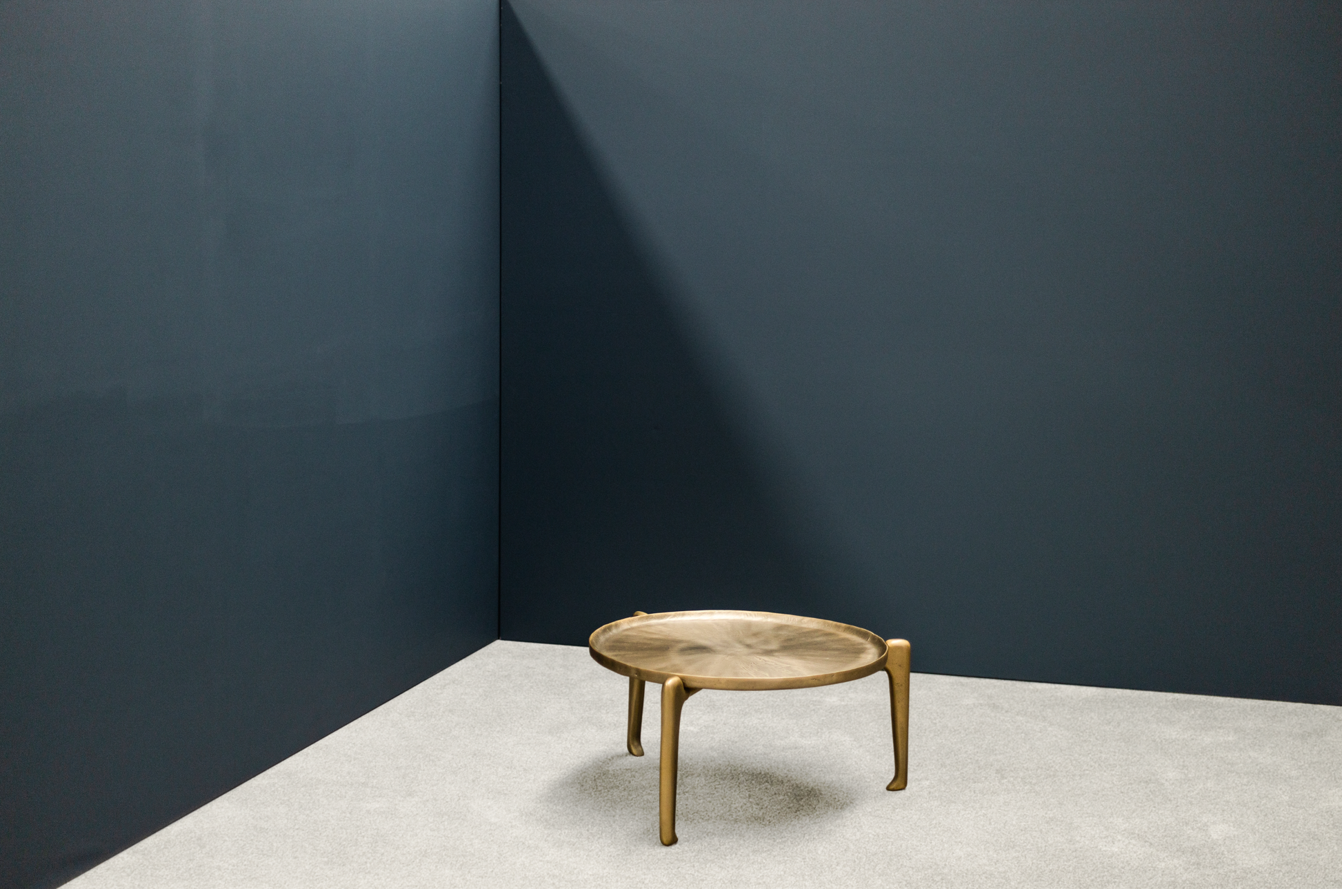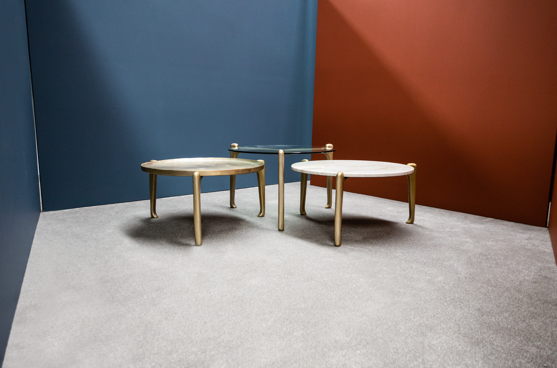 This coffee table has cast aluminuim with natural varnish and three variants for the top: Emperador marble, glass or cast alumnium. Other finishes and dimensions may be available on request.