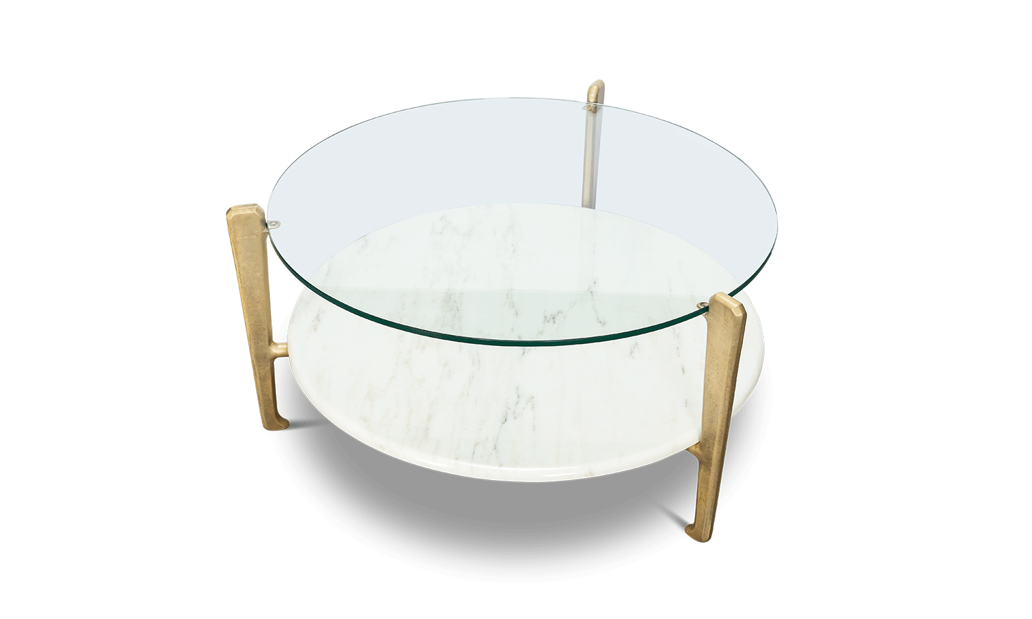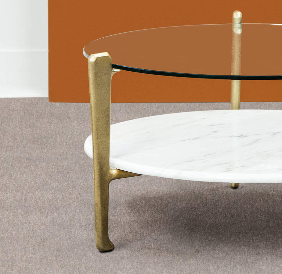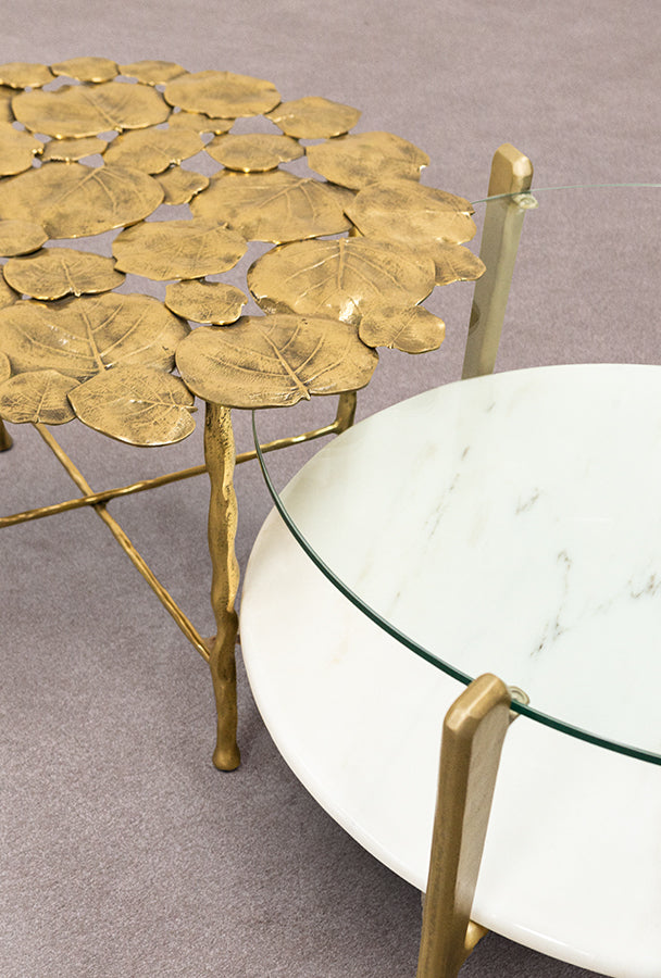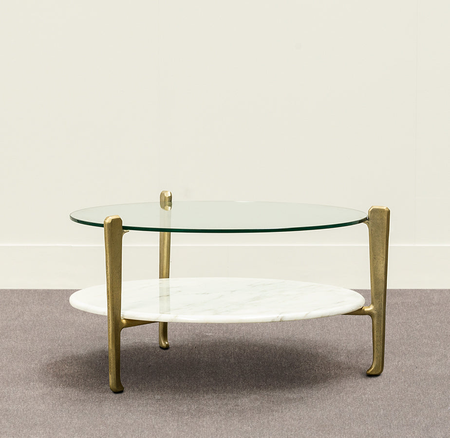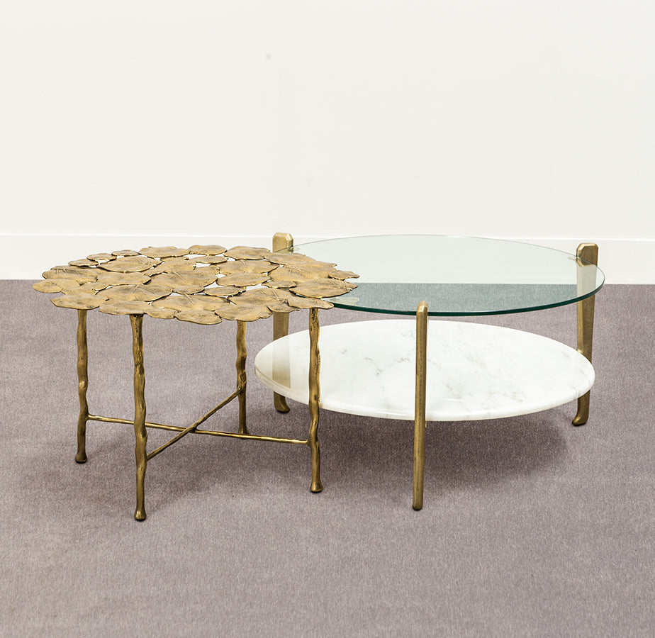 This two-tiered coffee table can be either round or rectangular and in gilded or burnt cast aluminium features a marble base and glass top. Other finishes and dimensions may be available on request.