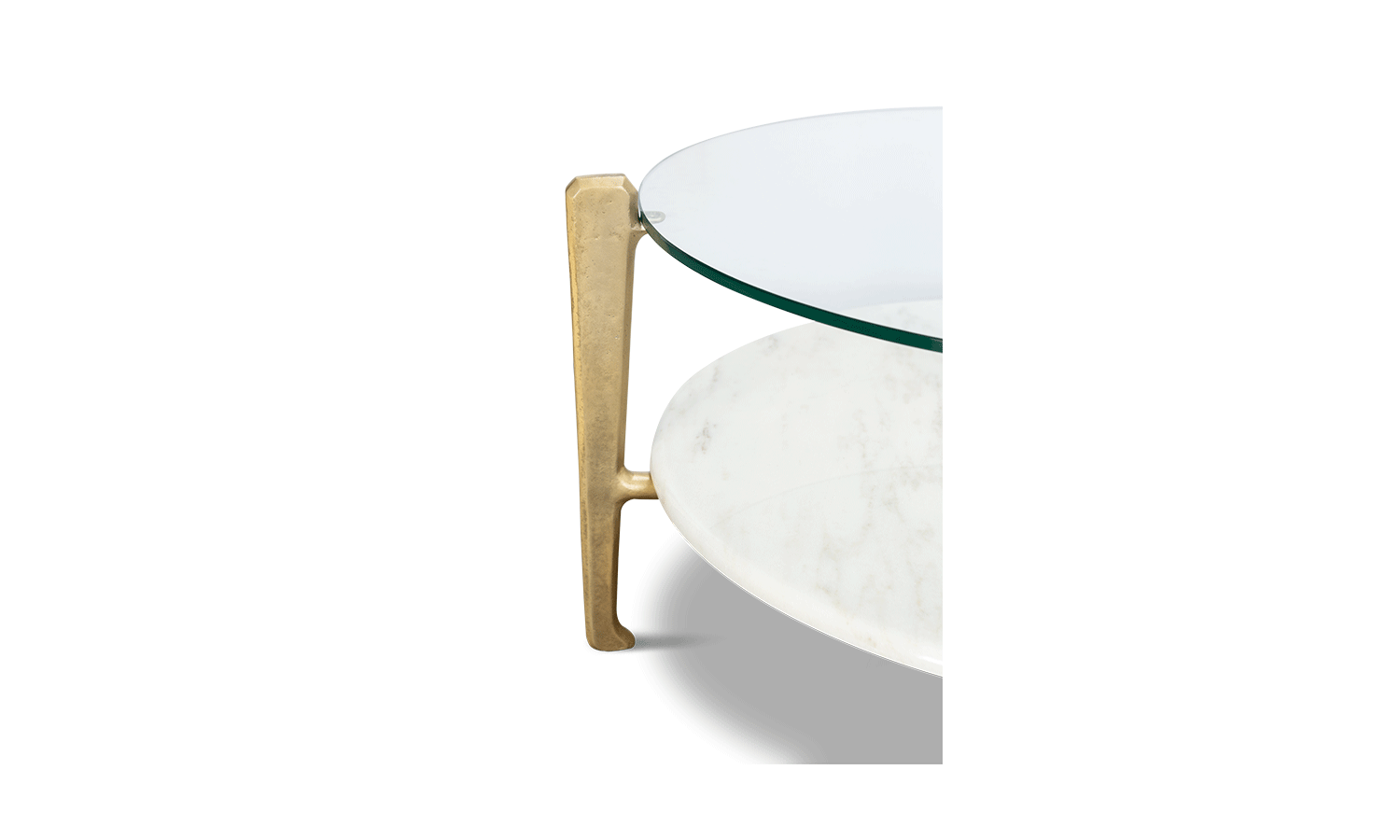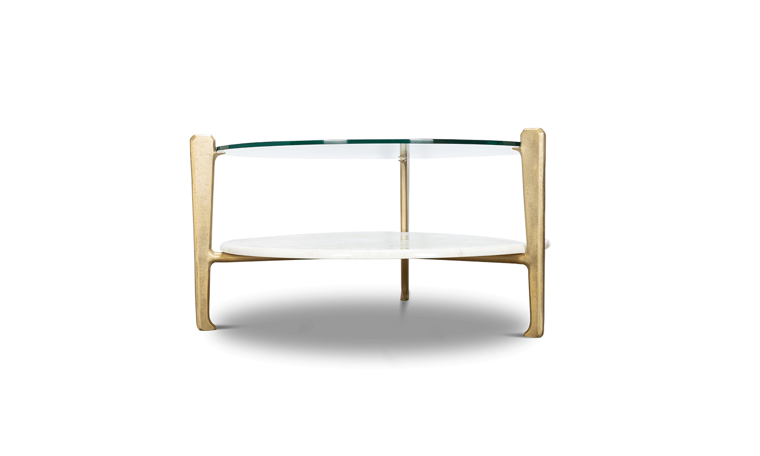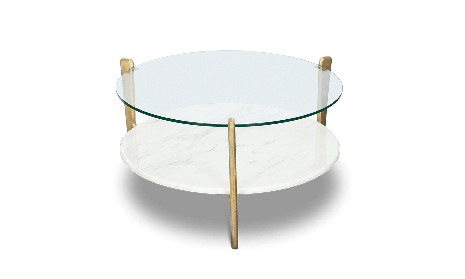 This two-tiered coffee table can be either round or rectangular and in gilded or burnt cast aluminium features a marble base and glass top. Other finishes and dimensions may be available on request.