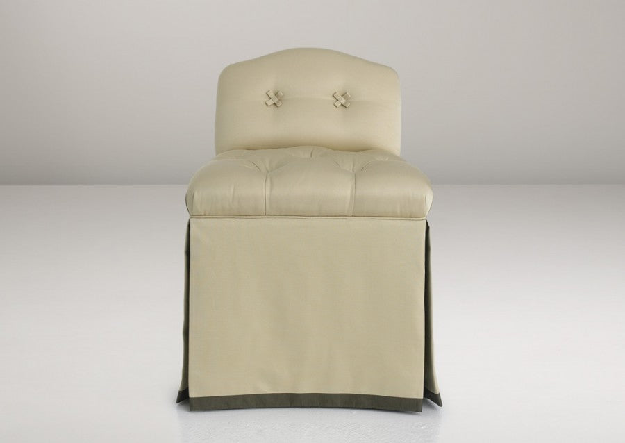 Button tufted seat and back. Tailored skirt with self welt at top. Standard casters. Standard skirt allowance is ¼”.