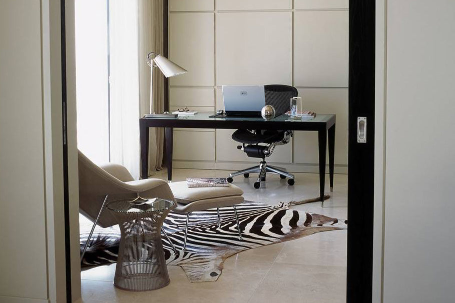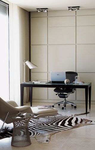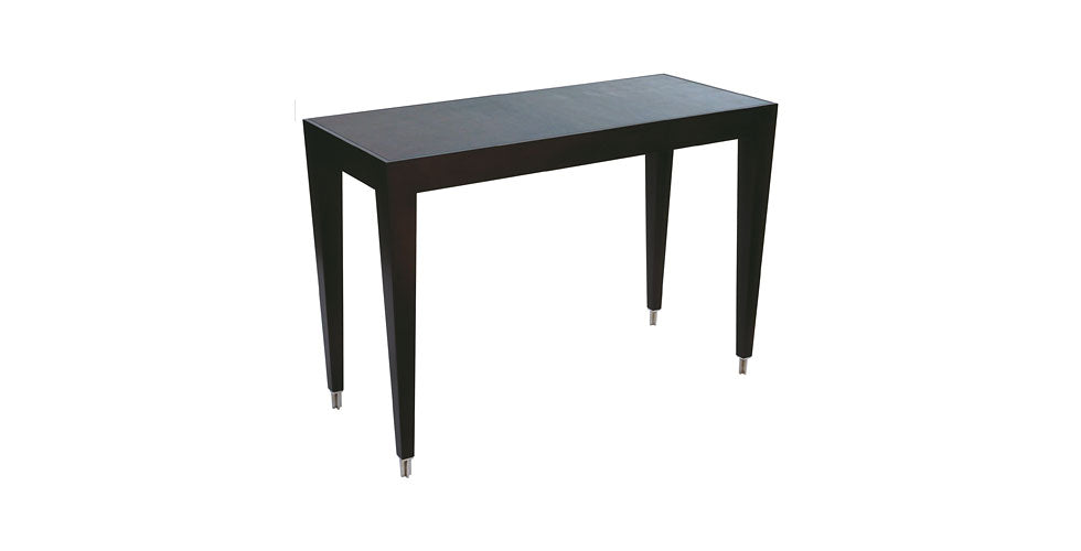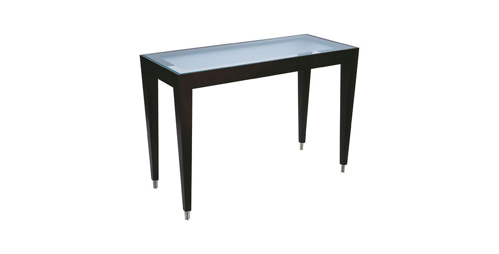 ‘Floating’ glass top table with tapered wood leg and custom nickel foot.