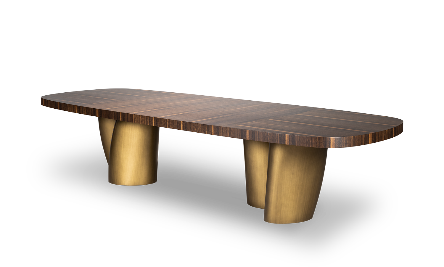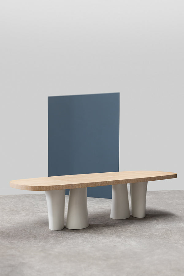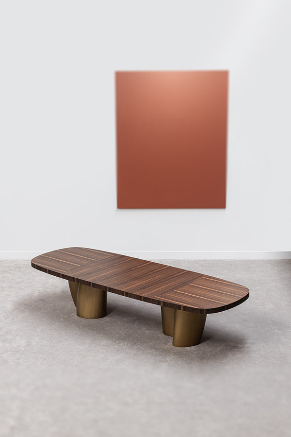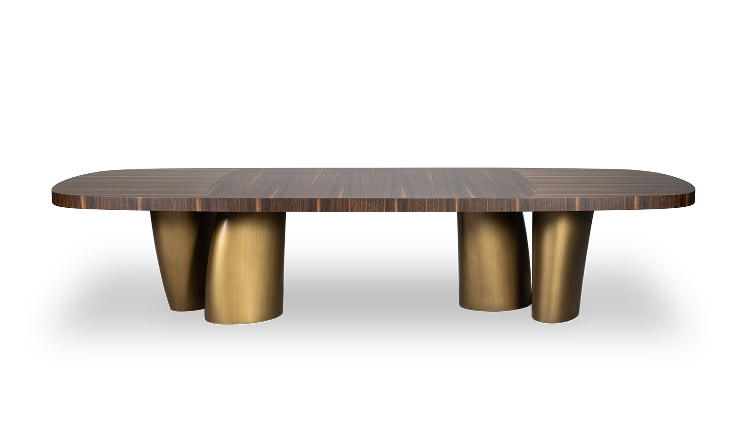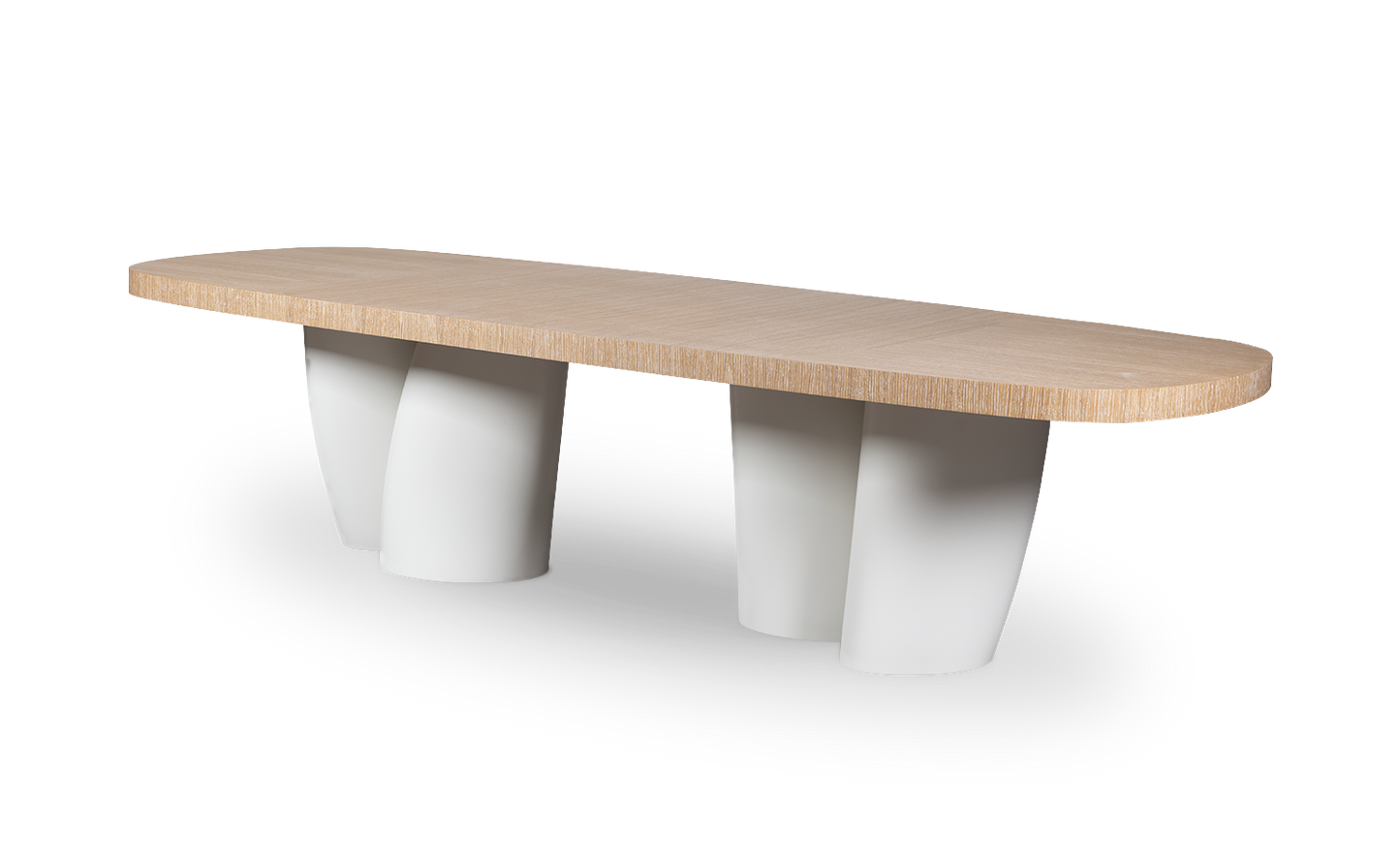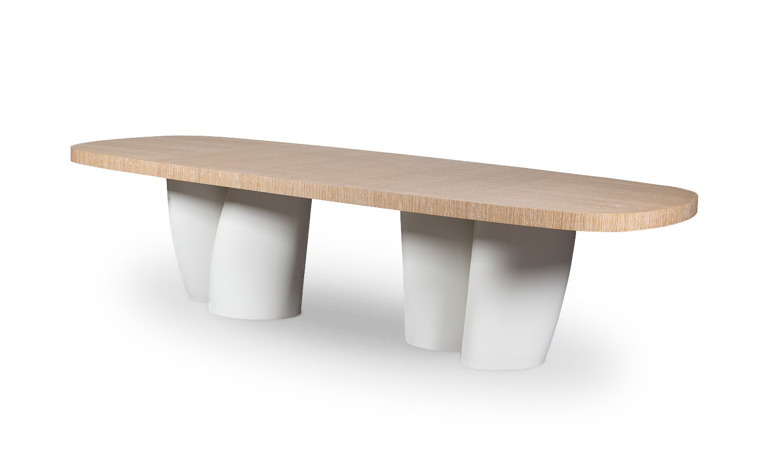 Mogambo is a dining table inspired by the African wilderness. The asymmetrically arranged bases recall the trunks of baobab trees, both their strength and balance, while its barrel-shaped surface is a nod to their foliage. This table brings originality and appeal to any space by erasing angles and turning towards Hamilton Conte’s omnipresent curve. Its form combines both style and practicality, with a large potential seating capacity that nonetheless encourages a convivial dining experience.