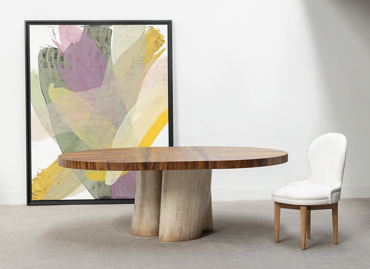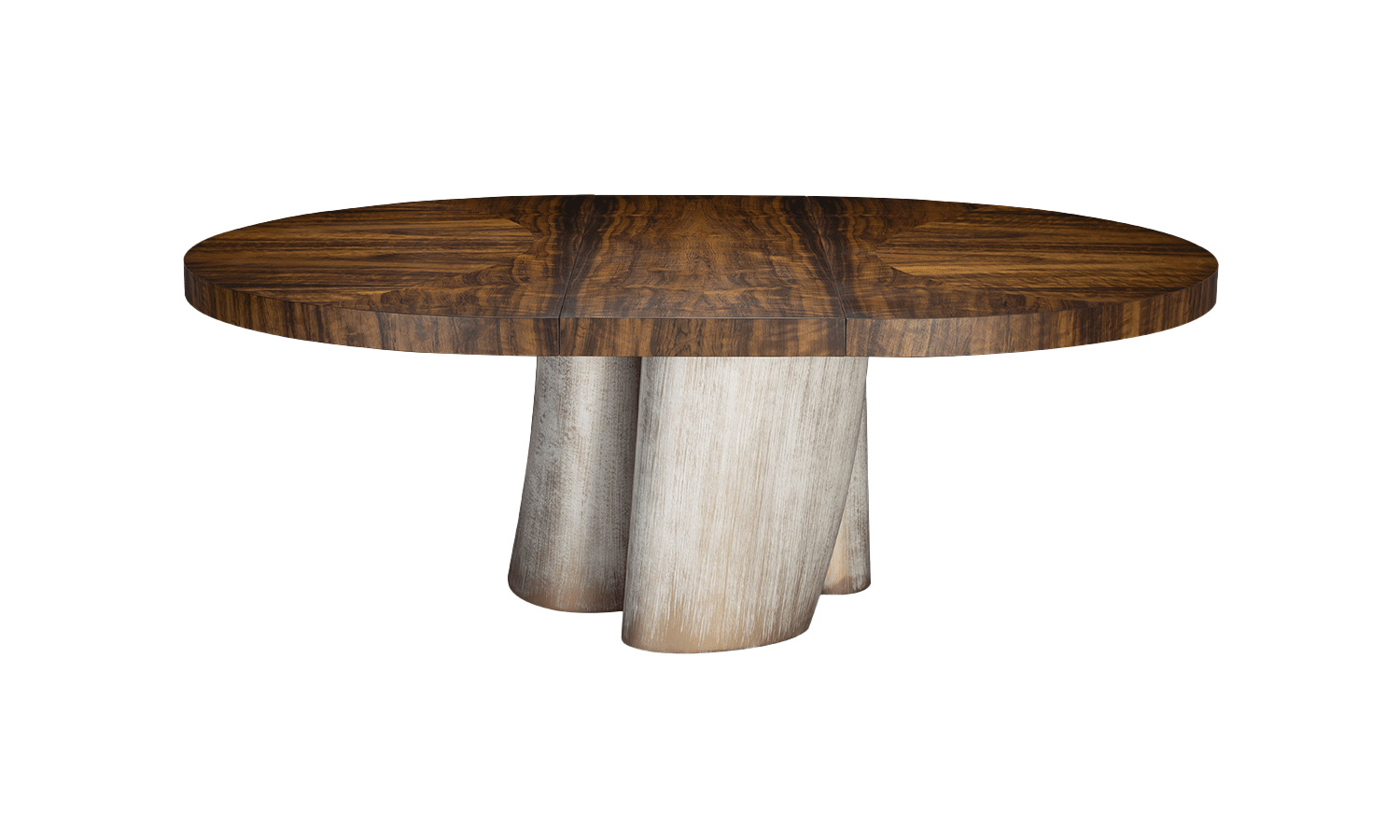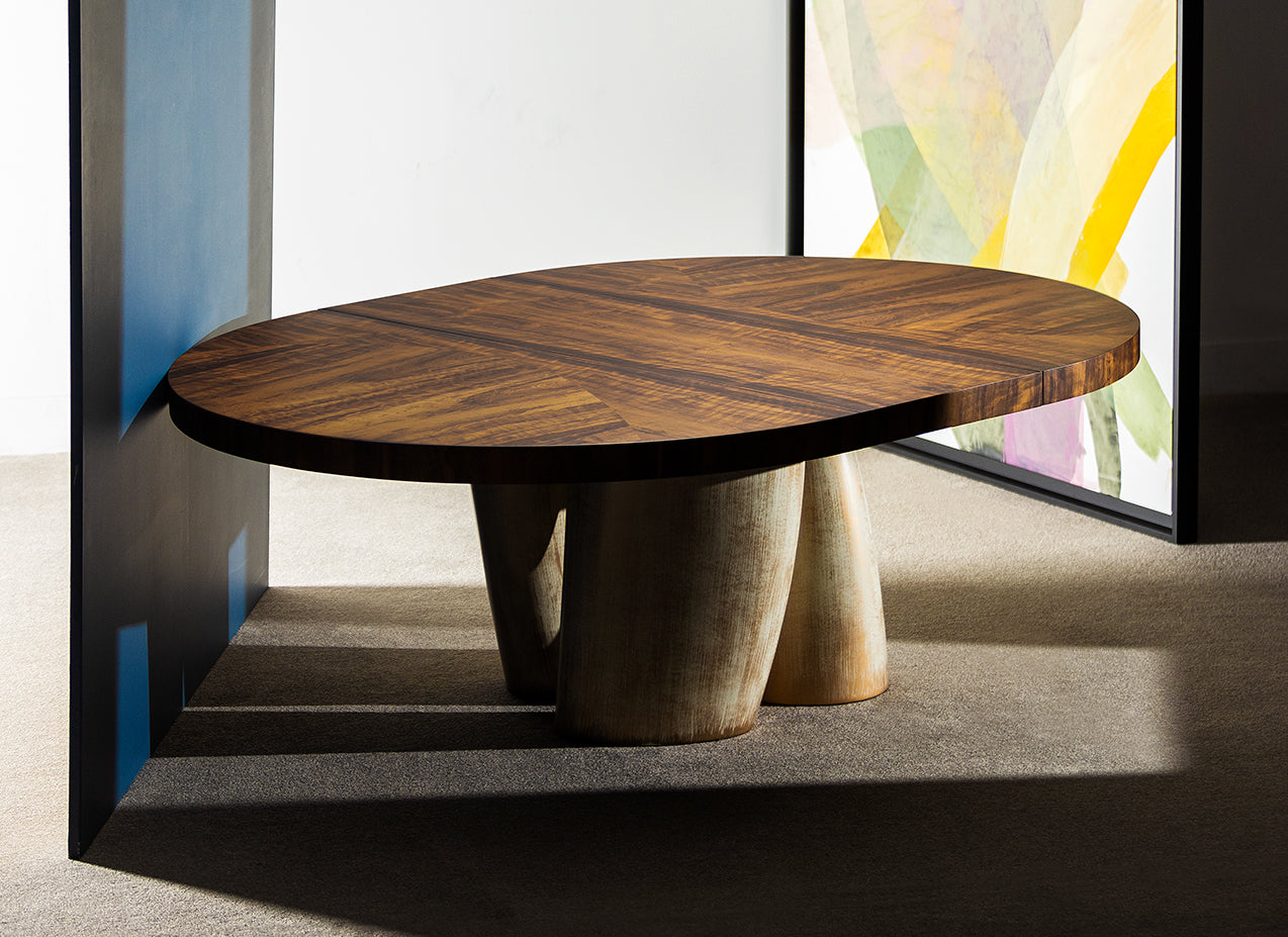 Mogambo is a dining table inspired by the African wilderness. The asymmetrically arranged bases recall the trunks of baobab trees, both their strength and balance, while its surface is a nod to their foliage. This table brings originality and appeal to any space by erasing angles and turning towards Hamilton Conte’s omnipresent curve. Its new extensible dining table combines style and practicality, allowing you to reconfigure easily from 4-6 chairs when closed to 6-8 when open, increasing its potential seating capacity that nonetheless encourages a convivial dining experience.