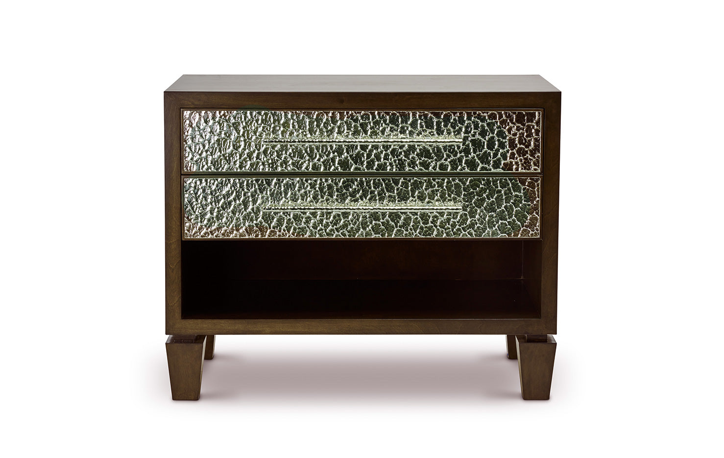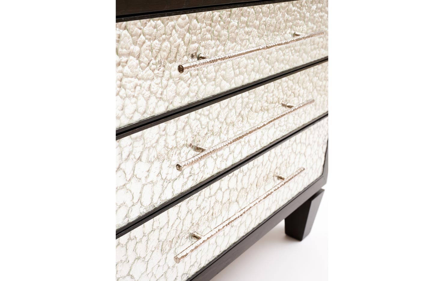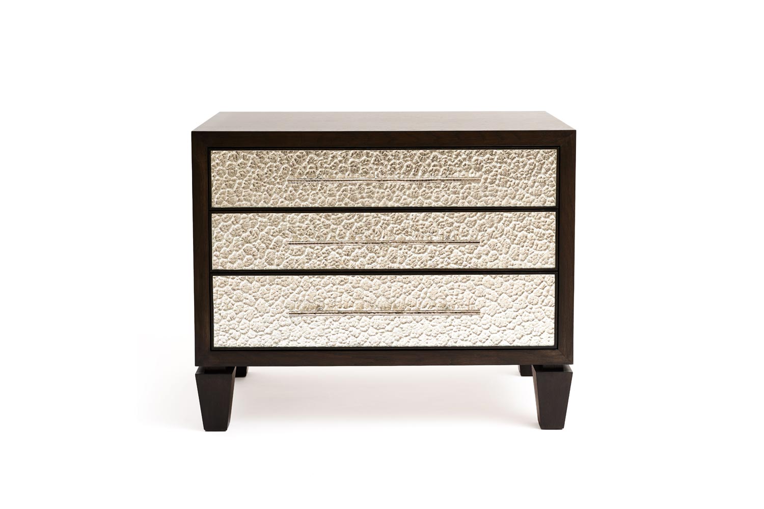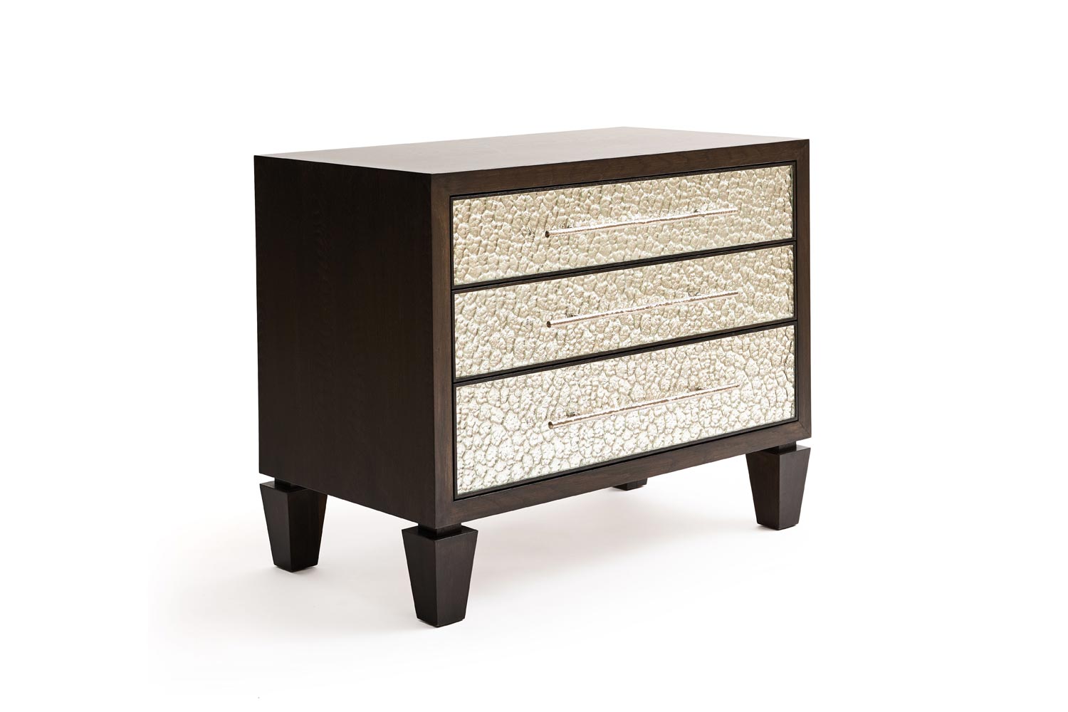 CASEGOODS FEATURE: All Erinn V. case goods are made to order in California using only the finest woods and metals, resulting in a richness of materials. Erinn V.’s modern-classic designs are highlighted by a range of fine details: hand-hammered hardware created specifically for each piece, hand-silvered mirrors in the most unique finishes, and sophisticated finishes such as gold leaf, which is gently applied and then glazed. All Erinn V. tables and cabinets are constructed using the same methods employed by fine European craftsmen for durability and unparalleled style, with modern technology like slow-close hardware on drawers and hinges. Erinn V. furniture is customizable for a one-of-a-kind feel, poised to be an heirloom of the future.