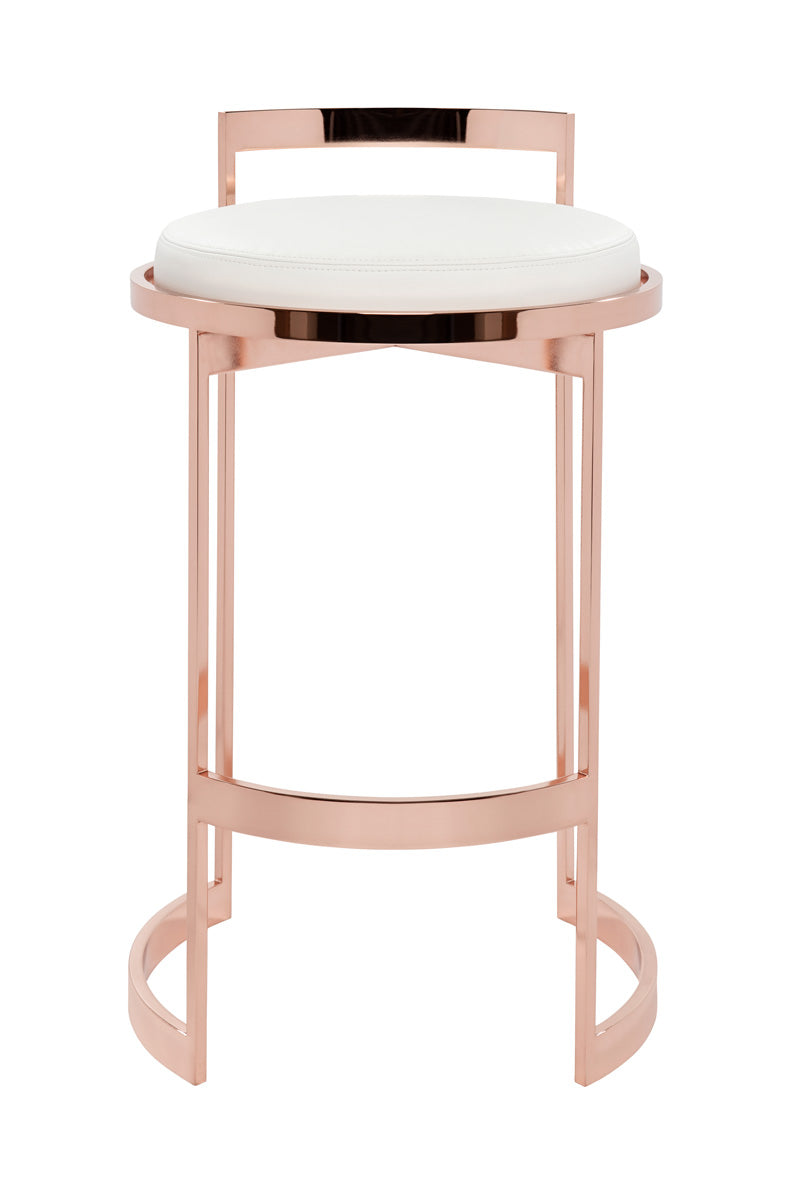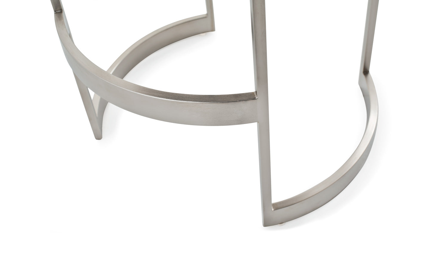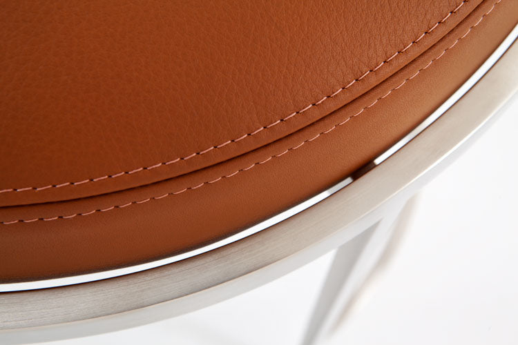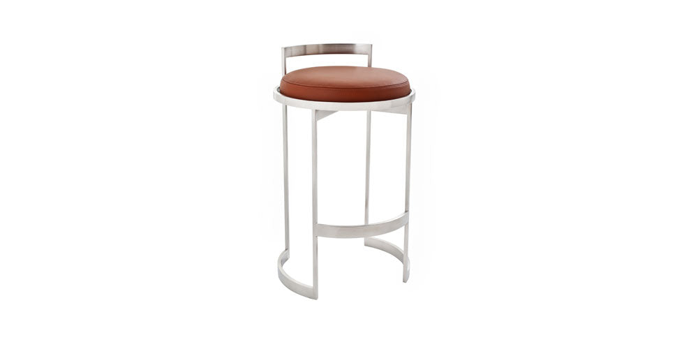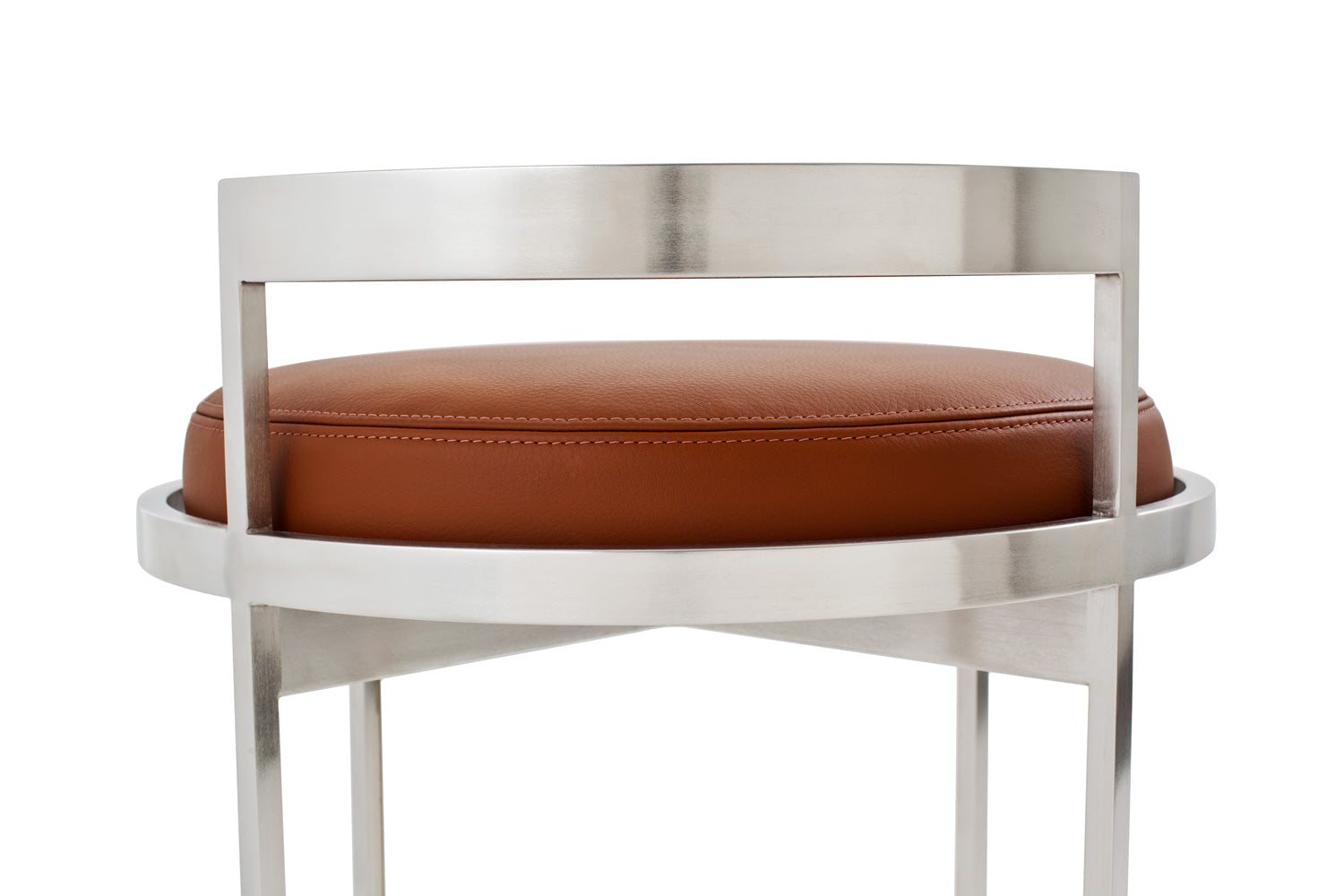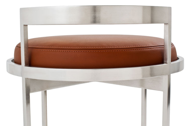 contemporary steel swivel stool with upholstered cushion seat and integrated backrest handle.