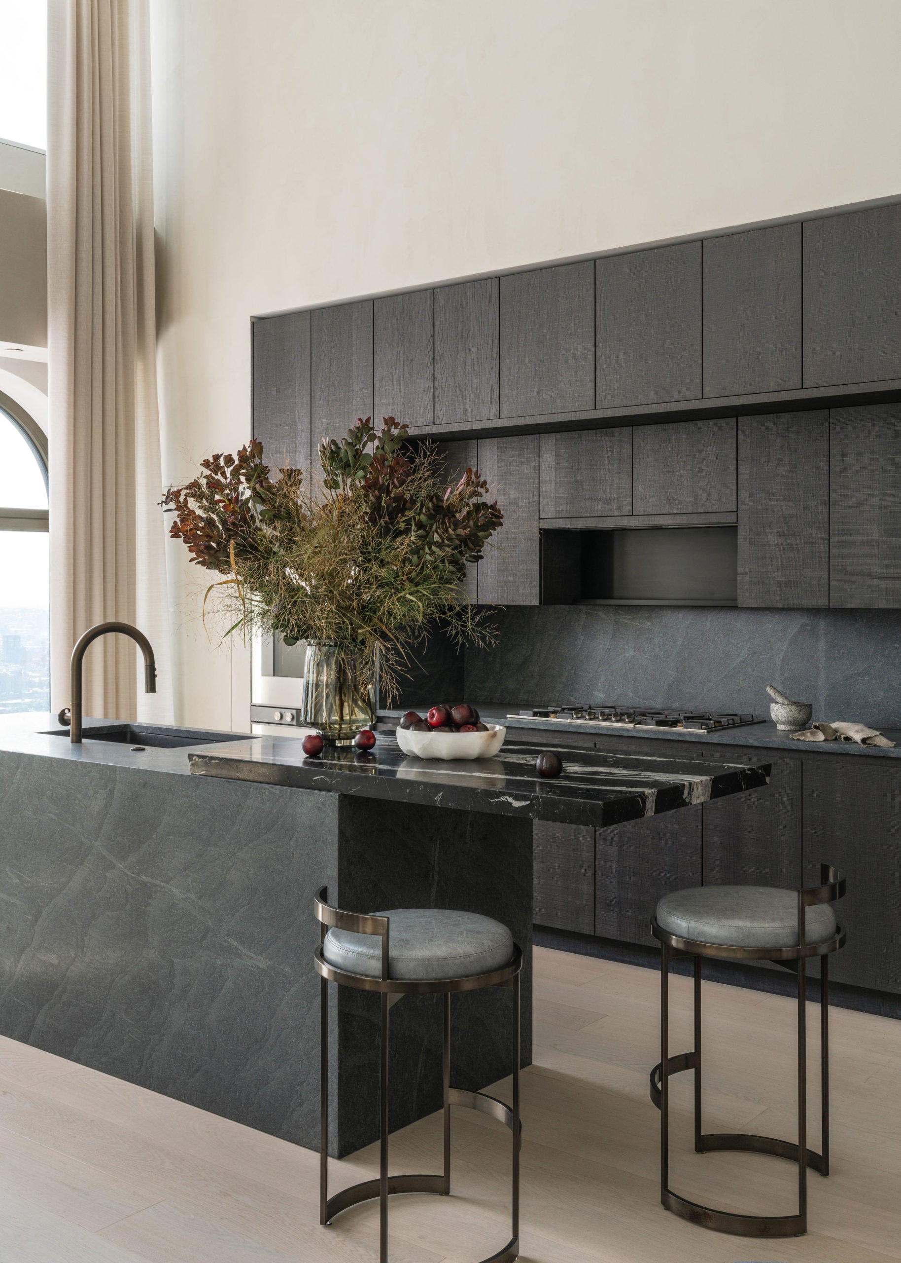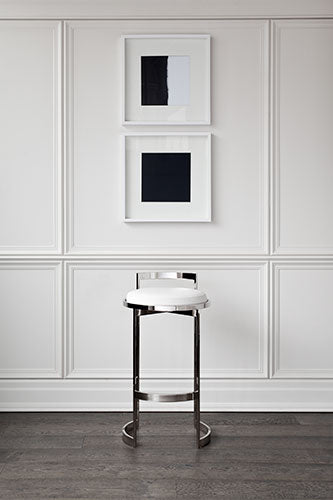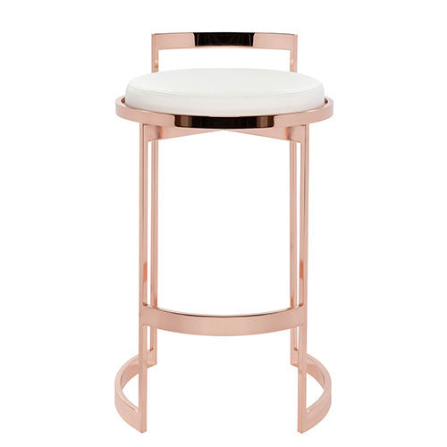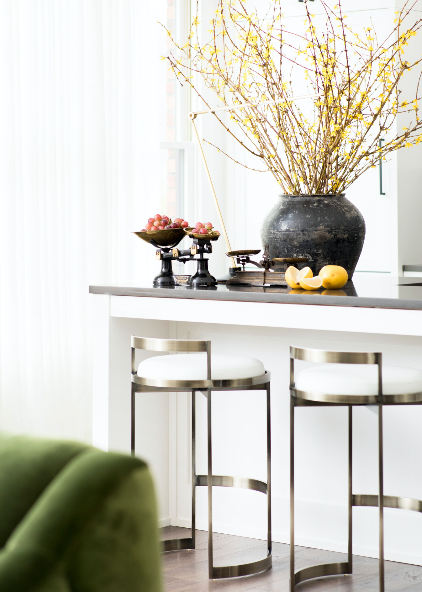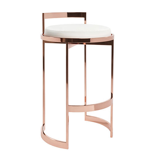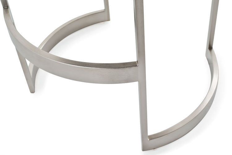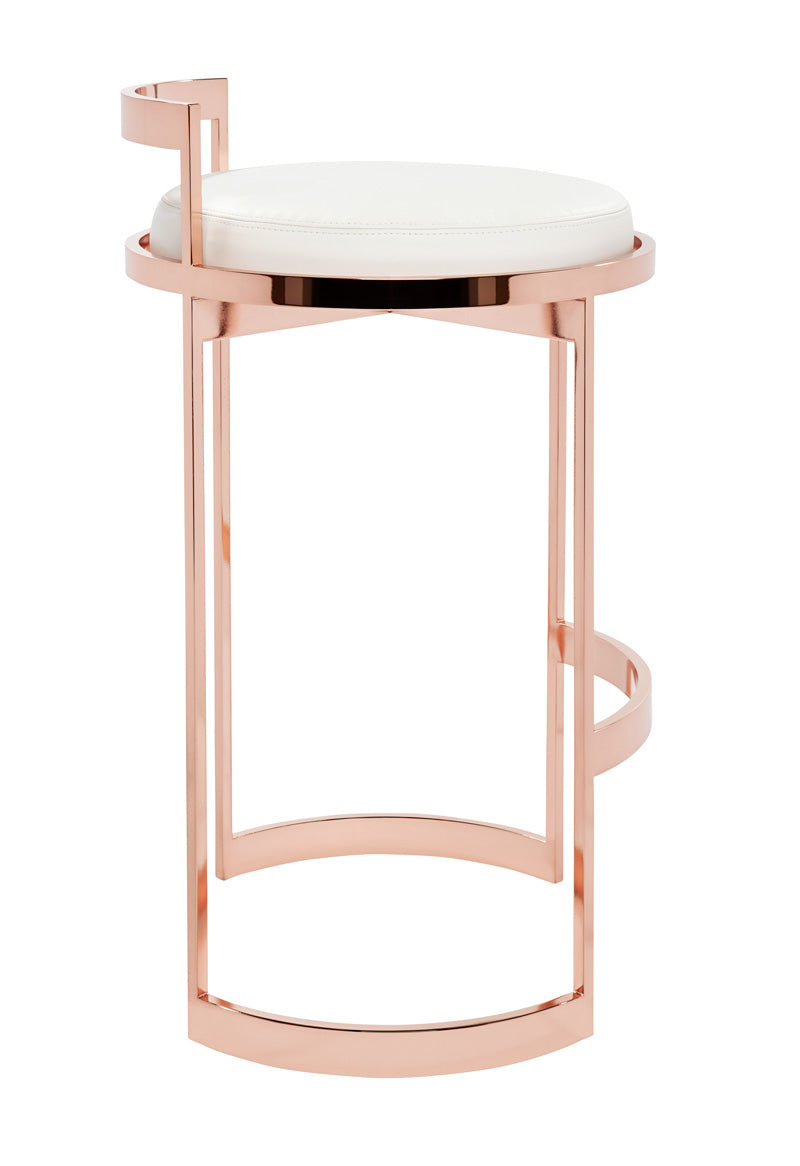 contemporary steel swivel stool with upholstered cushion seat and integrated backrest handle.
