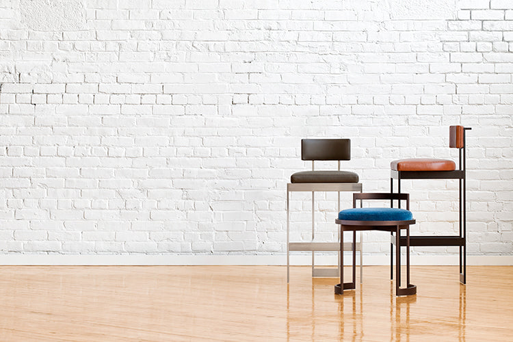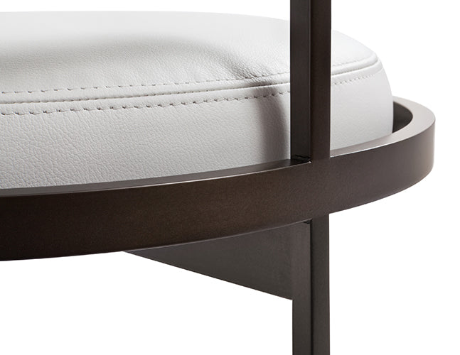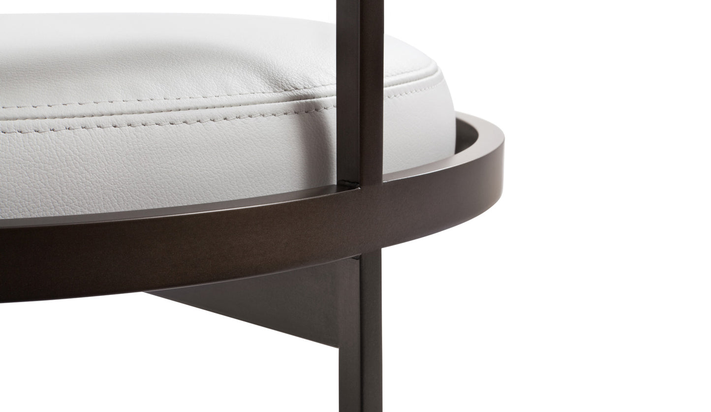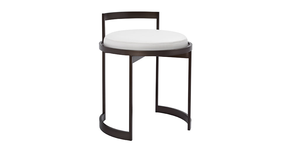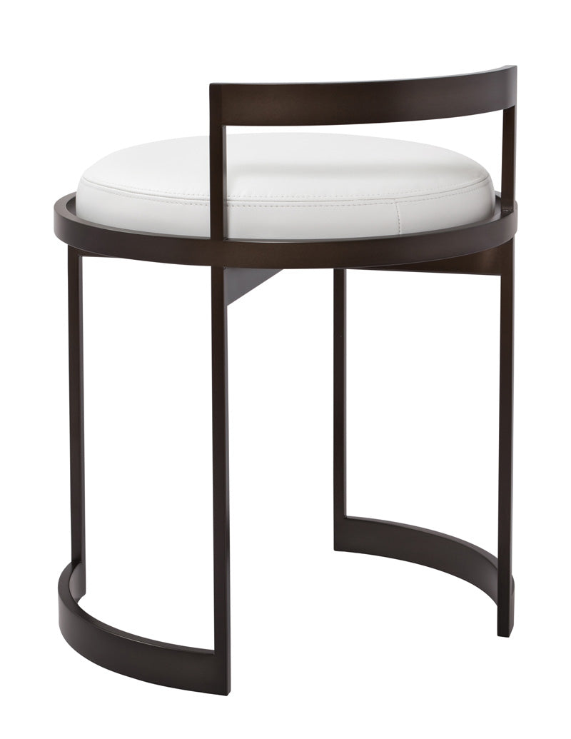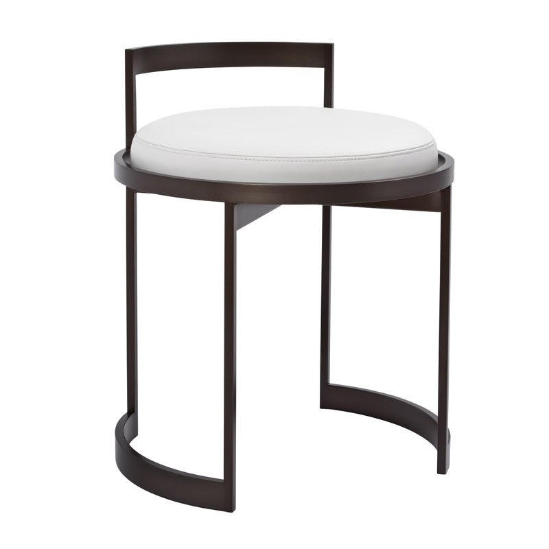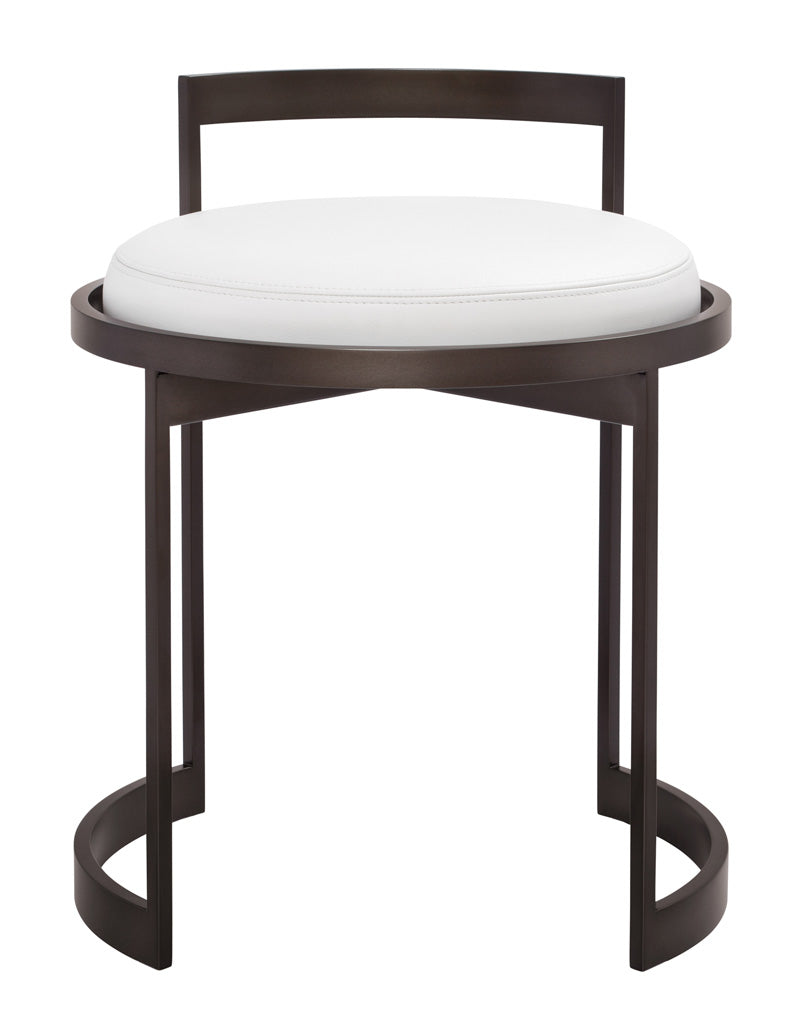 contemporary steel vanity stool with upholstered swivel seat cushion and stationary metal backrest/handle.