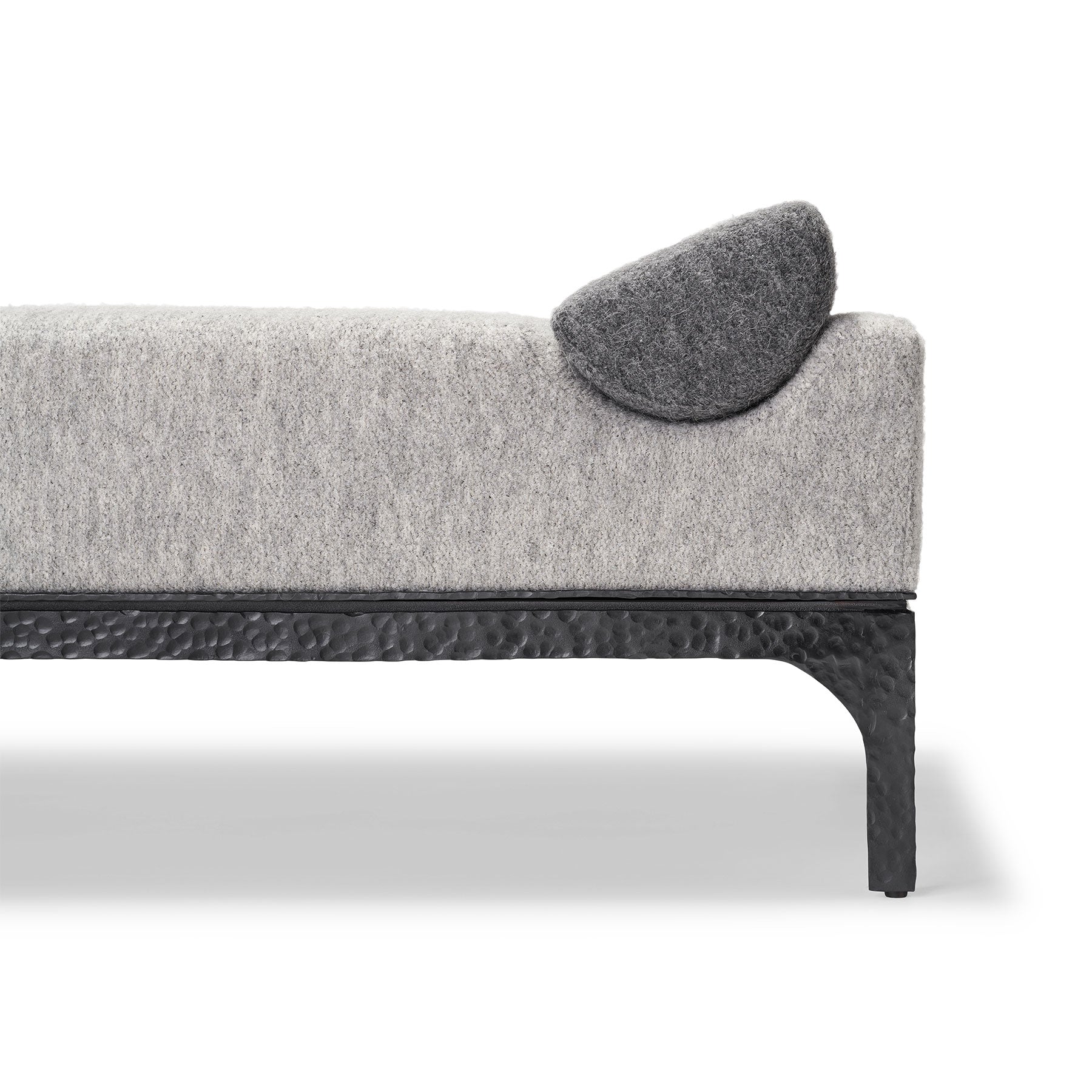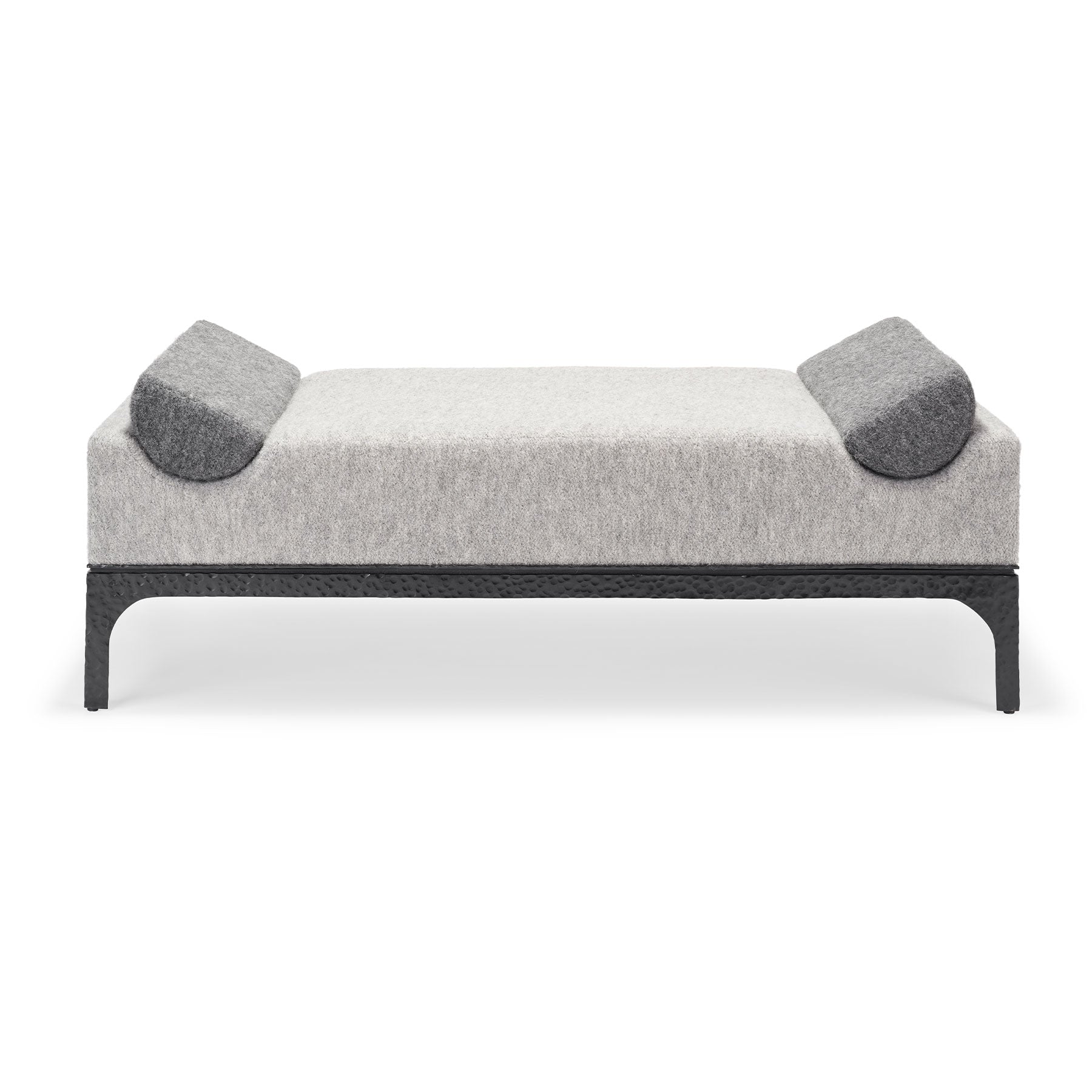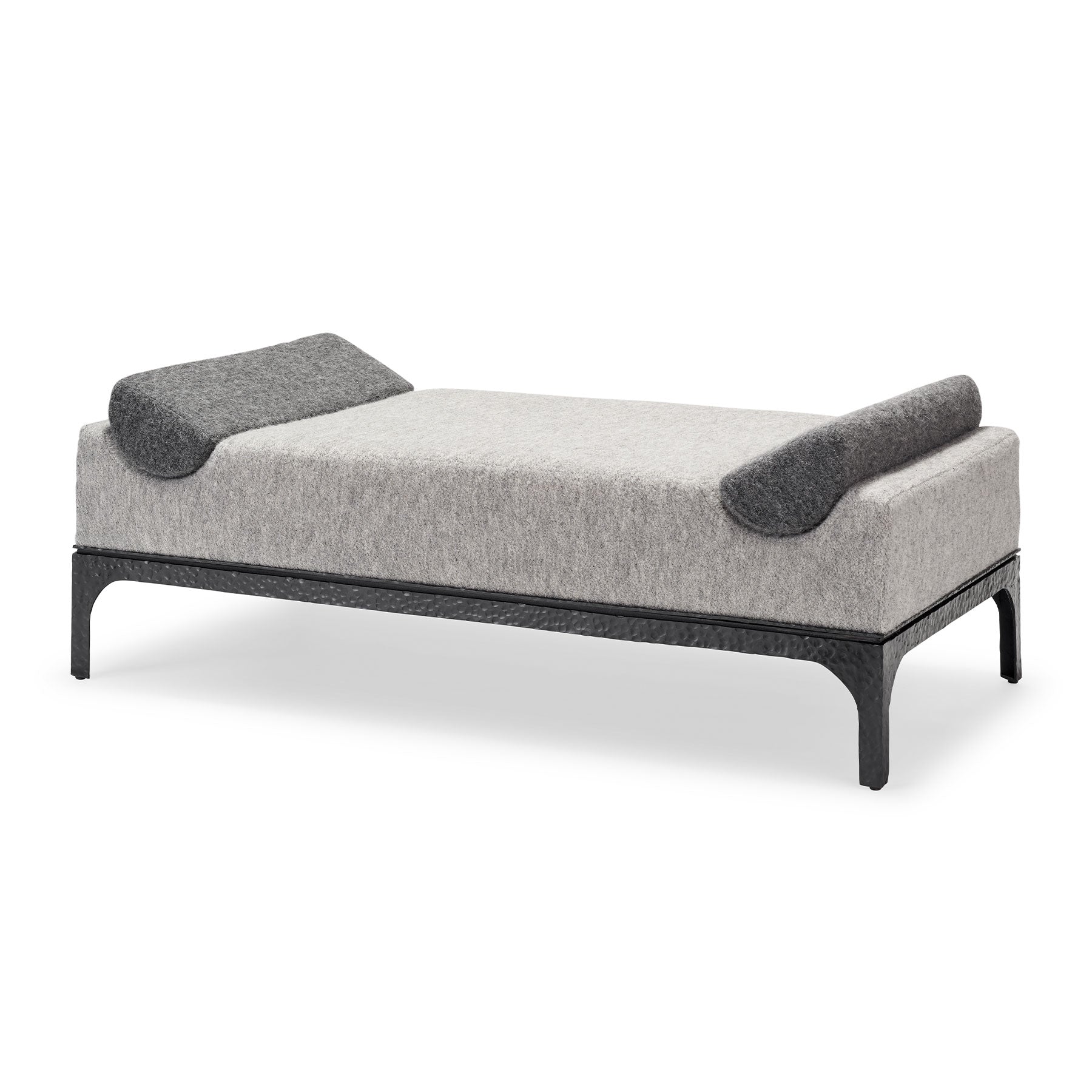 Nimmo was looking for luxurious, handmade outdoor furniture when he designed the Opio line. The Opio Bench features a hand-hammered iron base, with an attached seat cushion. The loose bolster pillows are adjustable for maximum comfort.