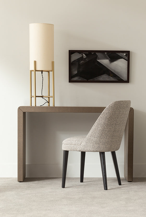 This veneered console / desk is available in oak with standard finishes. An upholstered version in faux Shagreen or alternative materials are available. Other sizing, finishes and materials are possible.