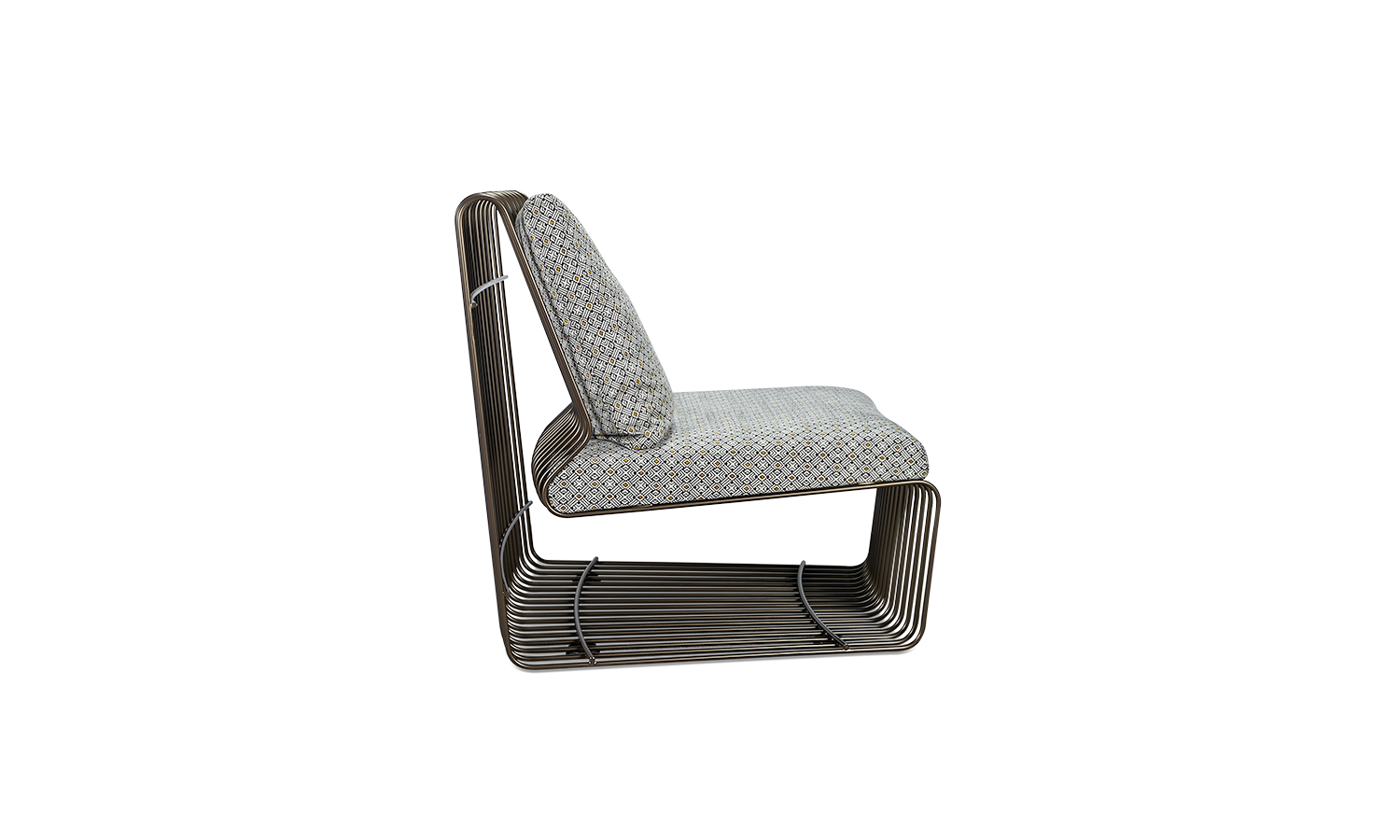 This lounge chair with enamelled iron structure in Bronze or Anthracite finish is available Cat. I-VI fabrics and leathers (2,3 m / un.).