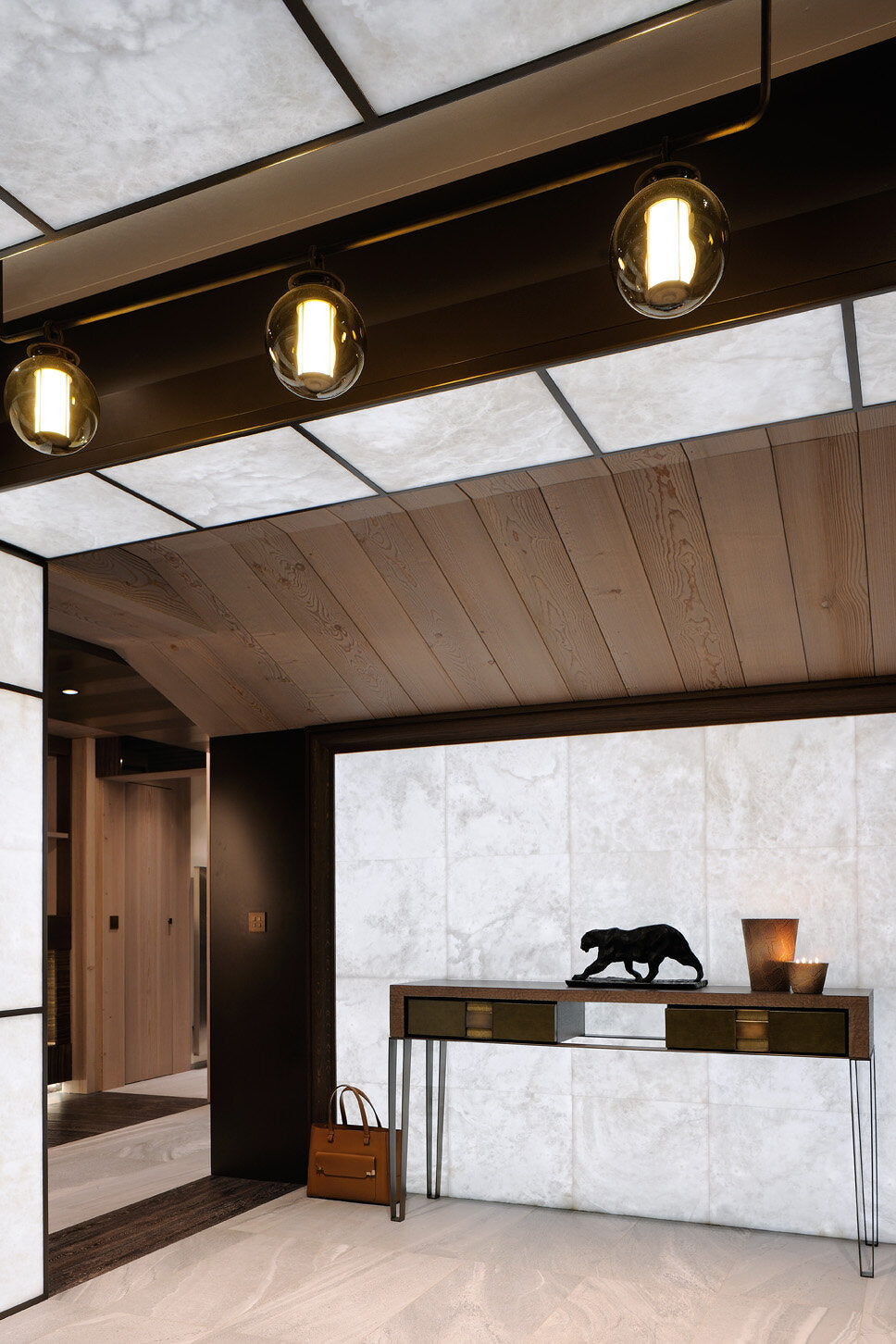Top in Gouged oak natural , Bronze Medaille stainless steel feet and handles