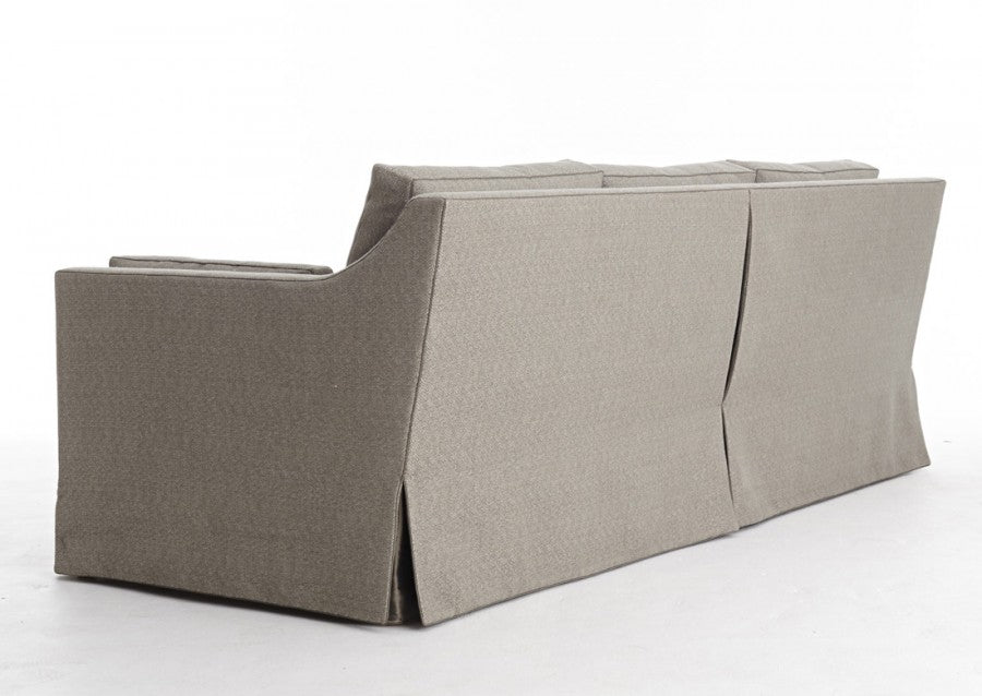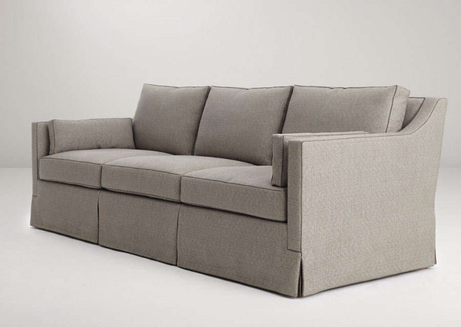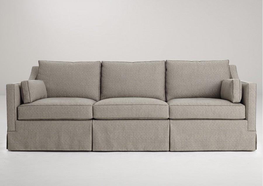 Loose seat, back and arm cushions, boxed with self welt, 50/50 down and feather fill. Self welt detailing on frame. Dressmaker skirt from deck with notch detail at arms and pleats at cushion divisions, corners and back. Standard skirt allowance is ¼”.
