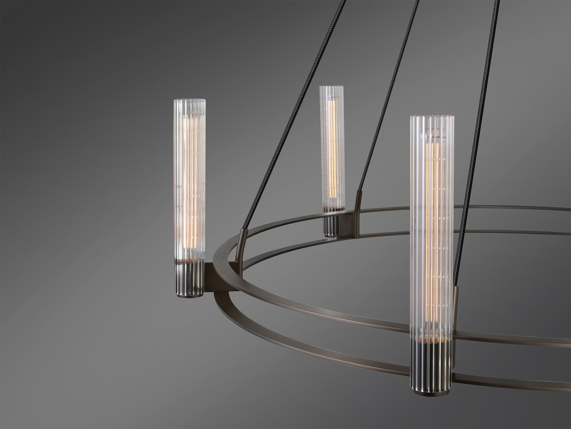 The Pastis Circular Chandelier is machined from solid brass. All parts are hand polished and patina’d. The reeded borosilicate glass shades are notched to delicately rest on each brass arm.