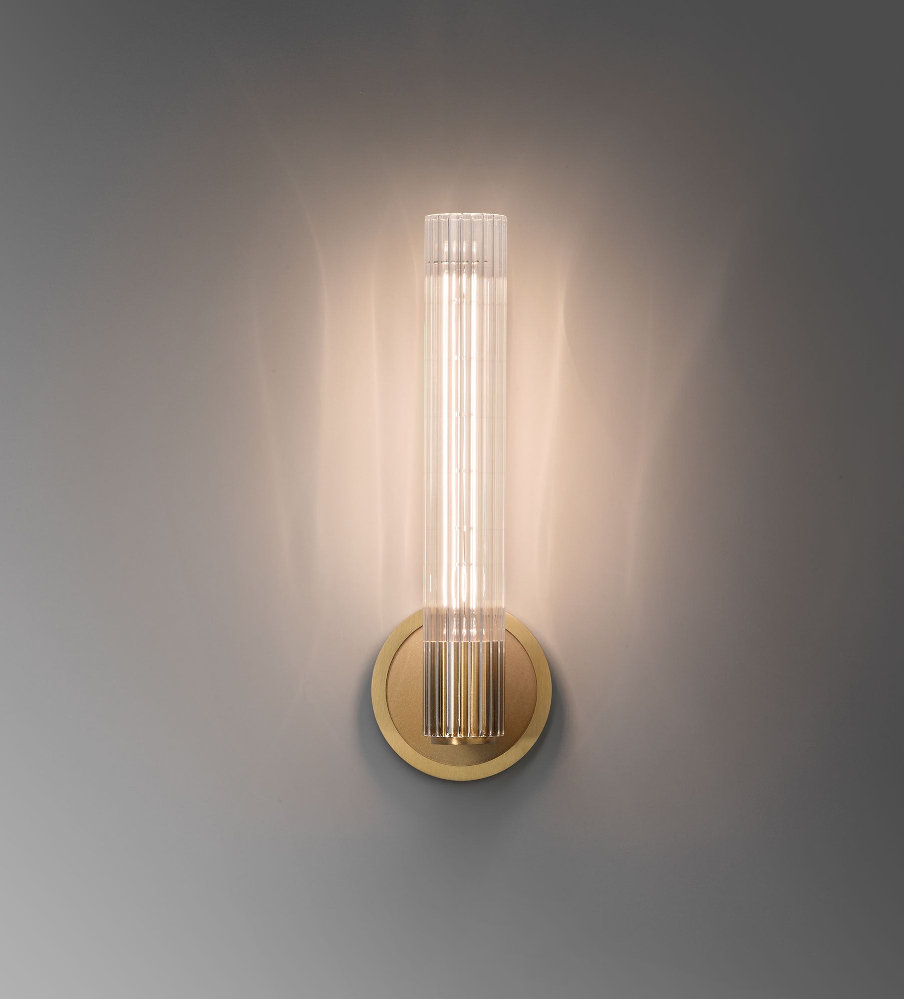 The Pastis Sconce is machined from solid brass. All parts are hand polished and patina'd. The reeded borosilicate glass shade is notched to delicately rest on the brass arm.