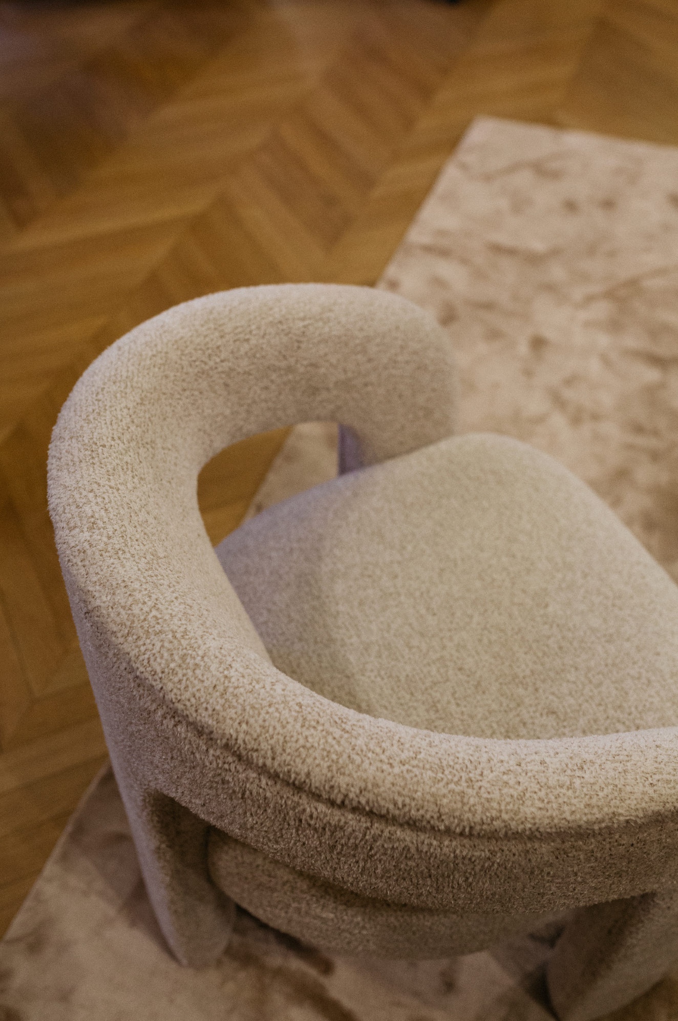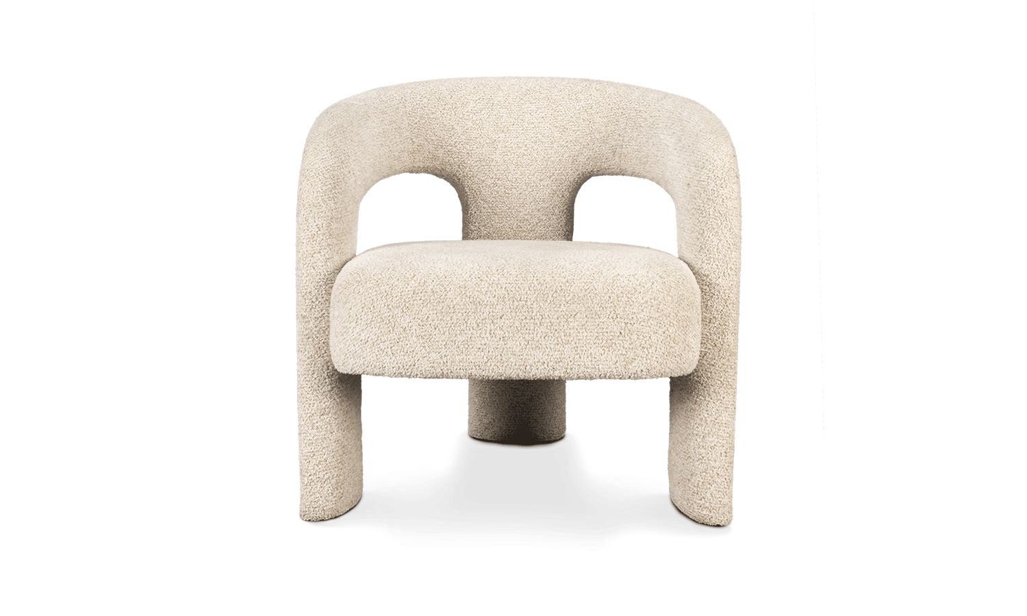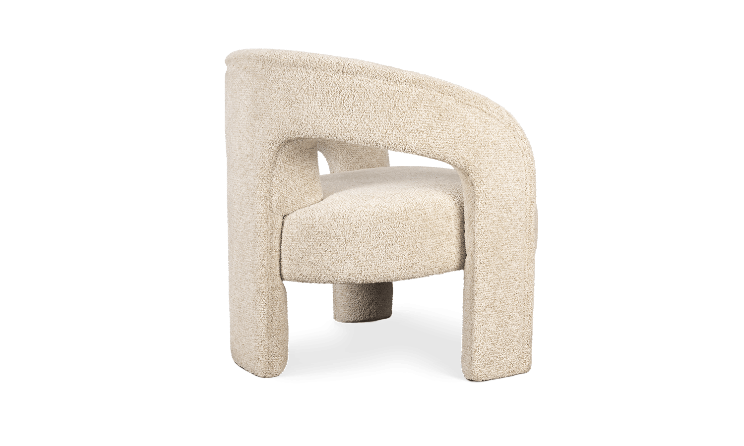 Three legs, linked together in a rounded, playful shape, enclose a soft seat.