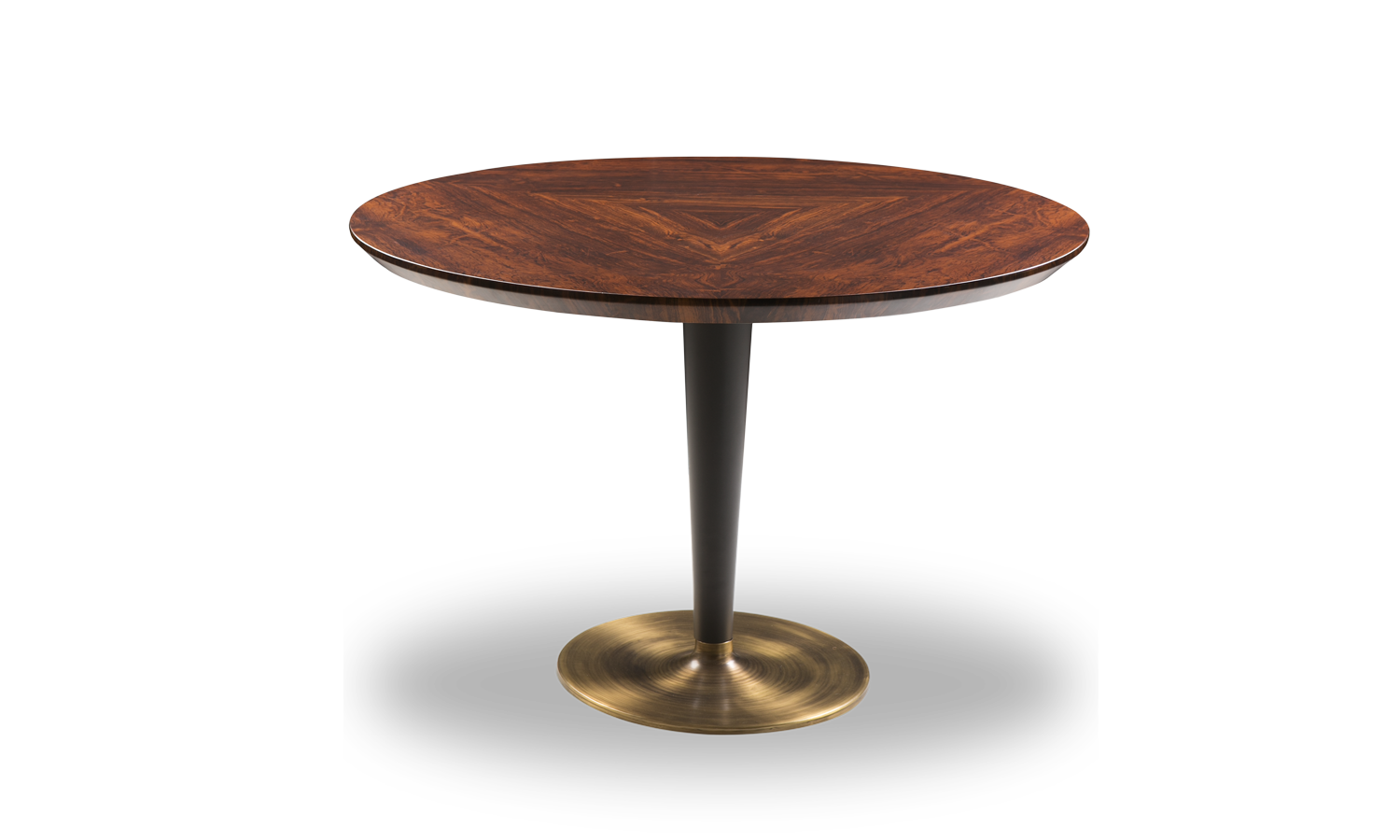 This game table features an enamelled metal column and brushed brass base with a surface in diamond veneered imbuia. Other finishes and sizes are available on request.