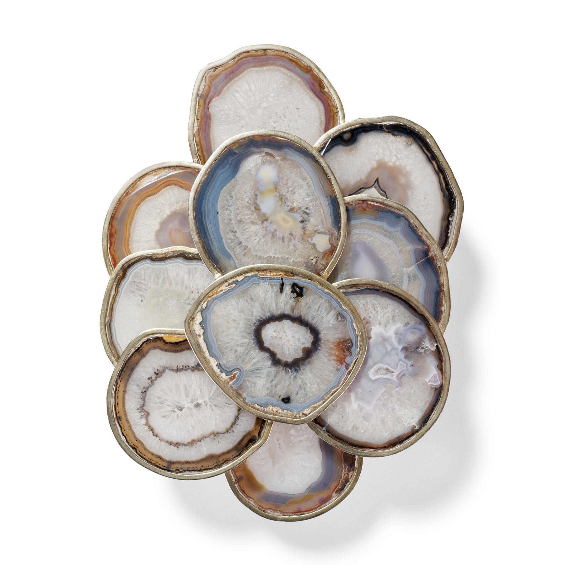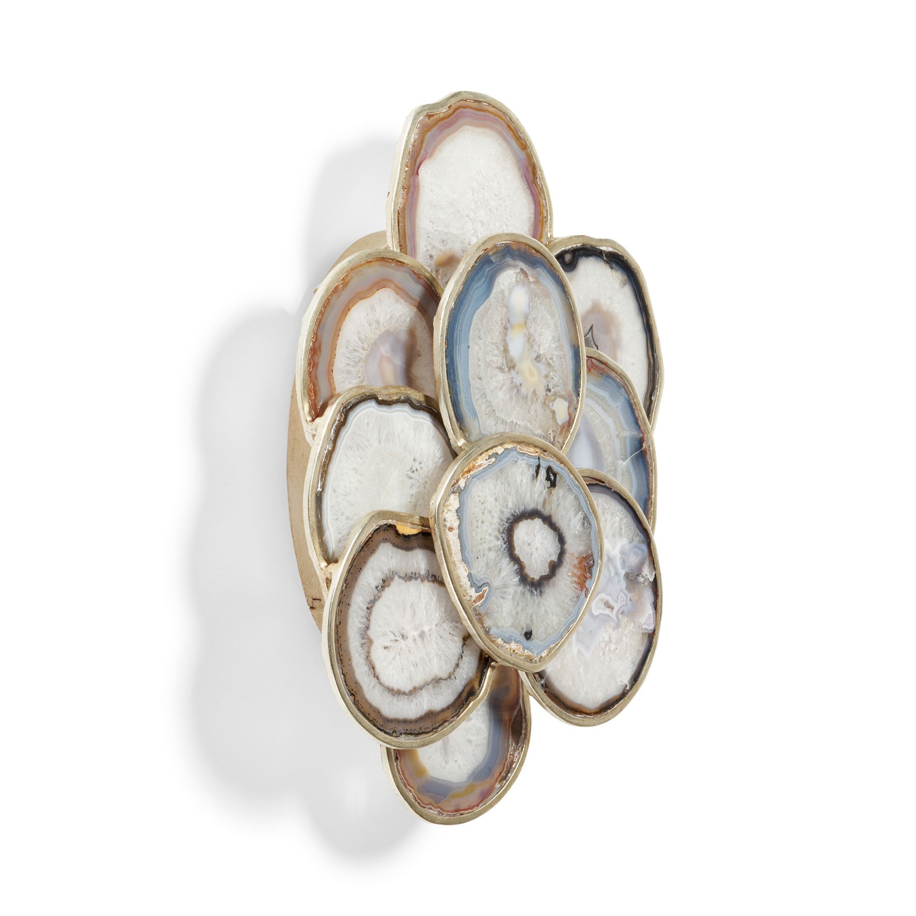 Beautiful, multi-colored agate slices adorn this stone-centric sconce. When illuminated, the beauty and individuality of each hand-picked stone glows. Because the colors and agates are customized, no two sconces are alike. Fittingly, pietra means “stone” in Italian.