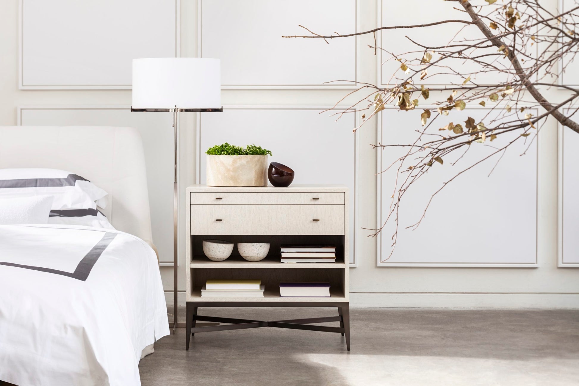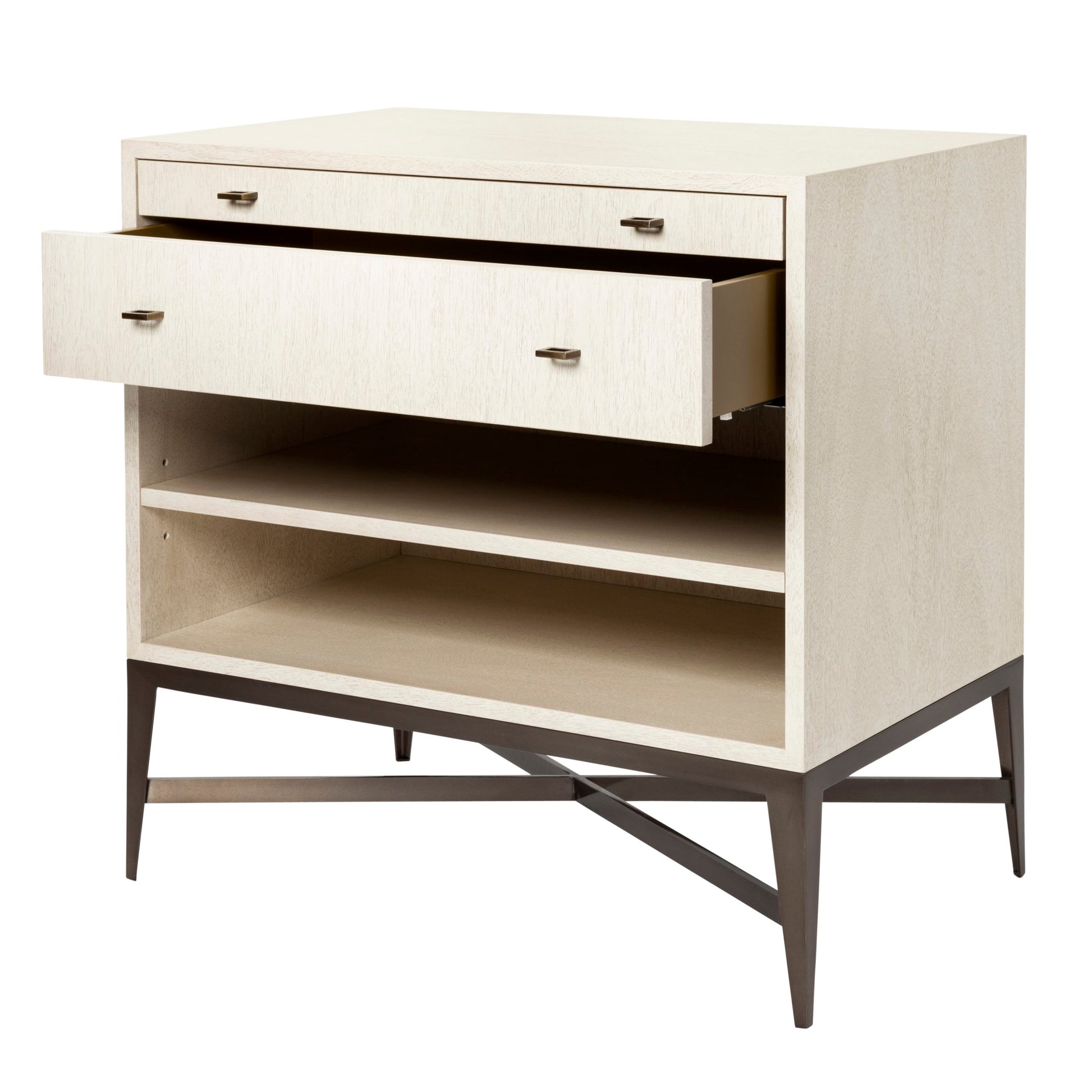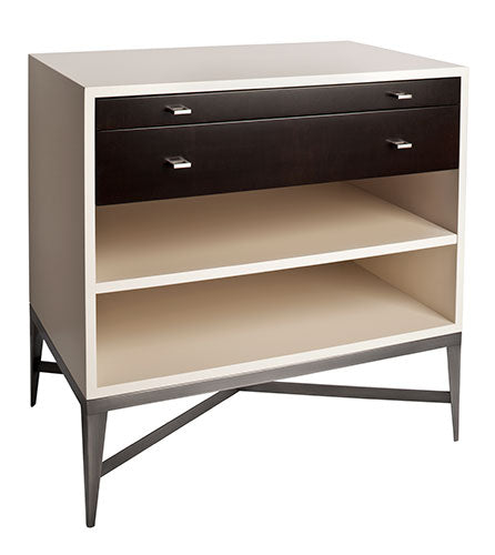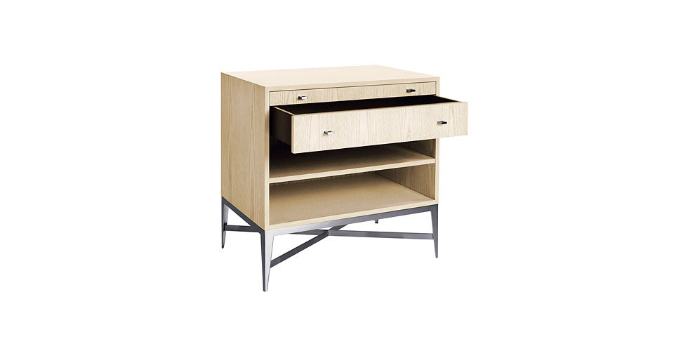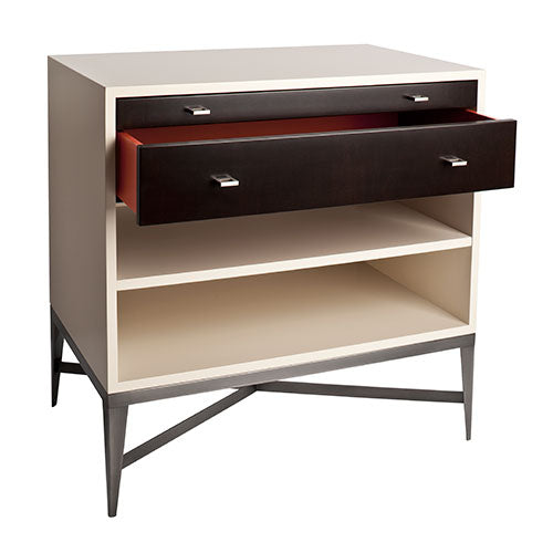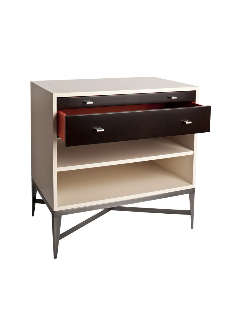 wood chest atop a plated steel base with inset glass tablet, single drawer and adjustable shelf.