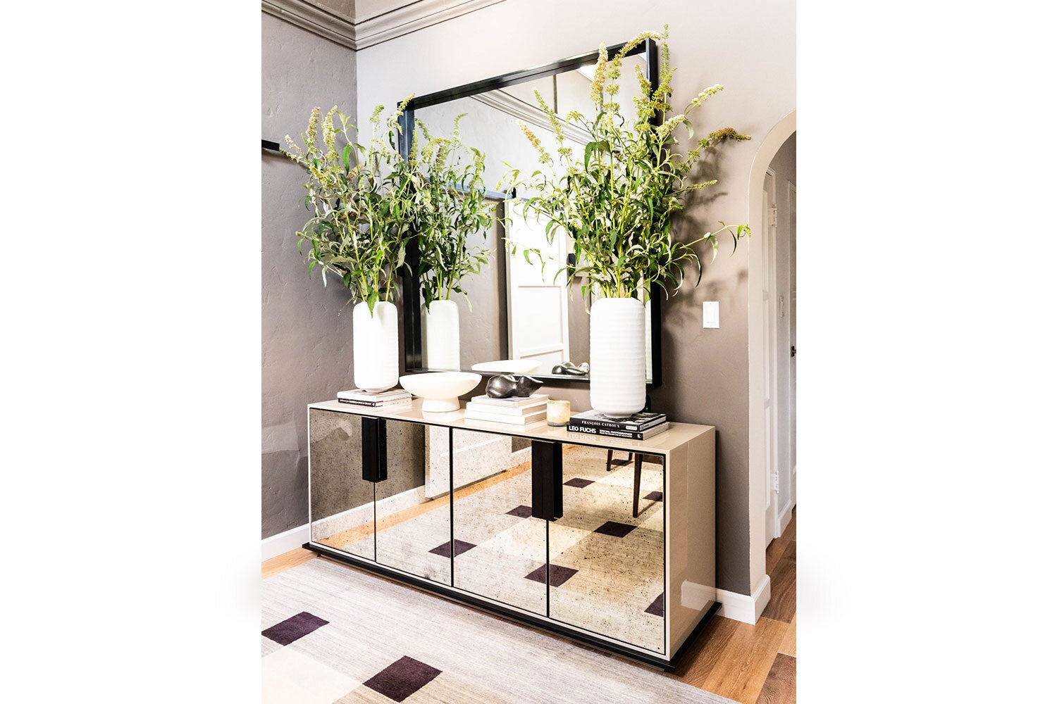 CASEGOODS FEATURE: All Erinn V. case goods are made to order in California using only the finest woods and metals, resulting in a richness of materials. Erinn V.’s modern-classic designs are highlighted by a range of fine details: hand-hammered hardware created specifically for each piece, hand-silvered mirrors in the most unique finishes, and sophisticated finishes such as gold leaf, which is gently applied and then glazed. All Erinn V. tables and cabinets are constructed using the same methods employed by fine European craftsmen for durability and unparalleled style, with modern technology like slow-close hardware on drawers and hinges. Erinn V. furniture is customizable for a one-of-a-kind feel, poised to be an heirloom of the future.