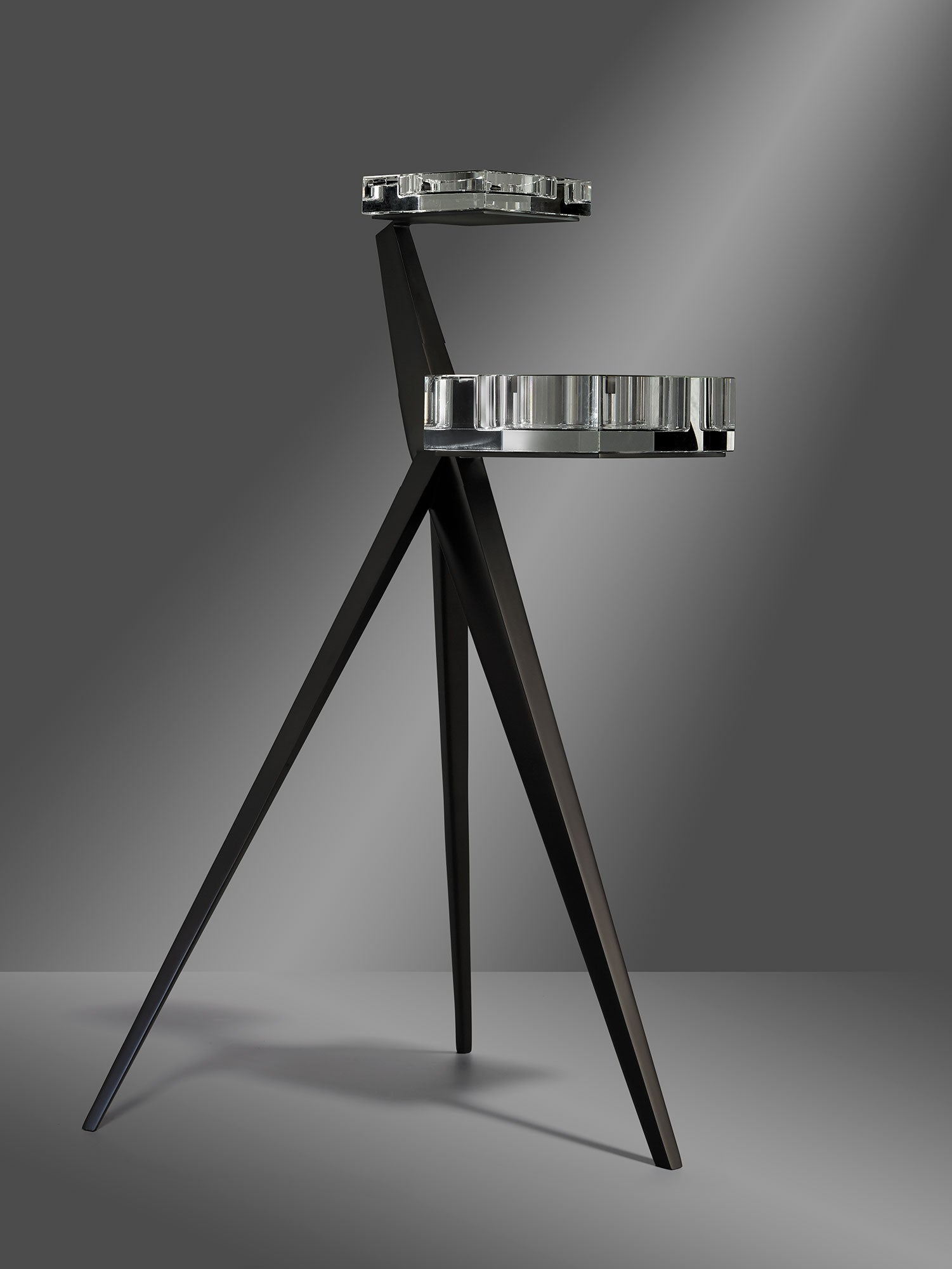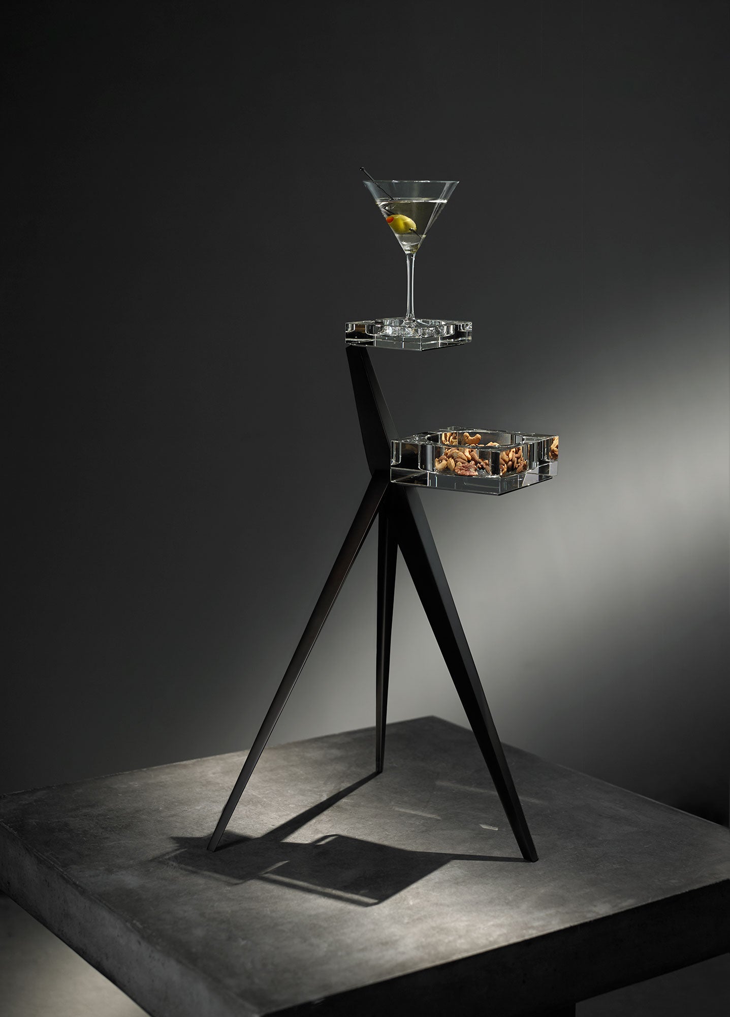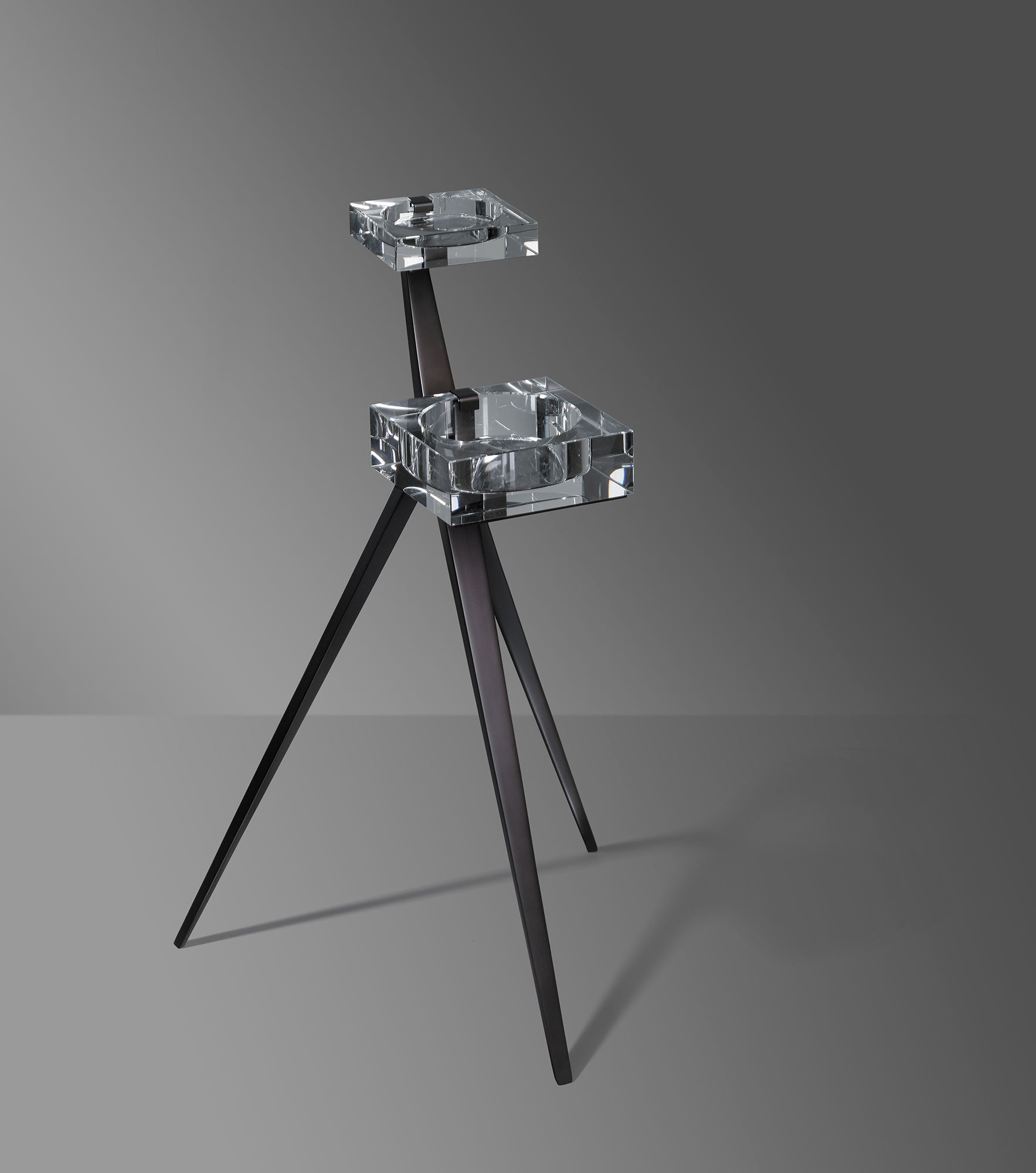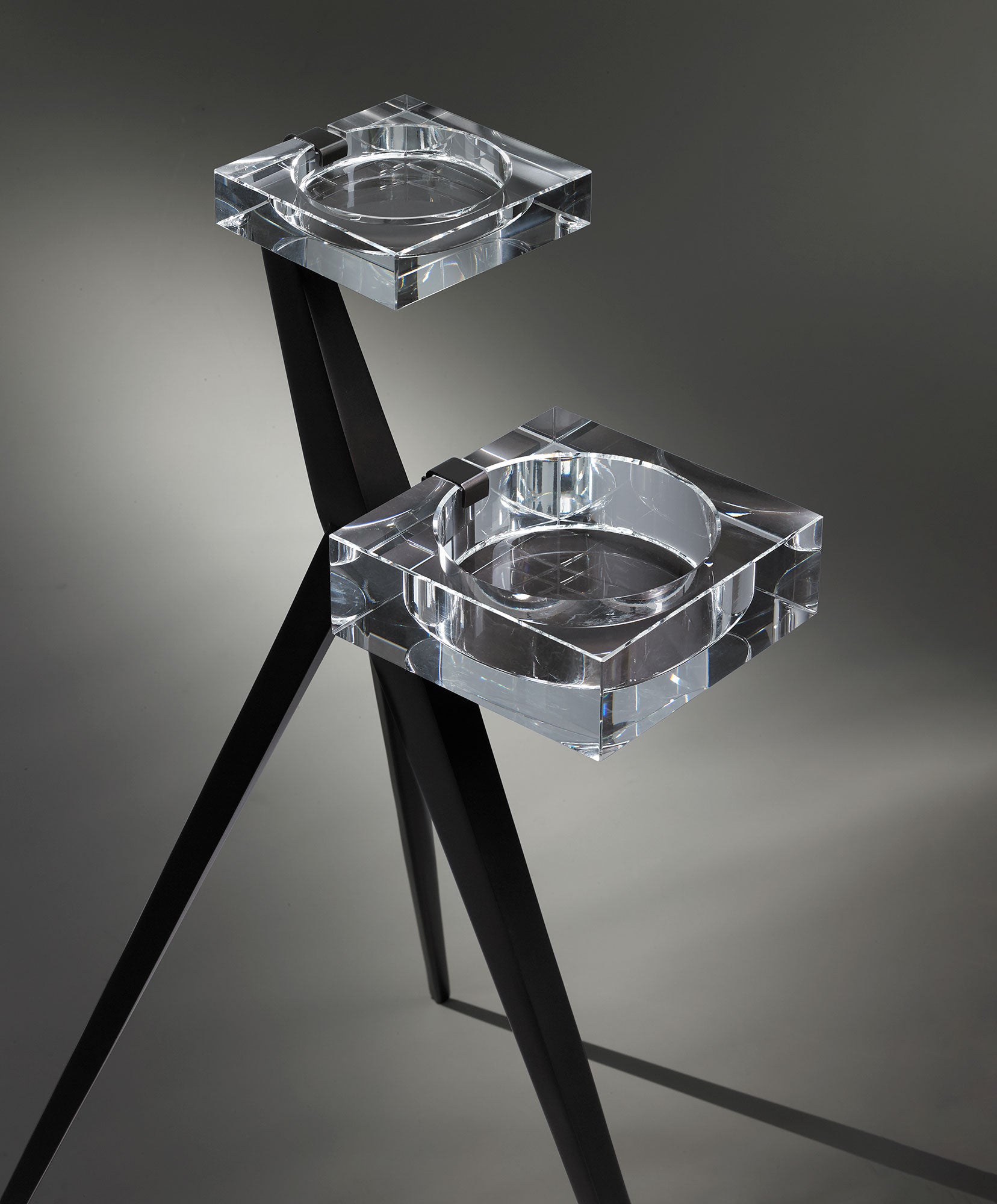 The Quentin Cocktail Table is made by hand from thick-walled brass. All parts are hand polished and patina’d. The crystal trays are machined and polished by hand.