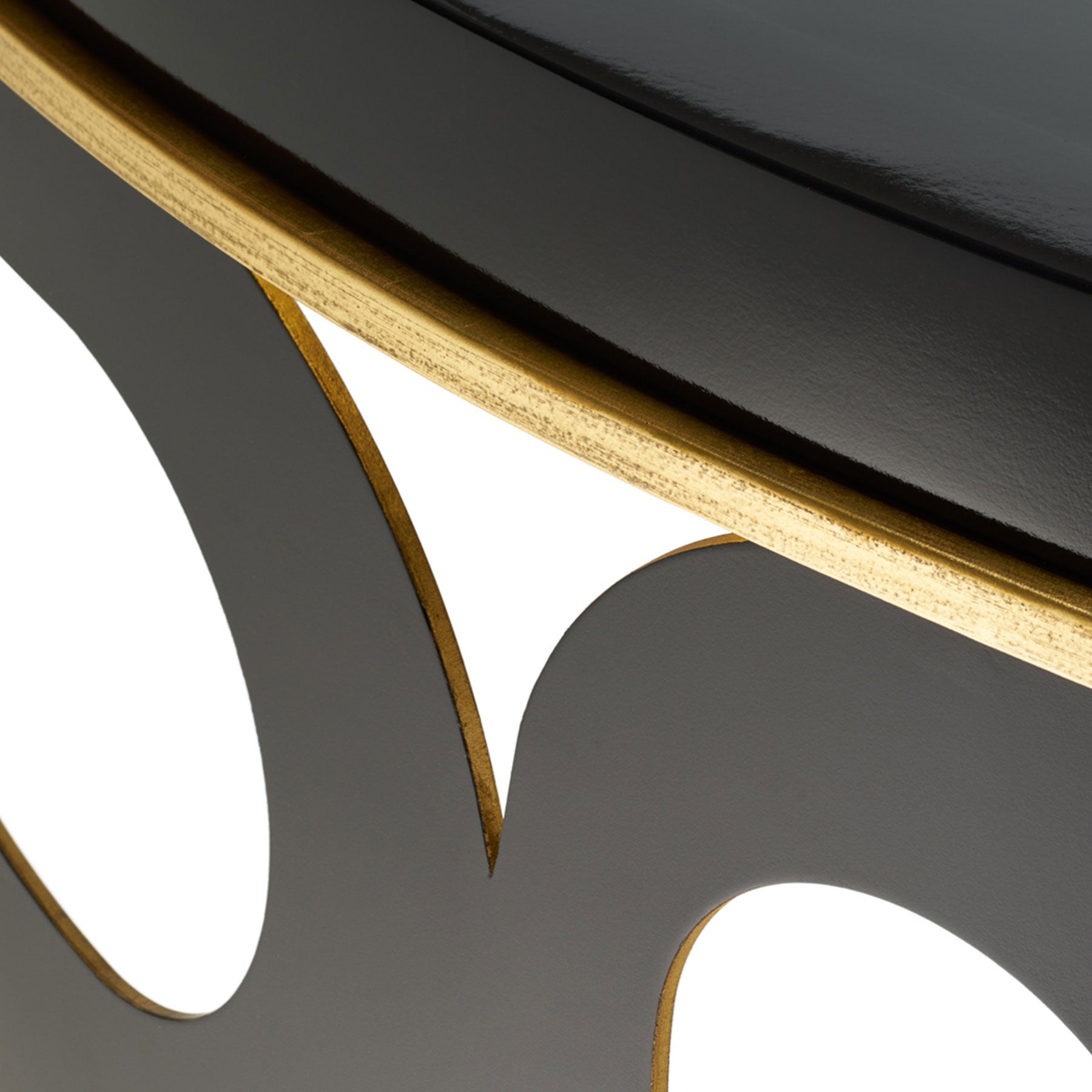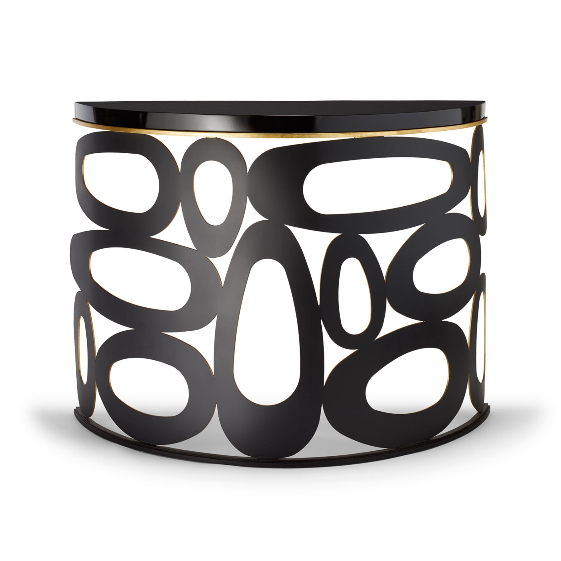 Inspired by stacked stones in nature, the Ramona Console is a series of ovals with cutouts in the middle. It’s all about round shapes. The contrast between the dark exterior and the gilded gold leaf interior creates glimpses of gold as you walk past. Add to that an ebonized walnut top and the signature lip holding the tabletop, and you’ve got quite the sensational piece of furniture.