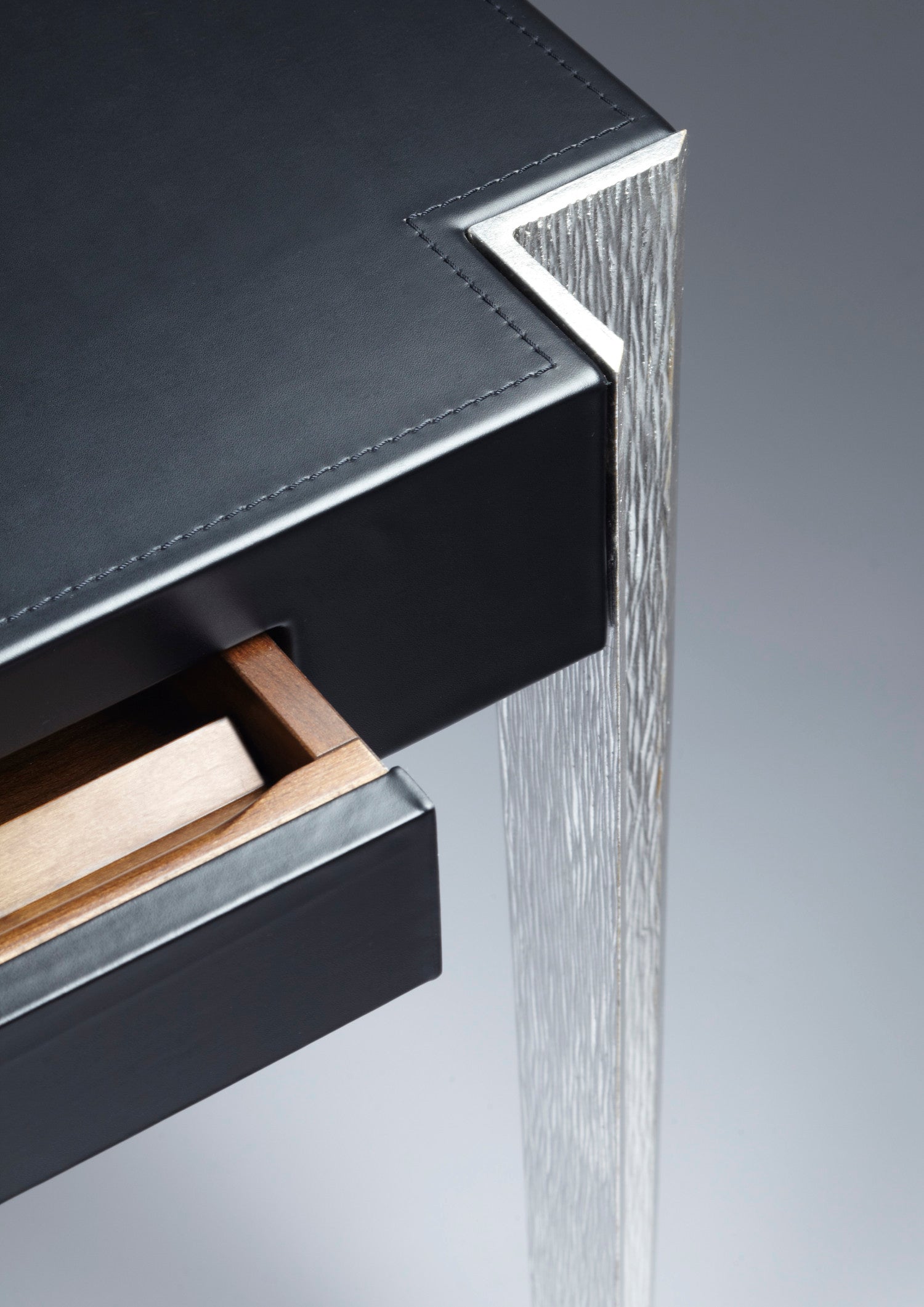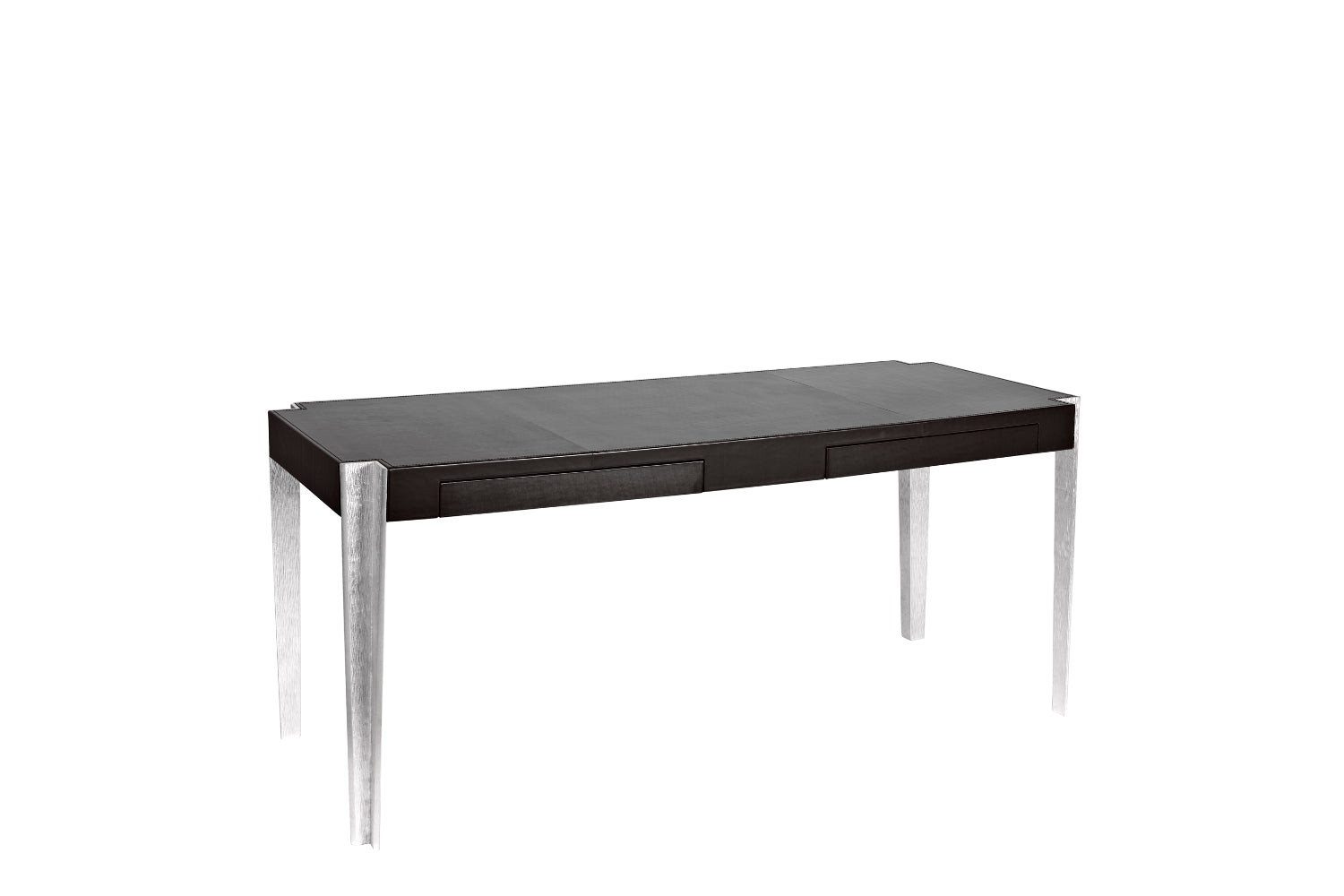 With simple lines the Ray bureau underlines its purity through the rarity of its constituent materials and the delicacy of its composition. The legs in bronze with white gold-leaf patina support a plateau upholstered in overstitched leather. Meticulous technique and respect for the natural material serve to produce a matt grain and an unrivalled subtleness to the touch.
