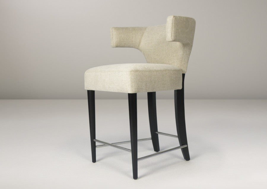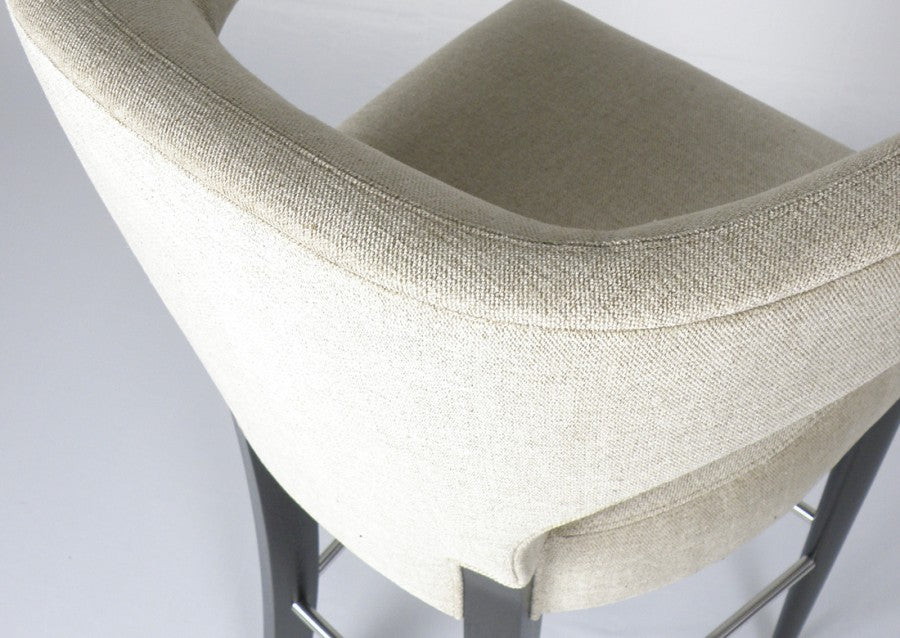 Tight boxed seat with tight curved back. Double topstitching on frame. Tapered legs in standard mahogany finishes. Stretchers with brushed stainless steel at front on stools.