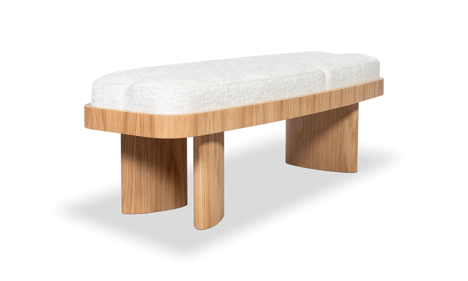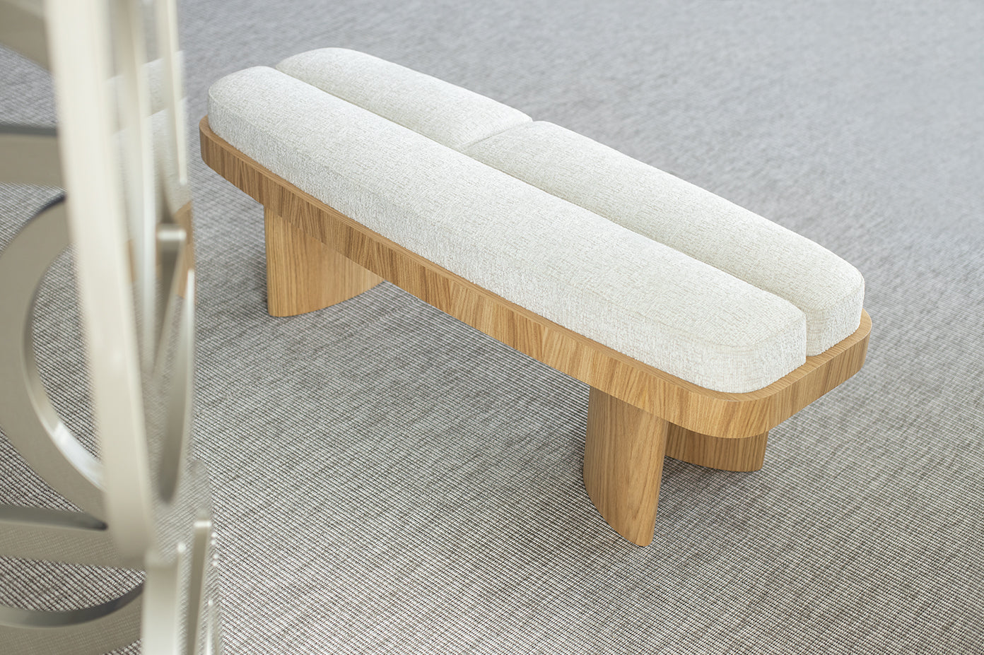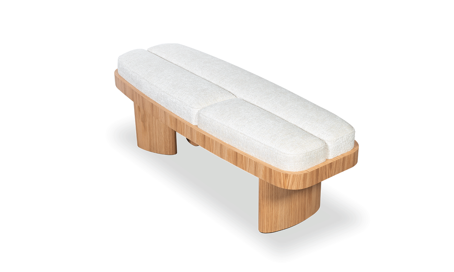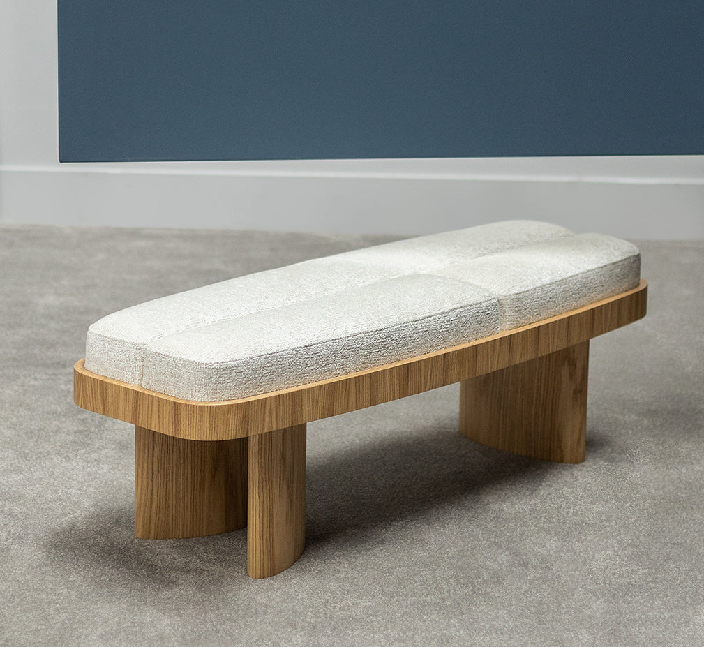 Showcasing solidity and strength, the Selma bench walks the line between symmetry and asymmetry. Its symmetrical,rounded rectangular shape combines perfectly with an upholstered top in three parts and asymmetrical legs of of different sizes.