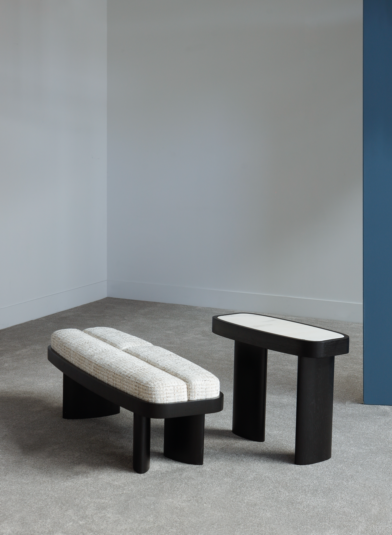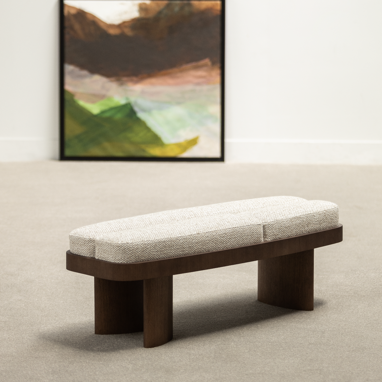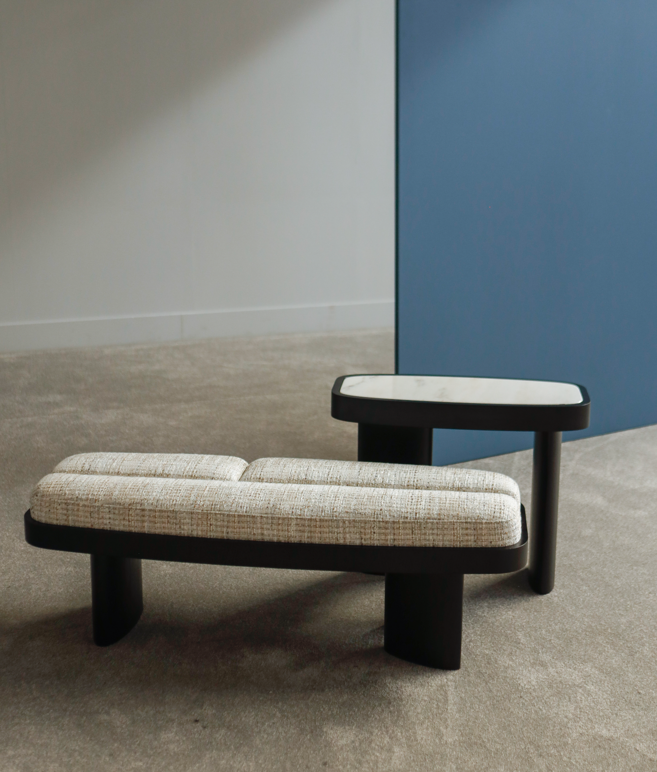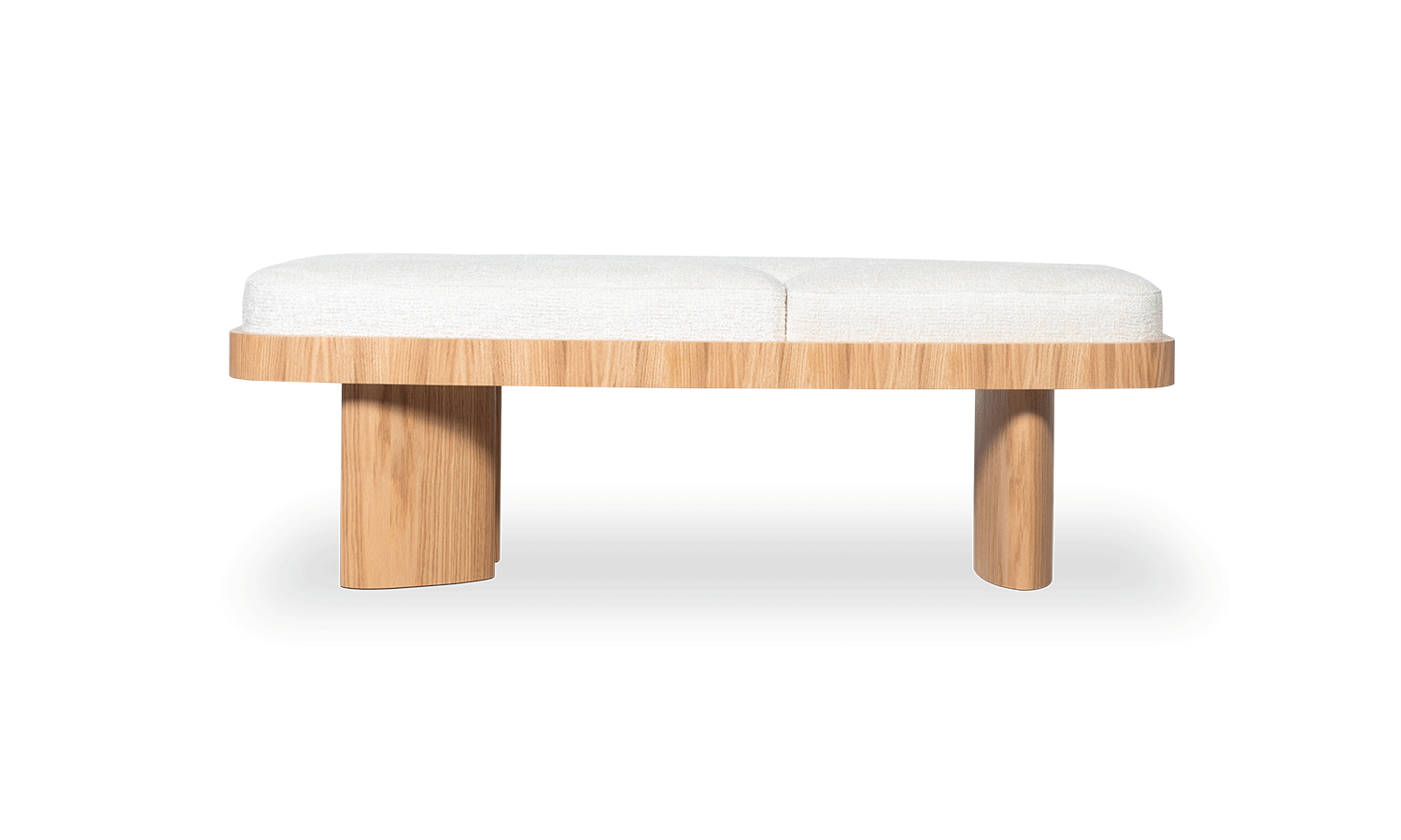 Showcasing solidity and strength, the Selma bench walks the line between symmetry and asymmetry. Its symmetrical,rounded rectangular shape combines perfectly with an upholstered top in three parts and asymmetrical legs of of different sizes.