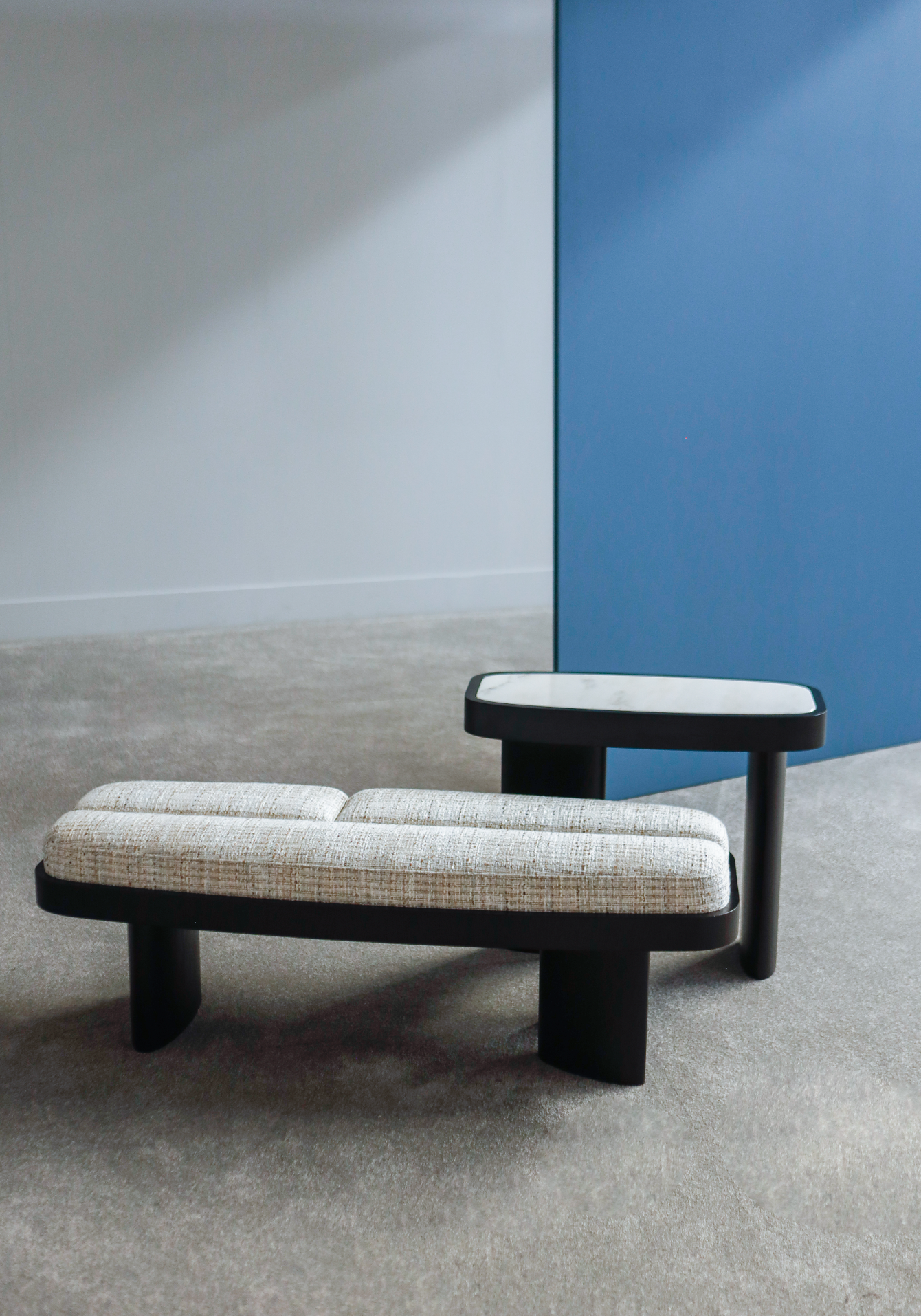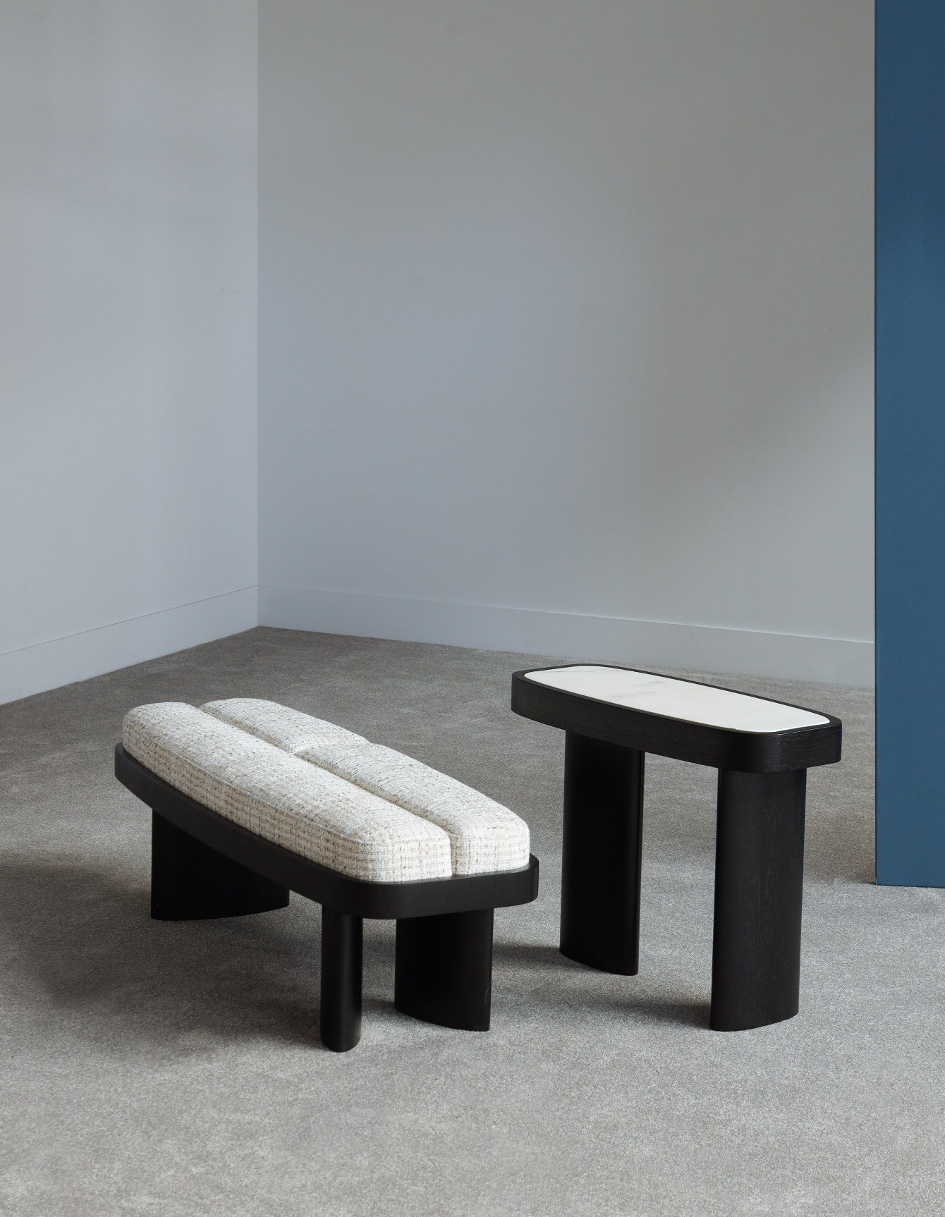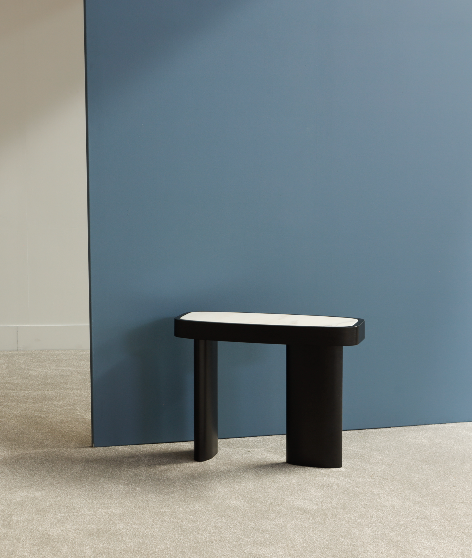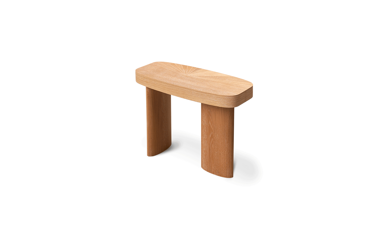 Showcasing solidity and strength, this table walks the line between symmetry and asymmetry. Its symmetrical top in a rounded rectangular shape is offset by an asymmetrical partial sunburst veneer pattern as well as asymmetrically placed and differently sized legs.
