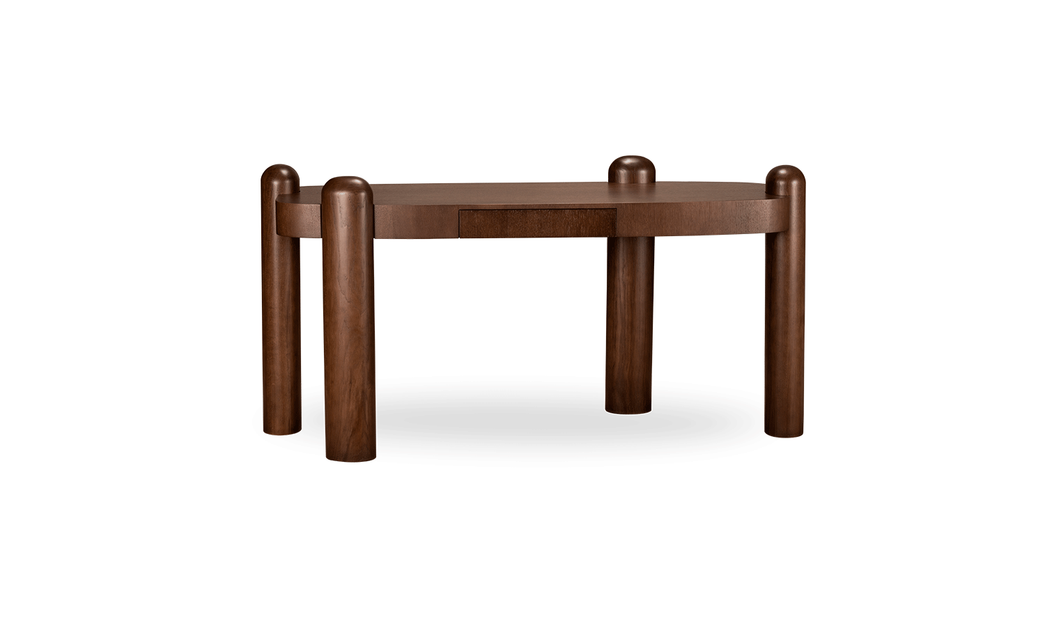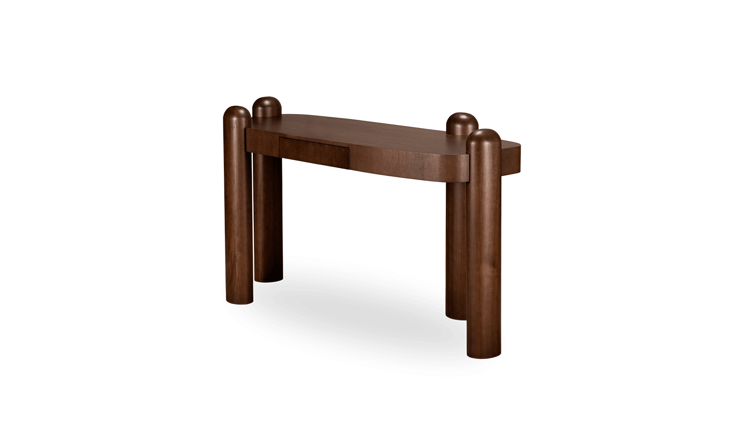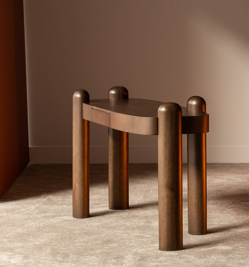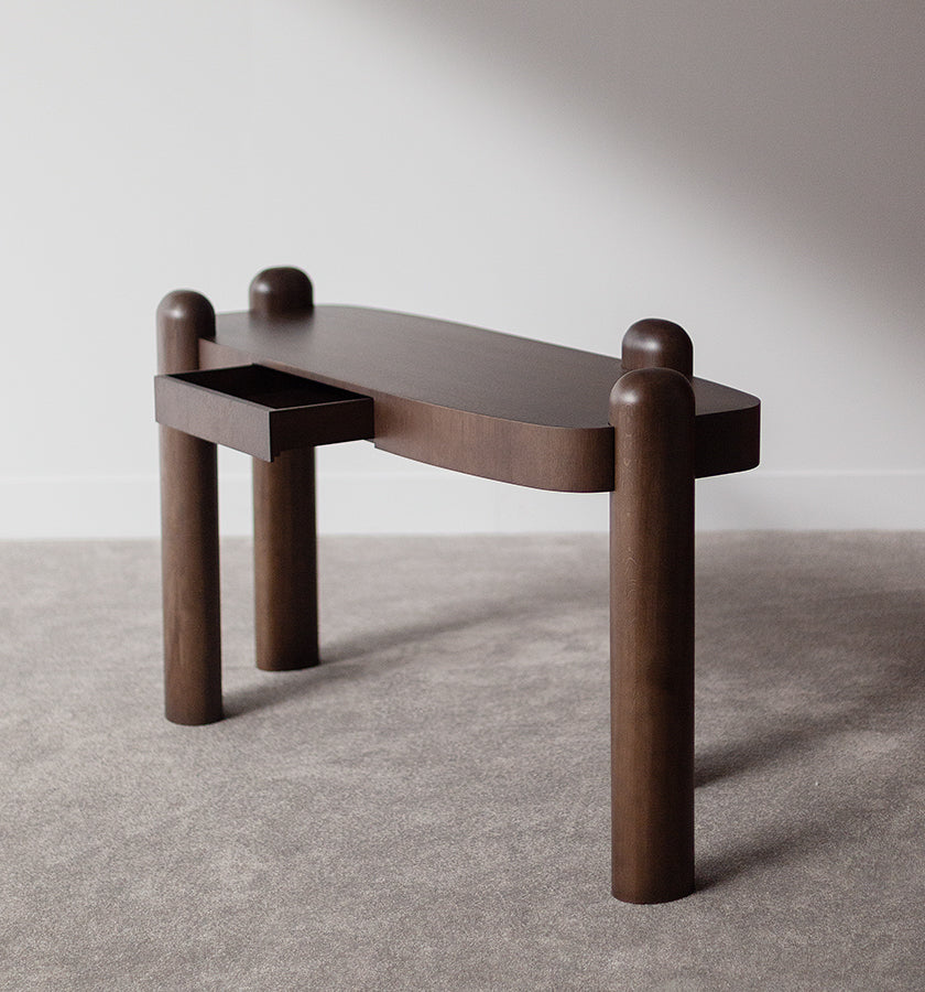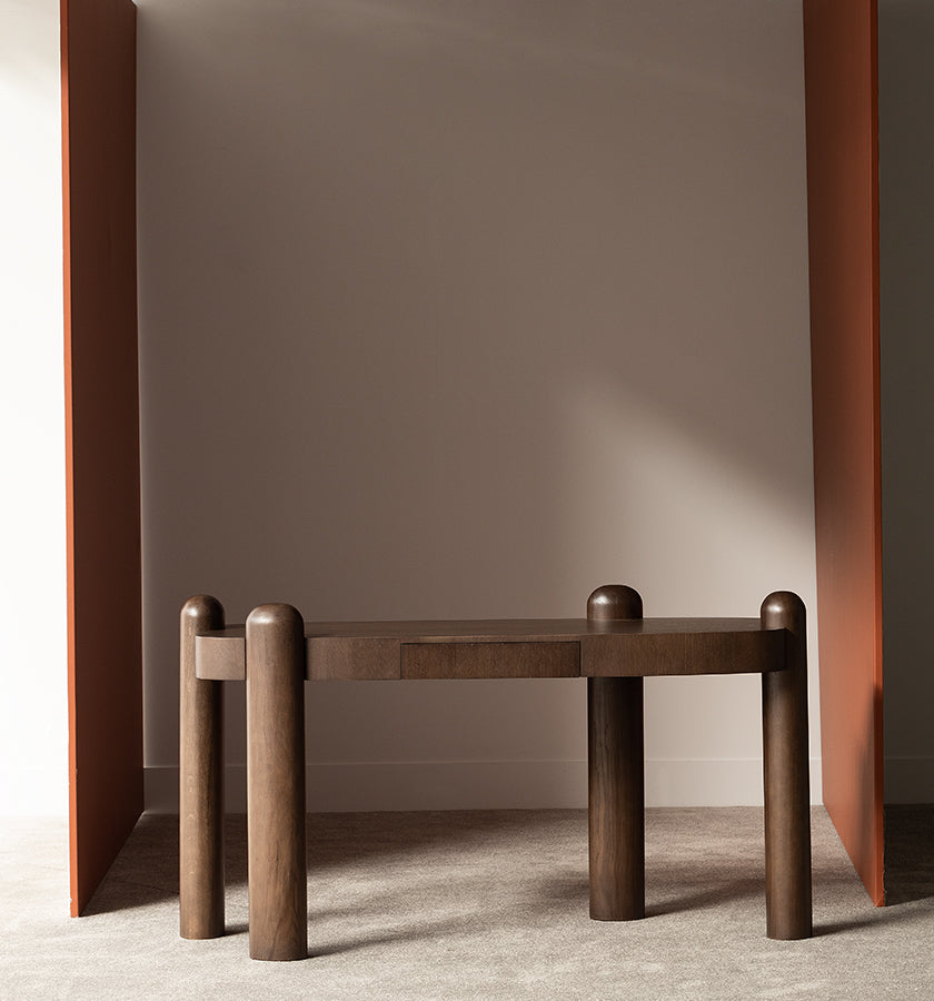 A seven centimetre table top with integrated drawer is suspended by ovalised wooden columns. This desk / consolecombination showcases both strength and balance.