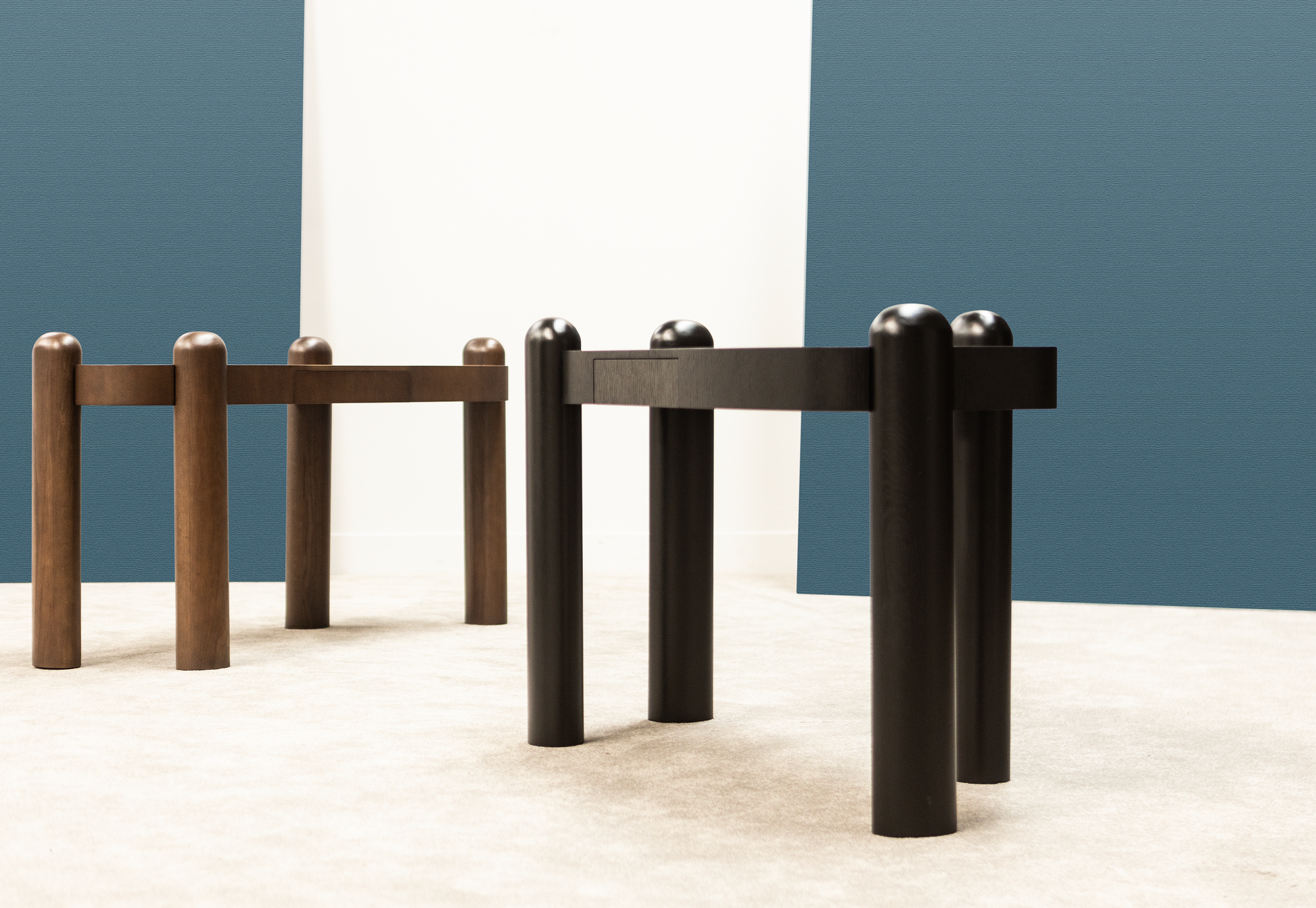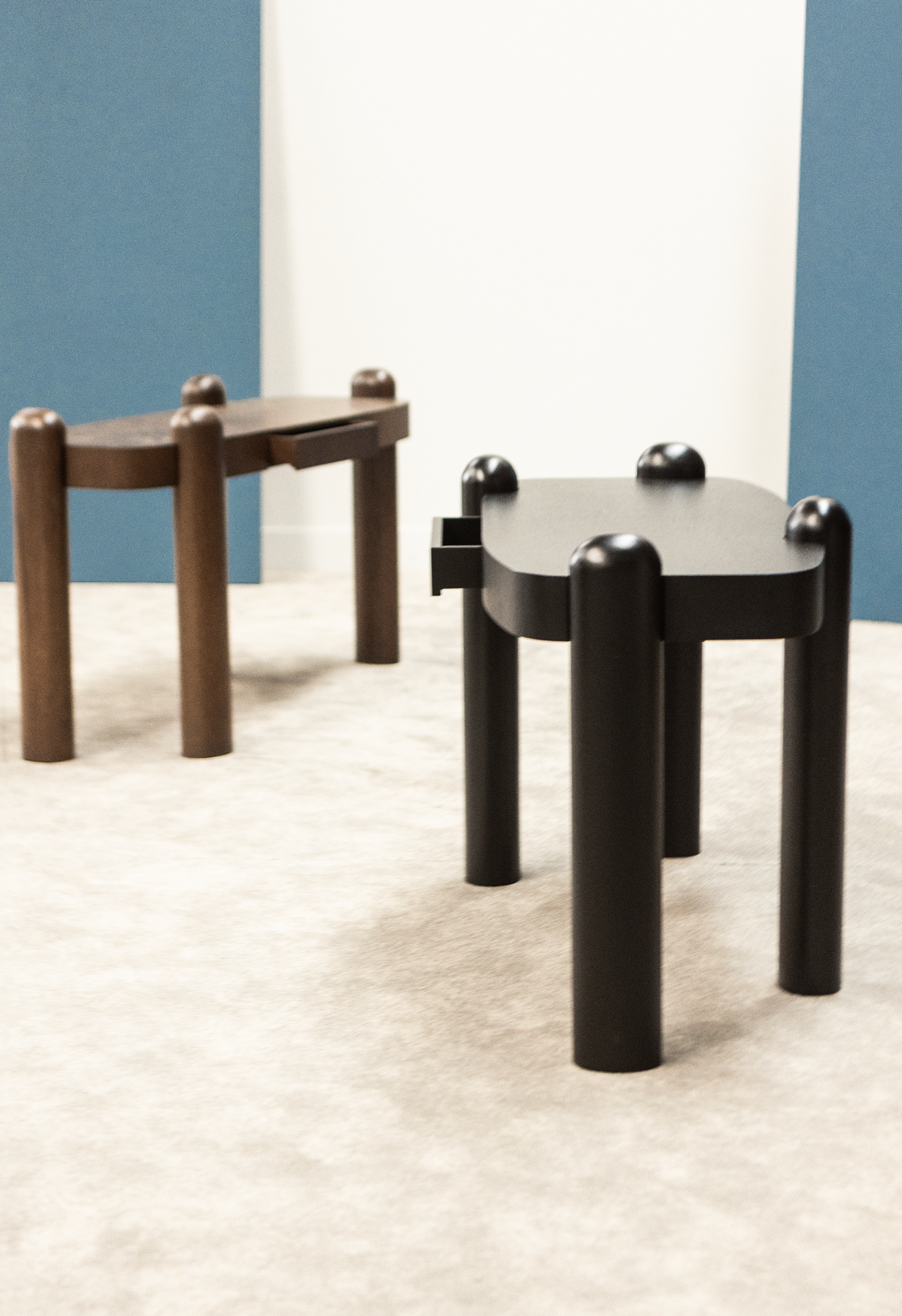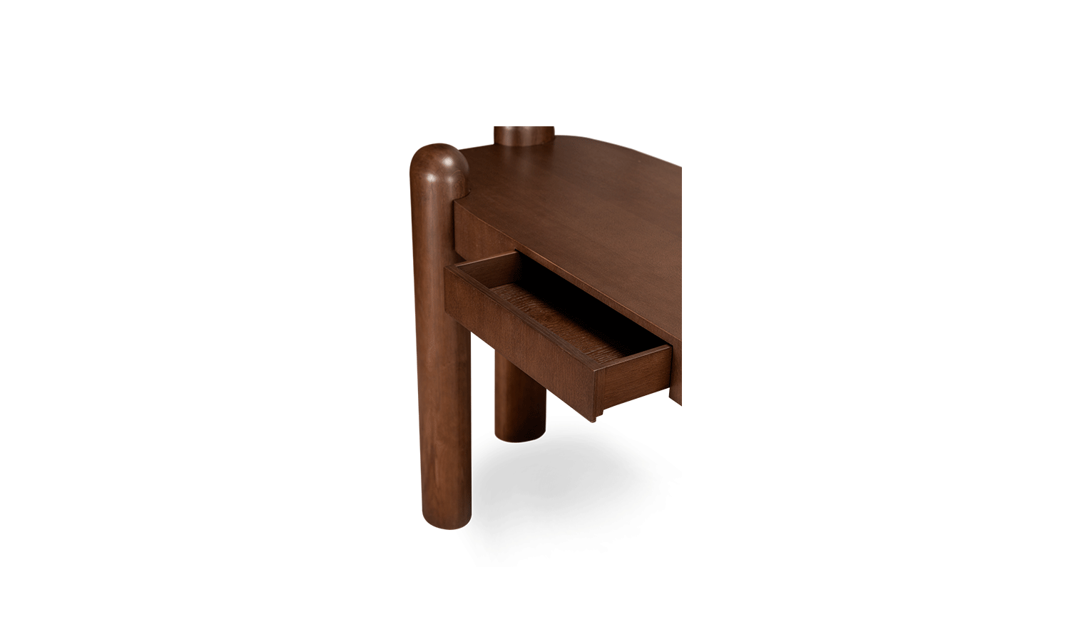 A seven centimetre table top with integrated drawer is suspended by ovalised wooden columns. This desk / consolecombination showcases both strength and balance.