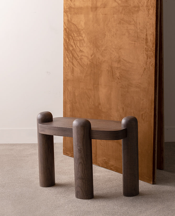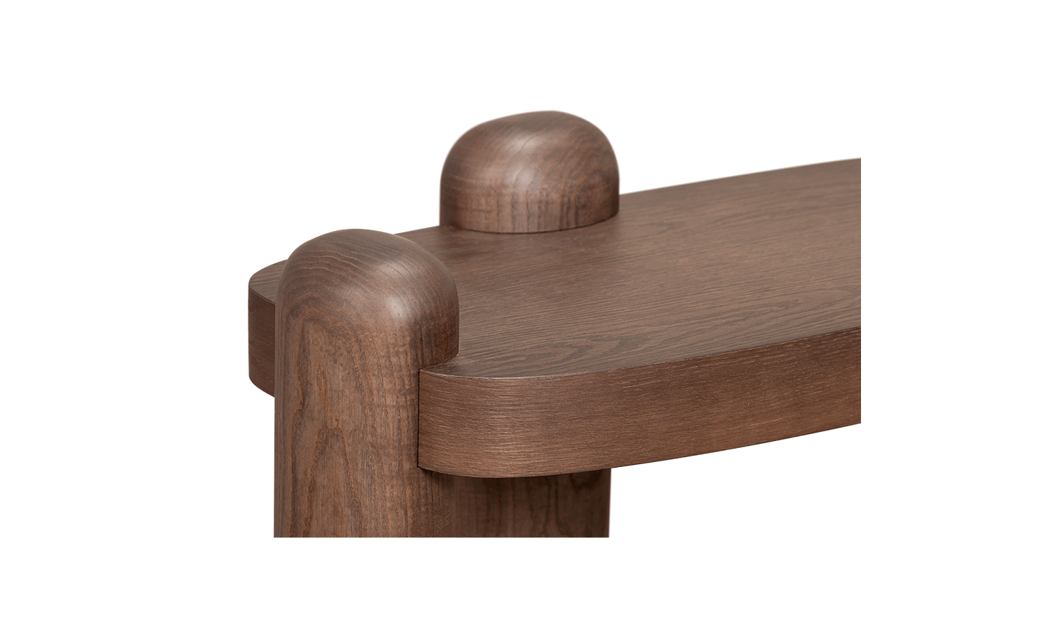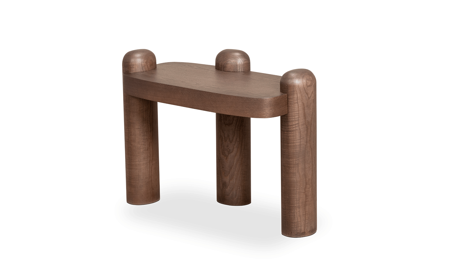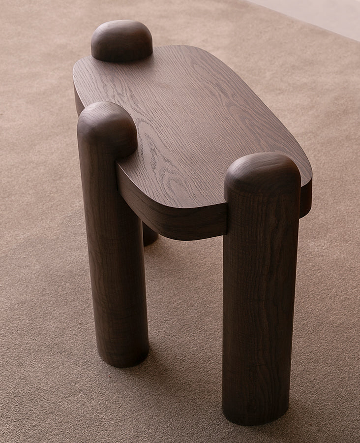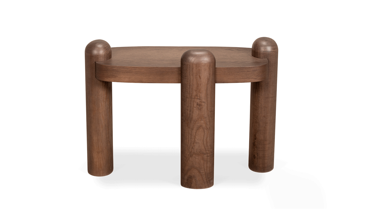 A seven centimetre table top is suspended by ovalised wooden columns. This coffee and side table combination showcases both strength and balance.