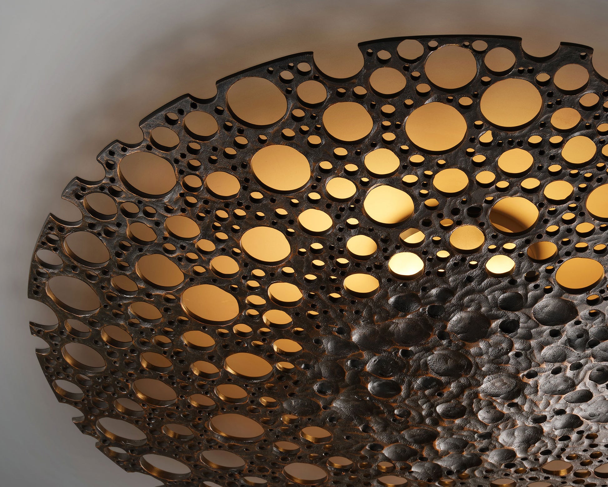 The Shield Flush Mount casting is made of solid brass. Its body has been cast from a master carving using the investment cast process. The ceiling plate and stem have been machined by hand. All parts are hand polished and patina’d. The diffuser is borosilicate glass that is bead blasted.